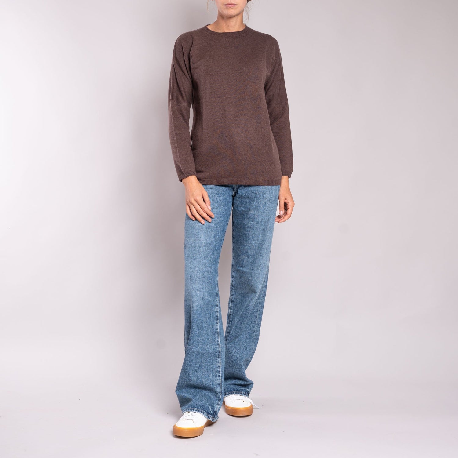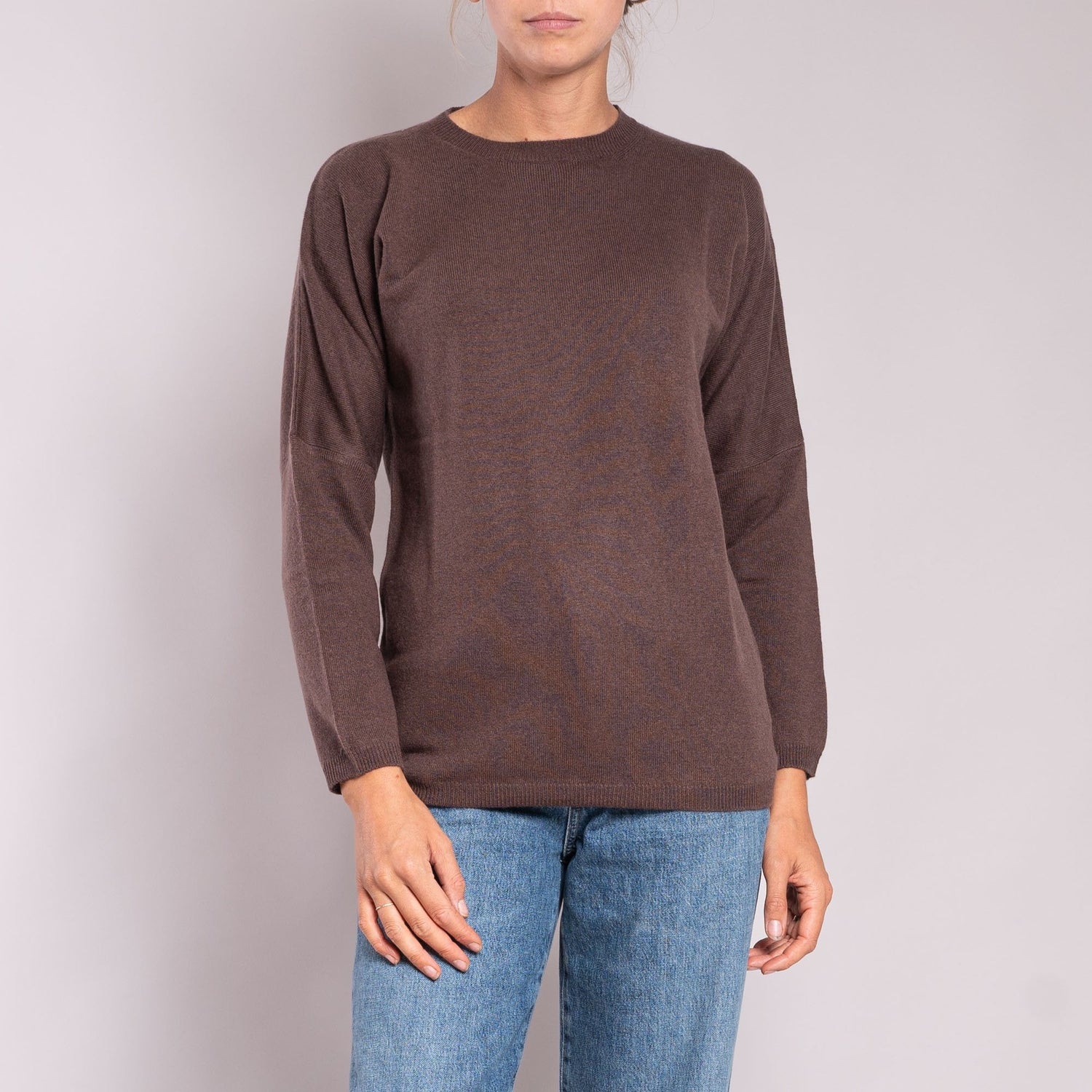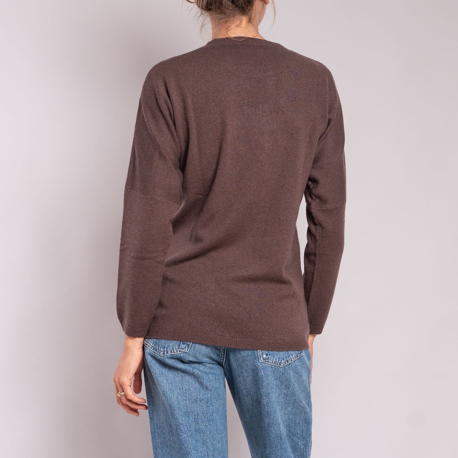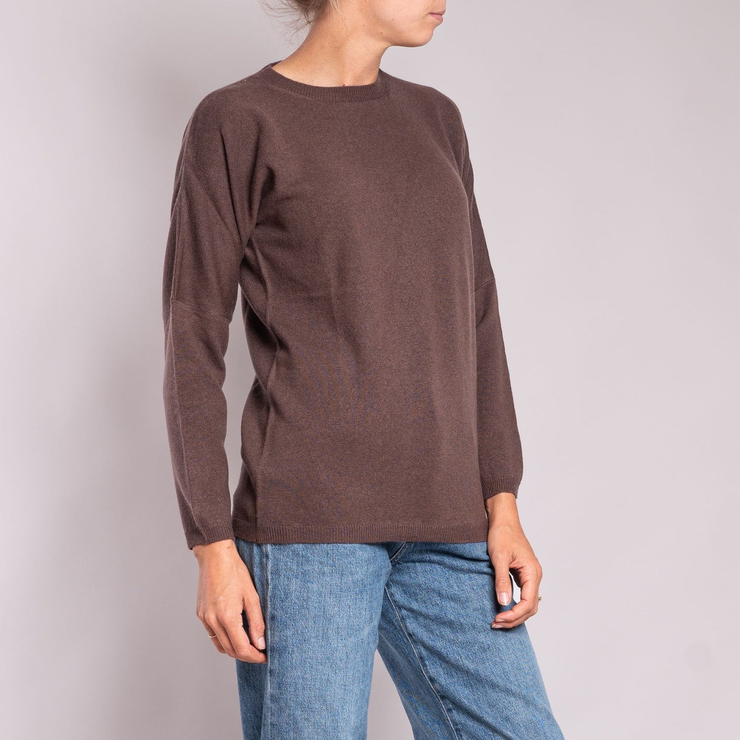 This chocolate coloured jumper is a mix of premium cashmere and premium wool. These jumpers hang loosely on the figure with drop shoulders and long sleeves making this a super comfy and relaxed fit.