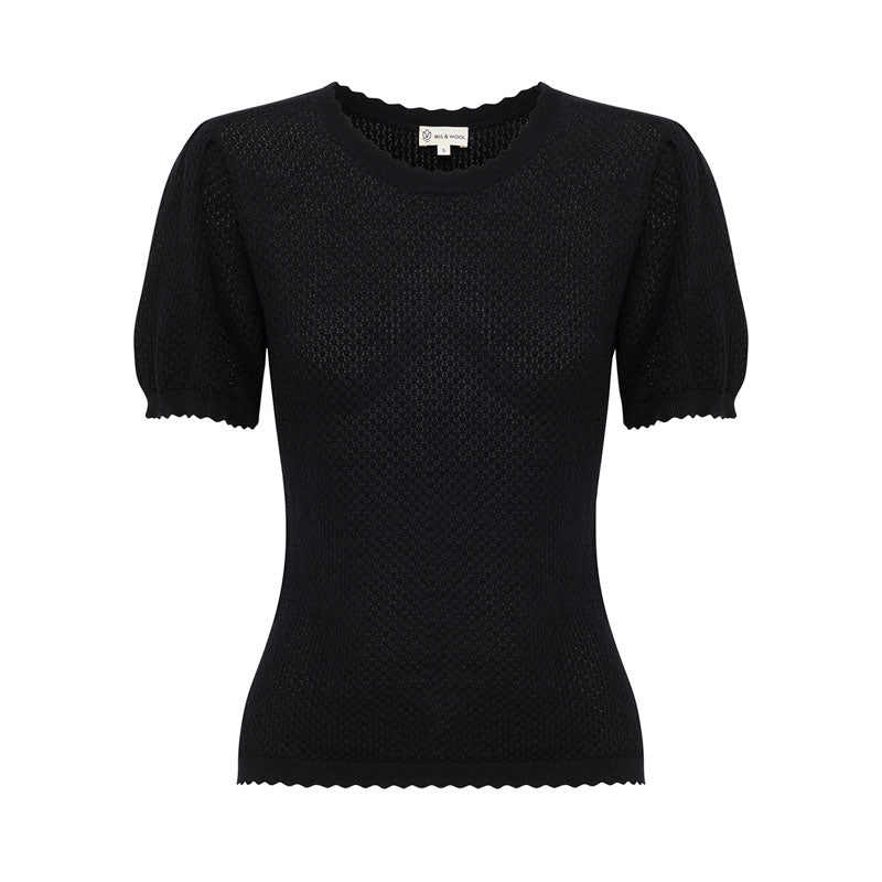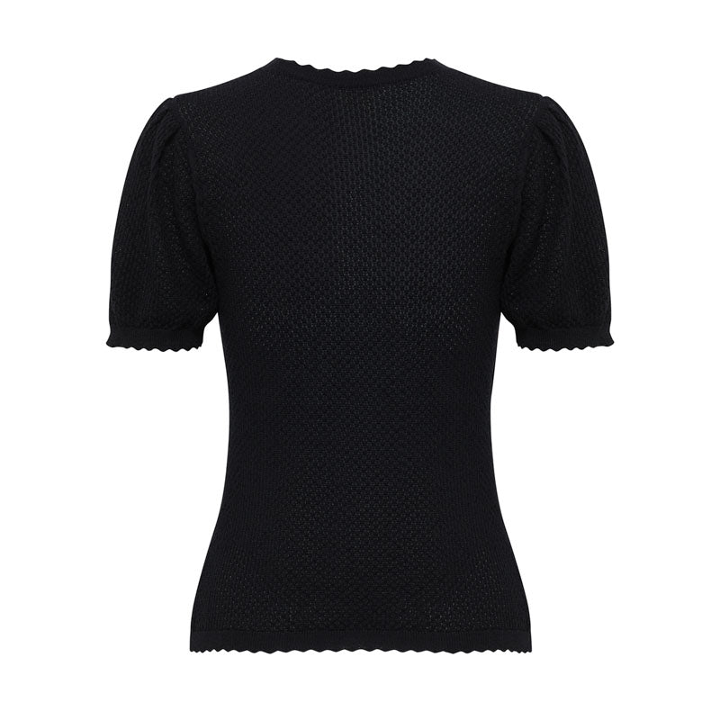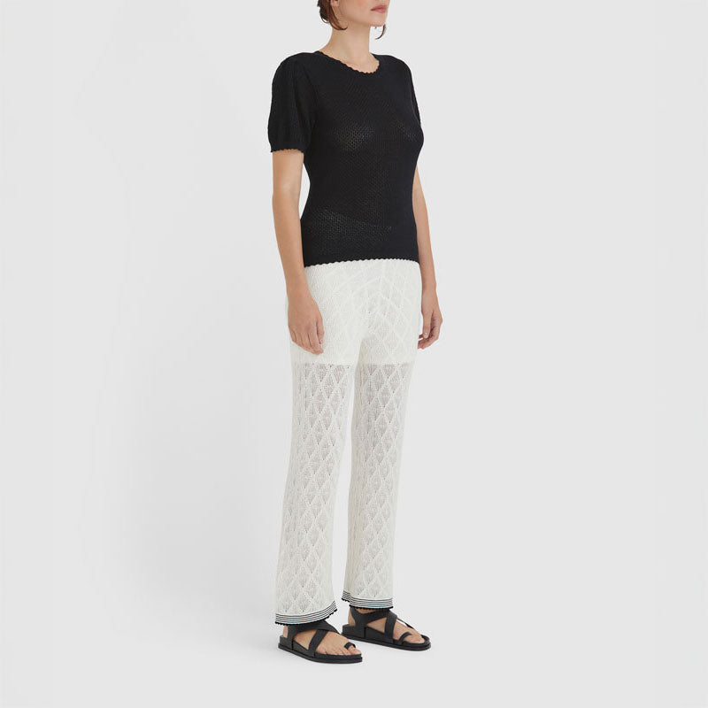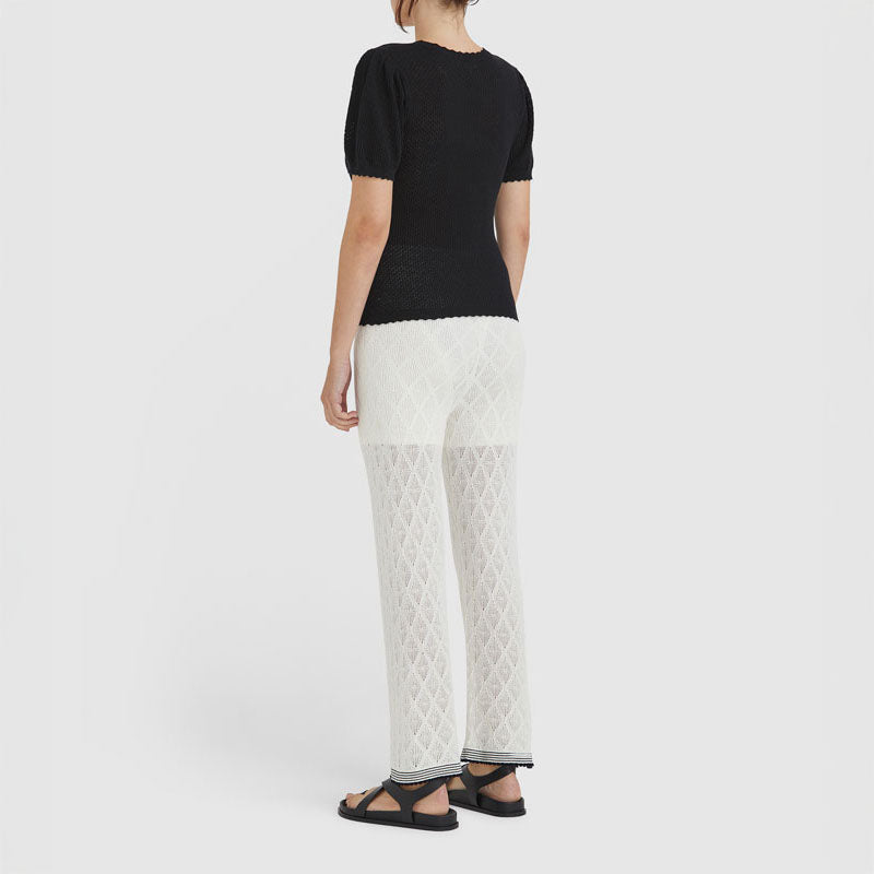 The Ruby Pointelle Top in black offers timeless sophistication, crafted from a luxurious merino wool and cotton blend for a soft and comfortable feel. With its classic crew neckline, intricate pointelle detailing, and elegant scalloped trims, this womens knitwear top is a versatile wardrobe addition.