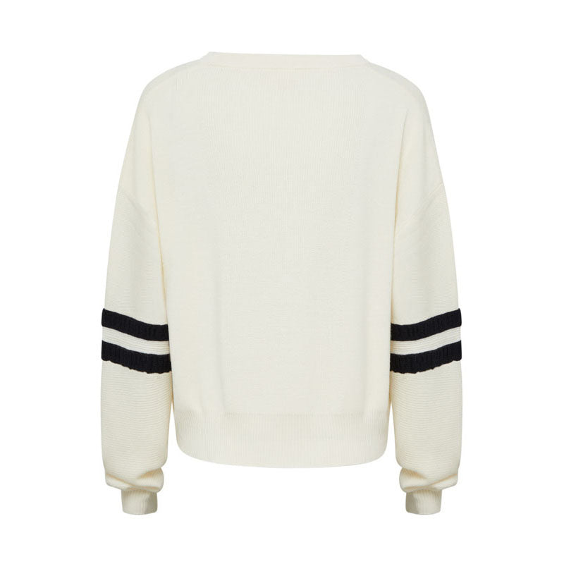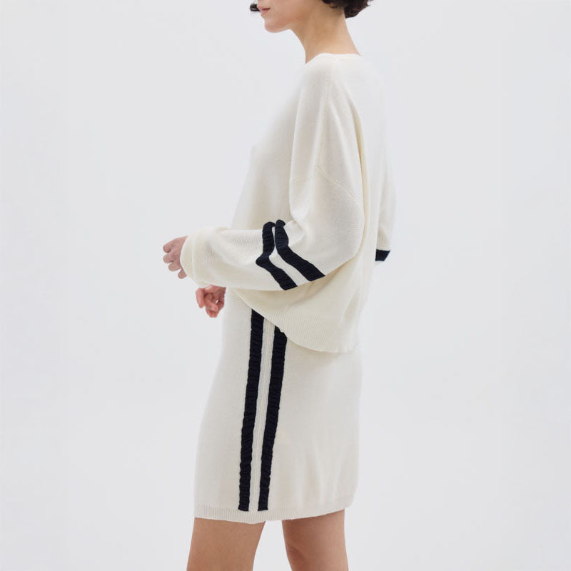 Add a pop of colour to your wardrobe with this neutral cream merino wool sweater, designed for both style and comfort. Featuring bold navy contrast stripes on the sleeves, this piece blends a classic relaxed fit with sporty details.