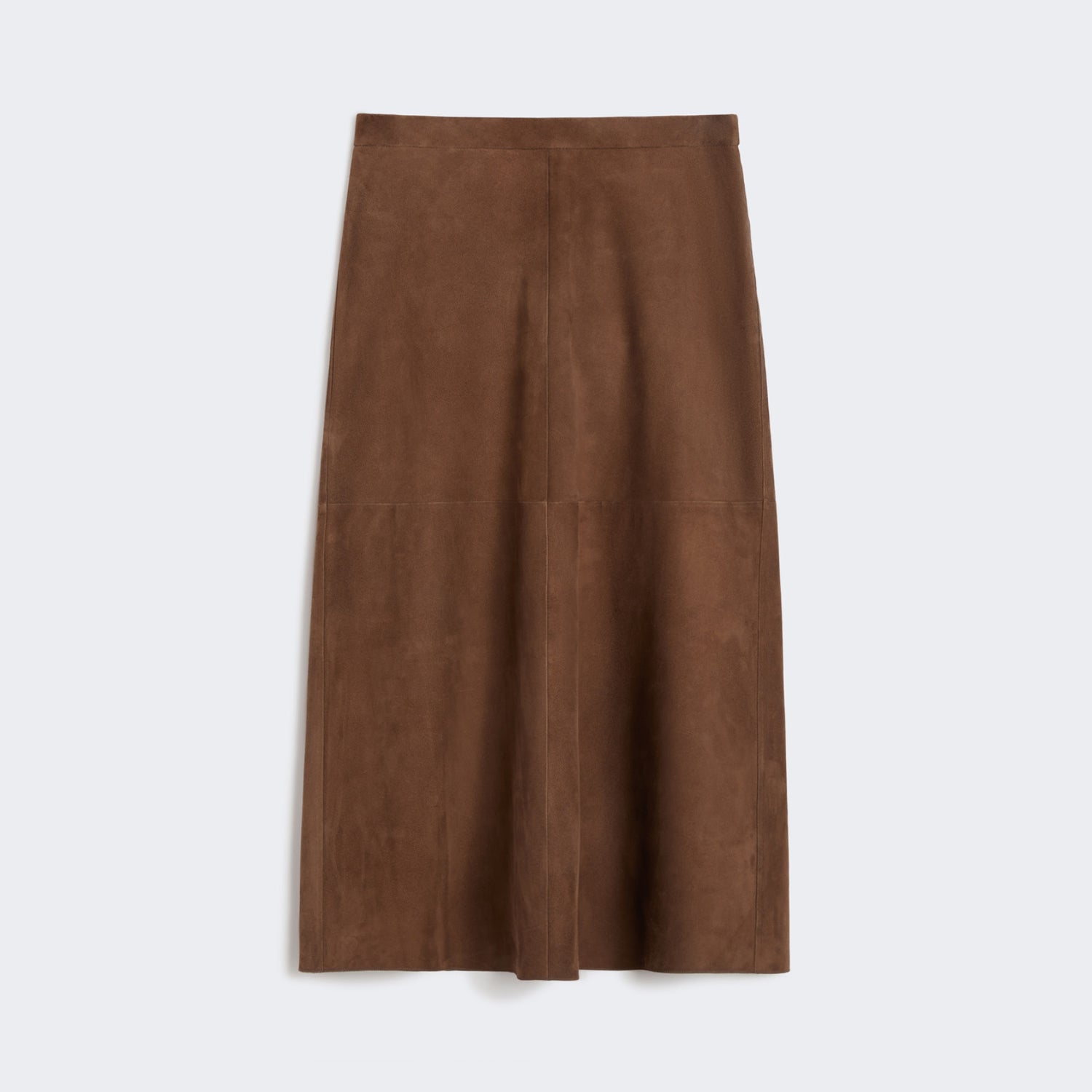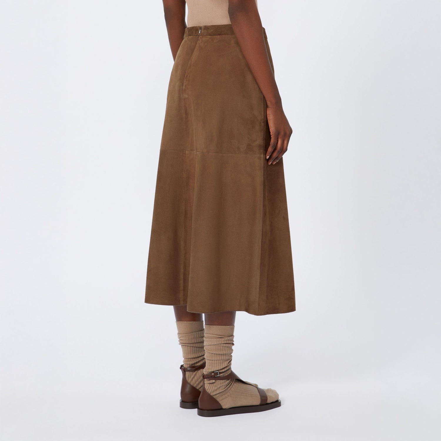 This suede midi skirt blends classic elegance with subtle edge, featuring leather goods-style darts and topstitching for a structured, artisanal touch. Cut in a flared fit with a flattering mid-rise waist, it moves effortlessly with the wearer.