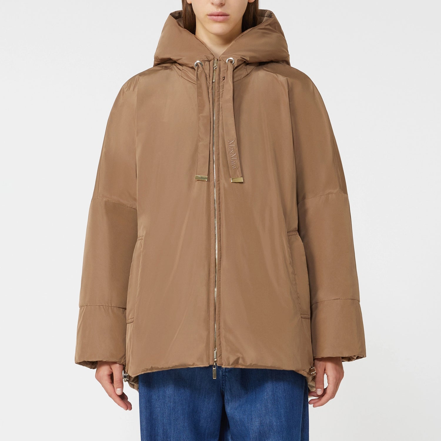 The oversized fit is enhanced by an adjustable drawstring hem, while the drawstring hood, long sleeves, and double slider zip closure ensure comfort and functionality. Finished with welt pockets on both sides and premium goose-down padding, this piece effortlessly blends timeless sophistication with contemporary practicality