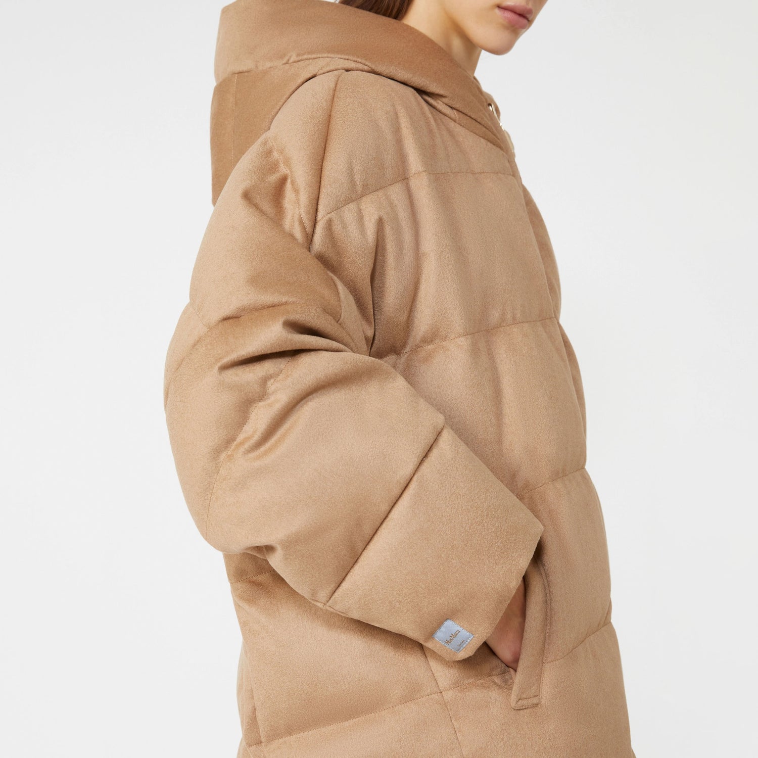 Wrap yourself in luxury and versatility with this reversible down jacket, featuring the Max Mara logo embroidered inside the yoke. Expertly crafted from pure camel zibeline drap and quilted in elegant stripes, it reverses to a smooth, water-repellent taffeta lining for adaptable styling and protection.