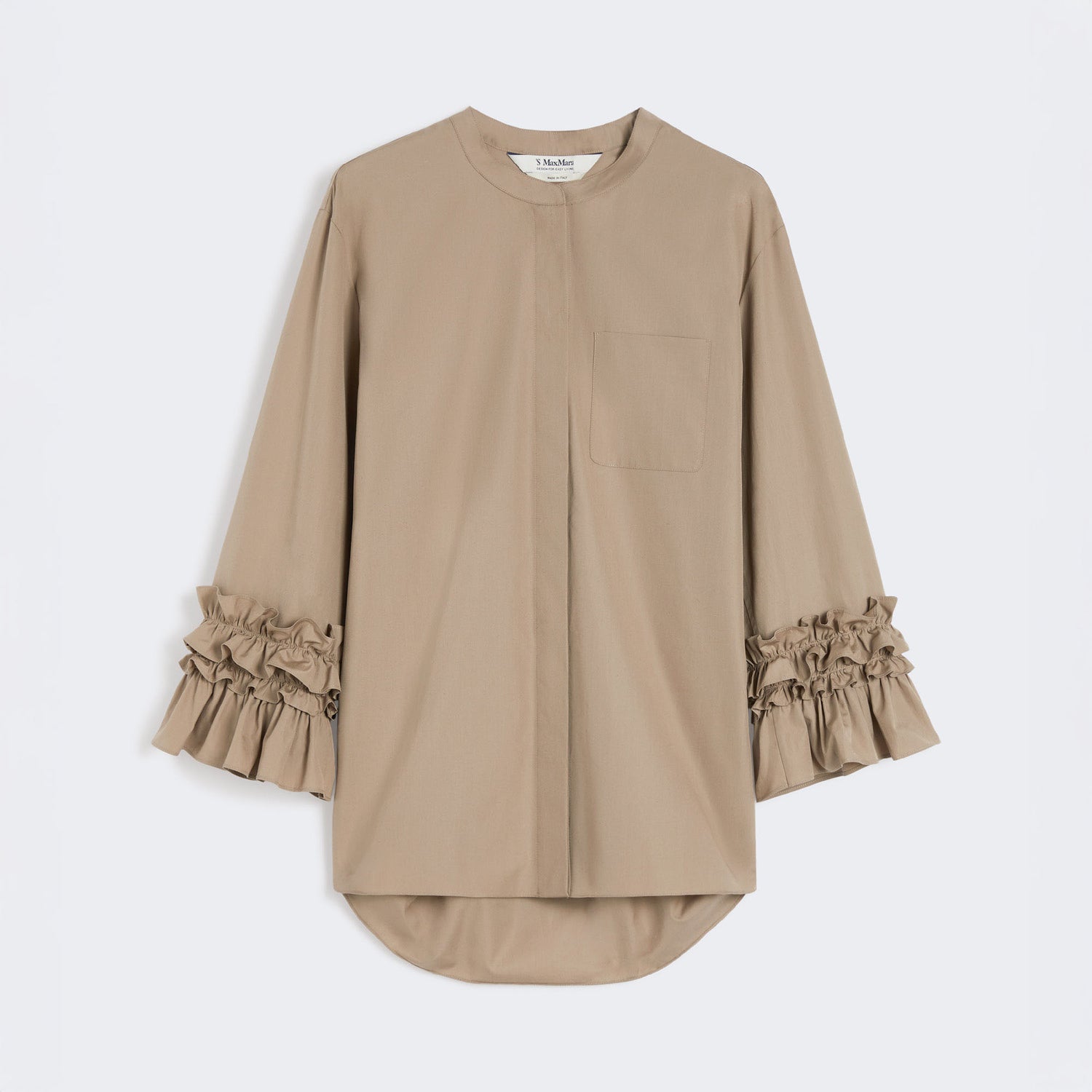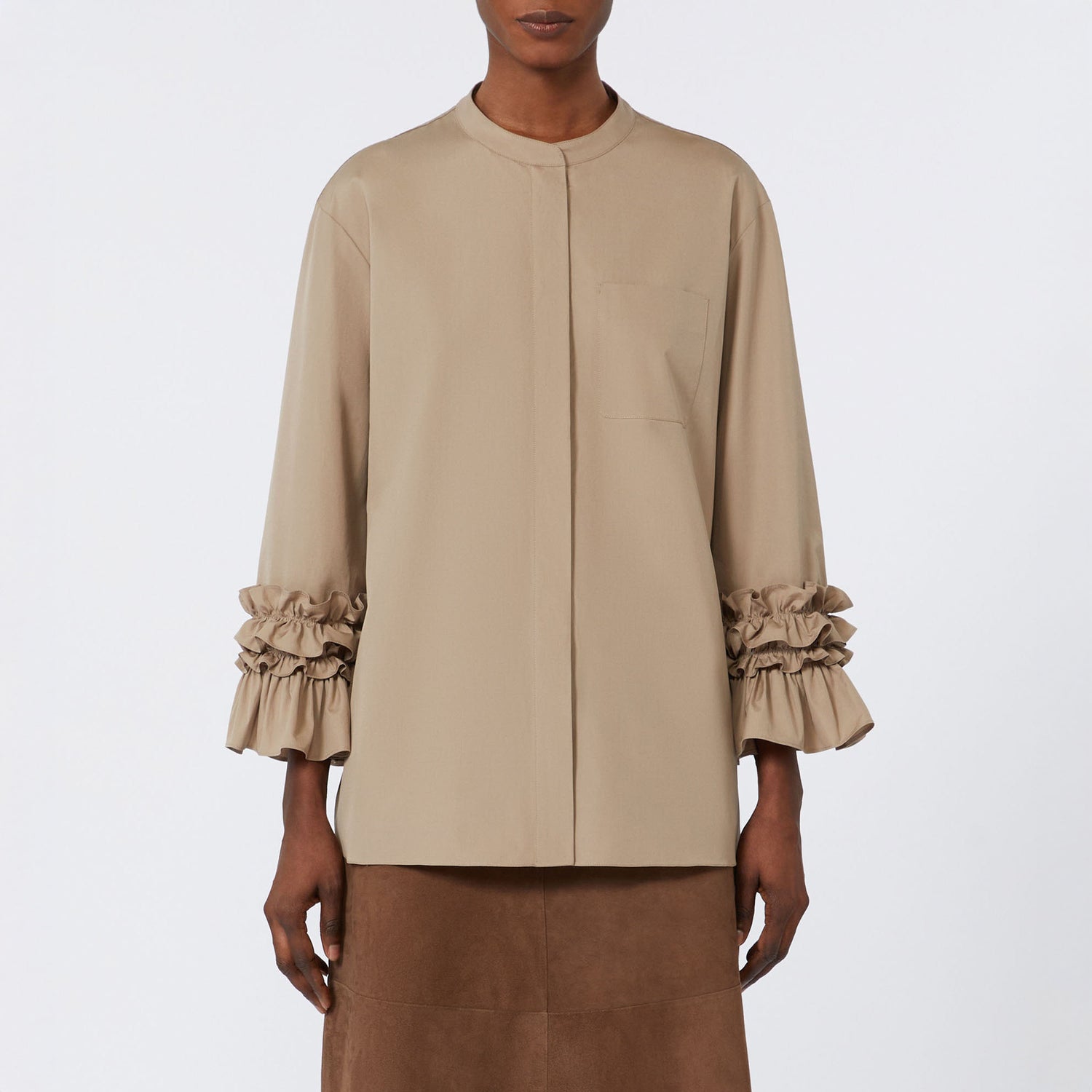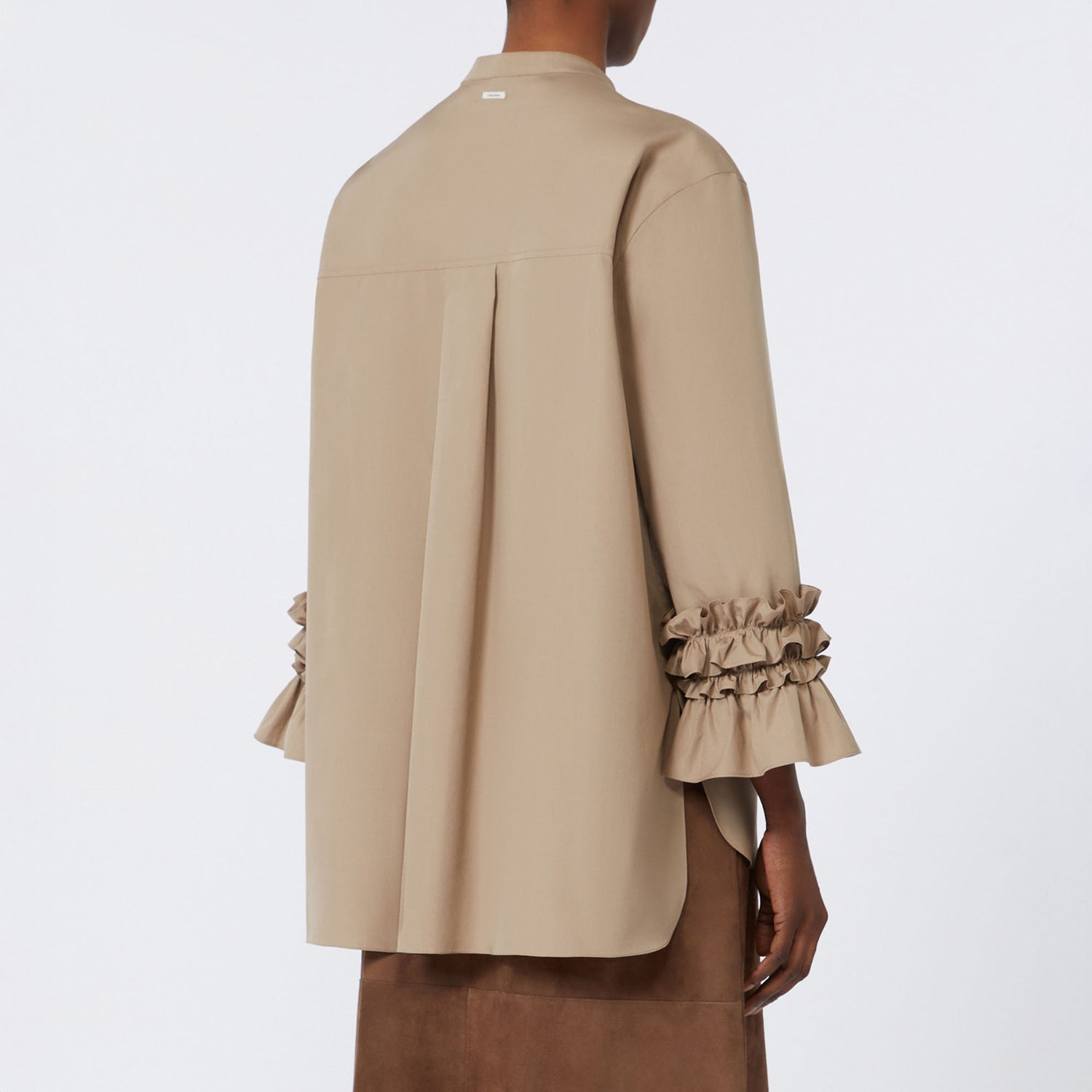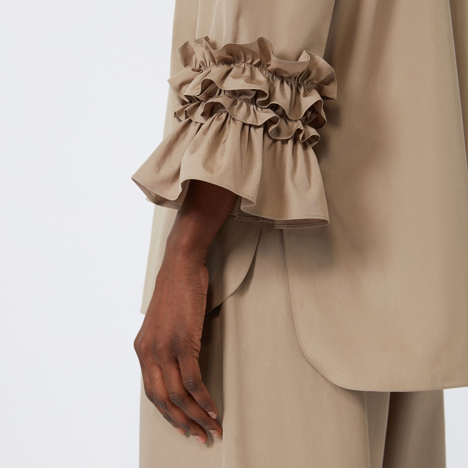 Effortlessly feminine with a touch of structure, this flared shirt is crafted from washed pure cotton poplin for a crisp yet soft feel. Fabric ruffles trim the sleeve cuffs, adding subtle volume and charm. It features a mandarin collar and long set-in sleeves, with a concealed front button placket for a clean, streamlined finish.