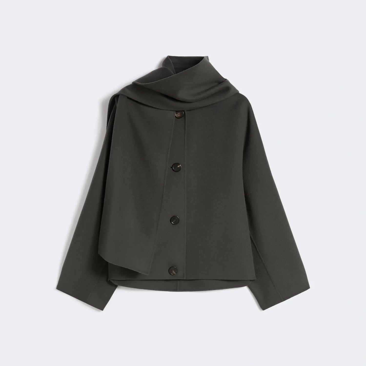 Paired with a wide, enveloping scarf in matching fabric, this piece offers effortless versatility and timeless style