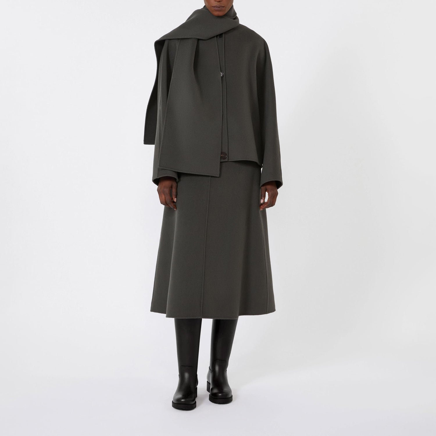 Paired with a wide, enveloping scarf in matching fabric, this piece offers effortless versatility and timeless style