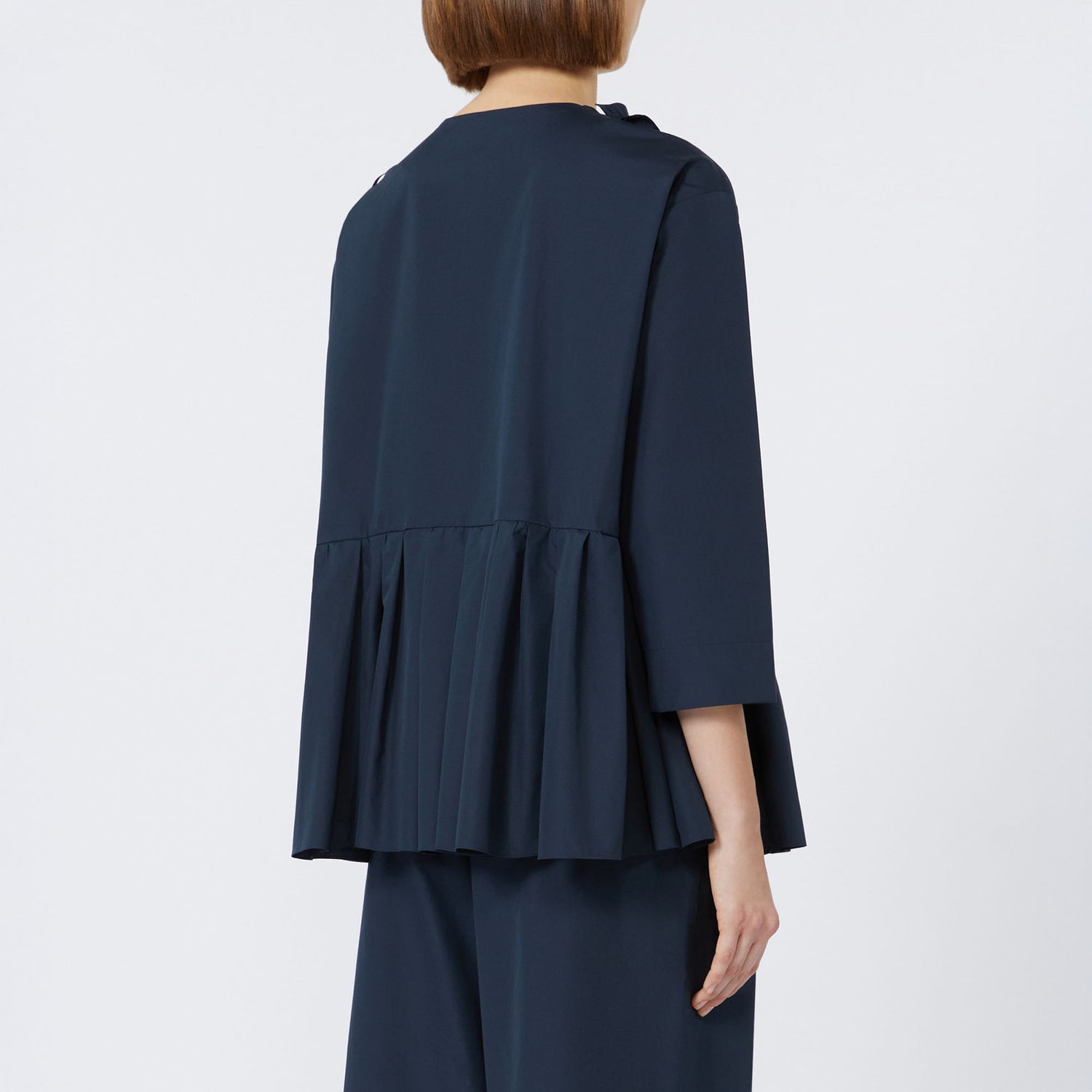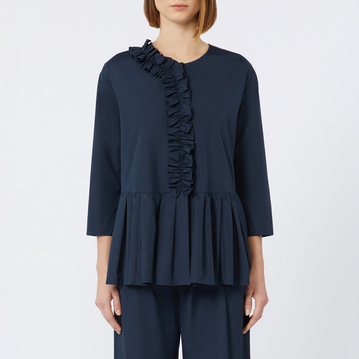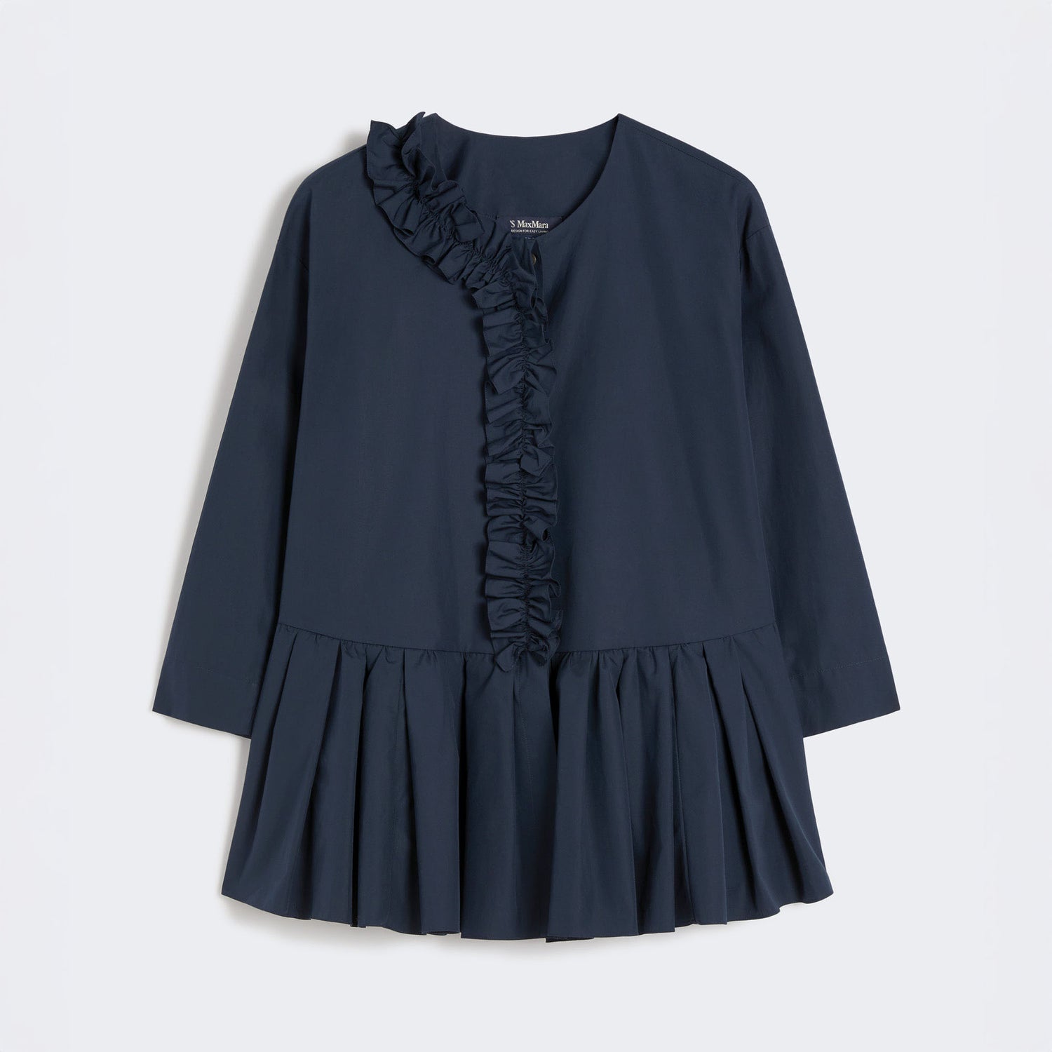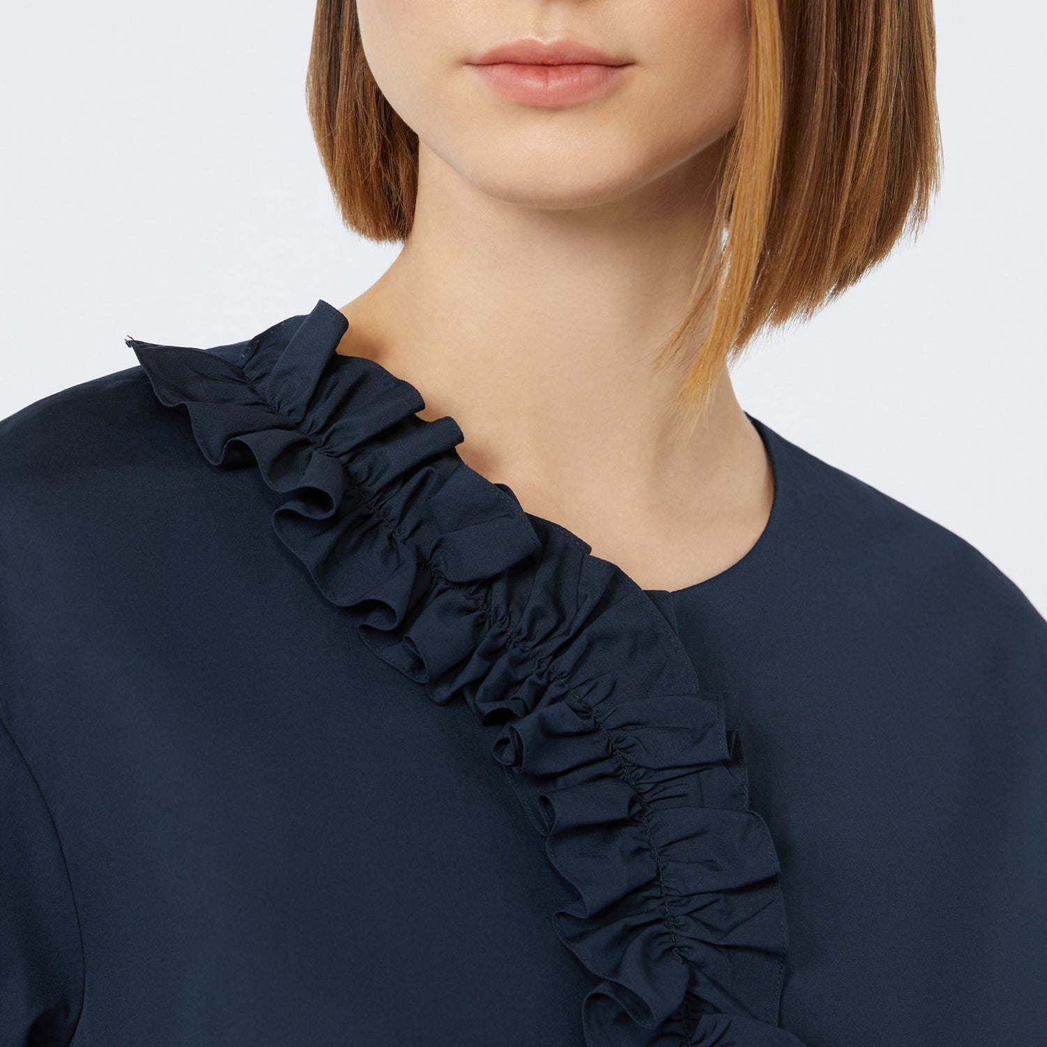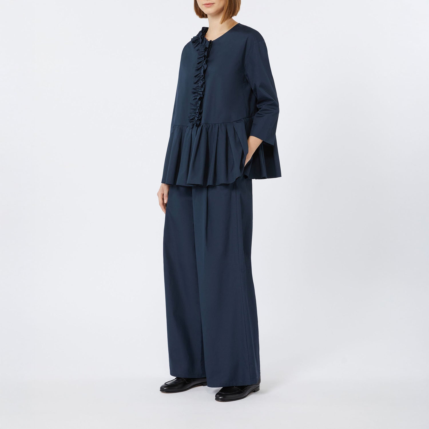 Crafted from washed pure cotton poplin, this shirt features a flared silhouette elevated by a wide pleated flounce at the hem. The crew neckline and three-quarter sleeves with dropped shoulders create a relaxed, contemporary shape, while subtle slits at the cuffs add a refined detail. Asymmetric ruffles cascade across the front, bringing dynamic movement and soft volume. A concealed mother-of-pearl button fastening completes the look with understated elegance.