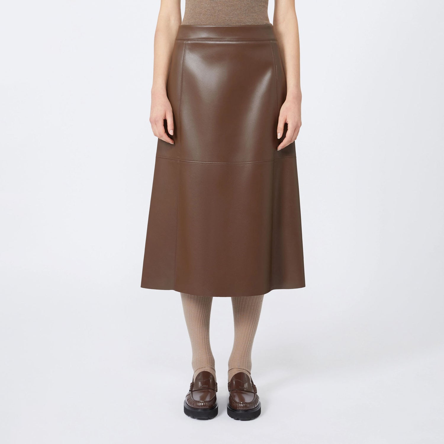 his midi skirt is crafted from a soft coated fabric, offering a sleek, leather-inspired finish. Designed with leather goods-style darts and topstitching, it highlights refined craftsmanship and a structured silhouette.