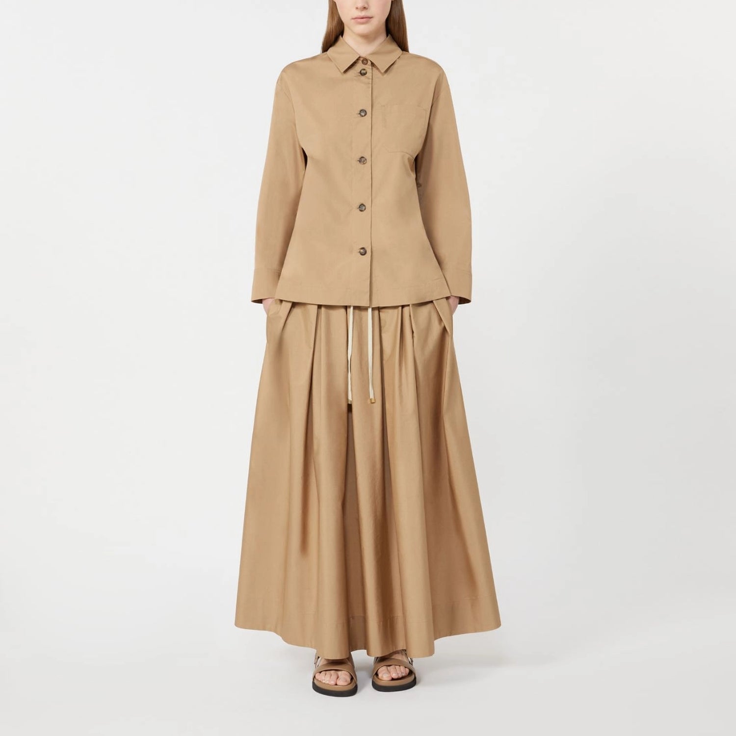 Effortless movement meets timeless style in this long A-line skirt crafted from pure cotton poplin. Designed with full volume and a flared hem, it creates a flowing, graceful silhouette that’s perfect for both casual and elevated looks.