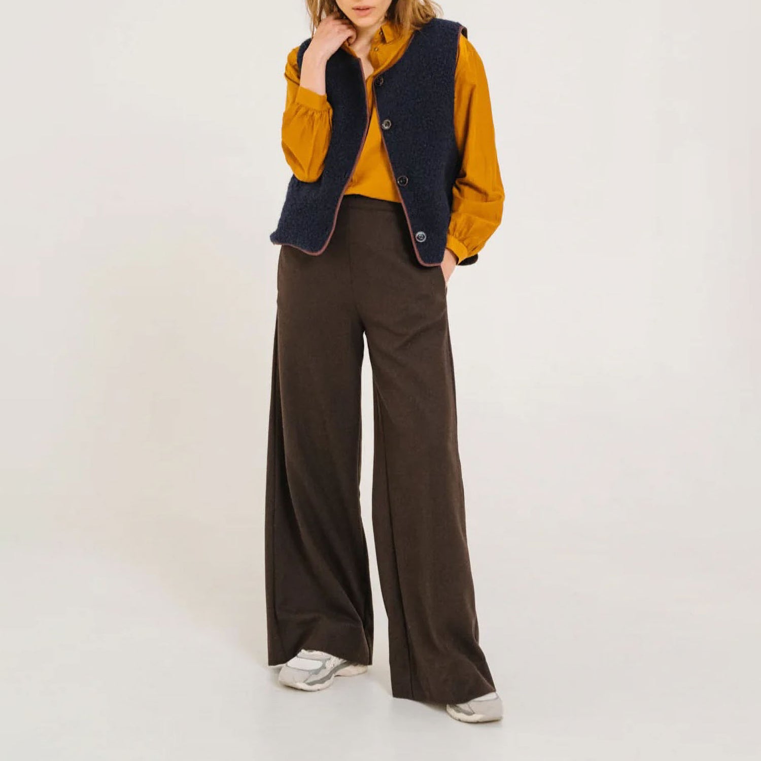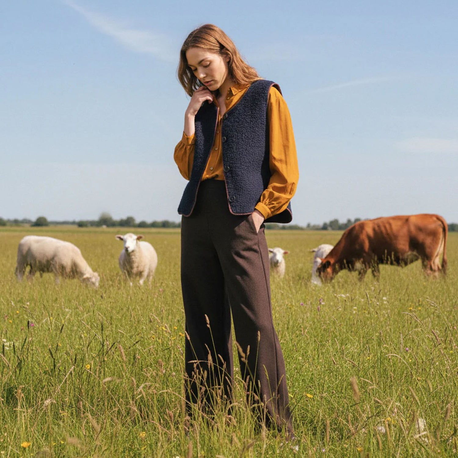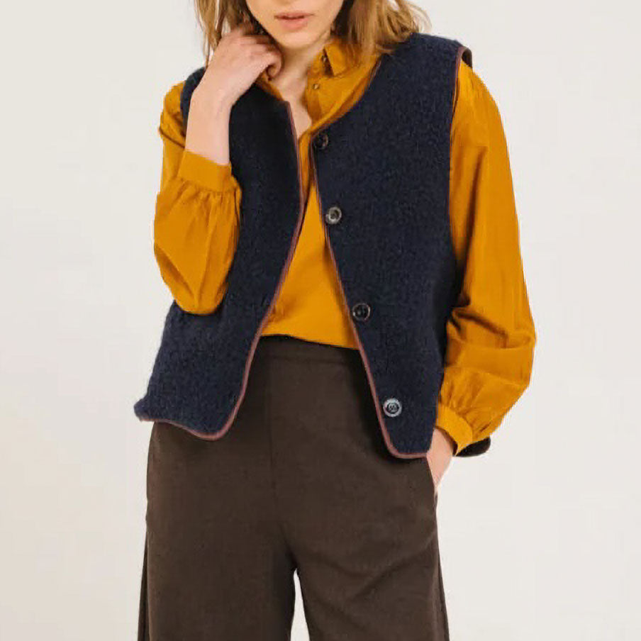 A sleeveless waistcoat in navy blue looped wool, fully lined for a comfortable, structured fit. It features a round neckline, discreet seam pockets and contrasting striped trim for a clean, graphic touch. Finished with a visible tone-on-tone button, it offers a look that is both understated and refined.