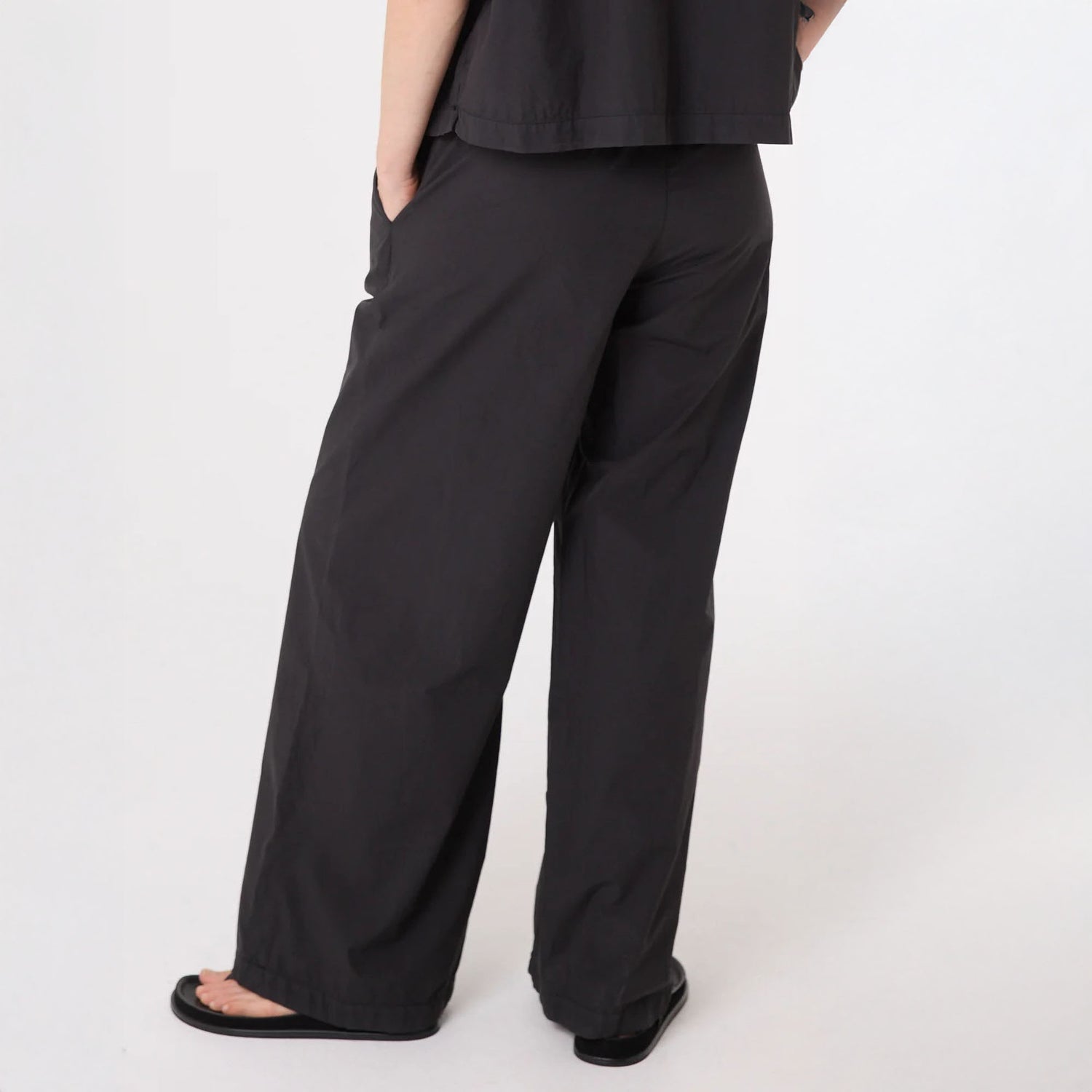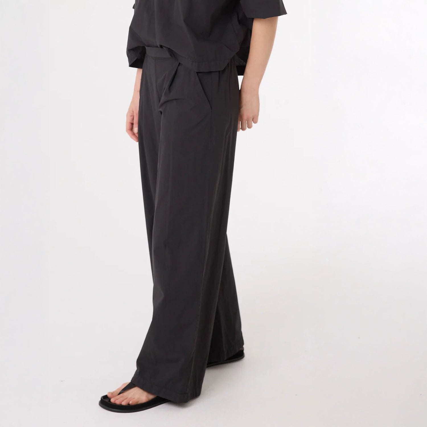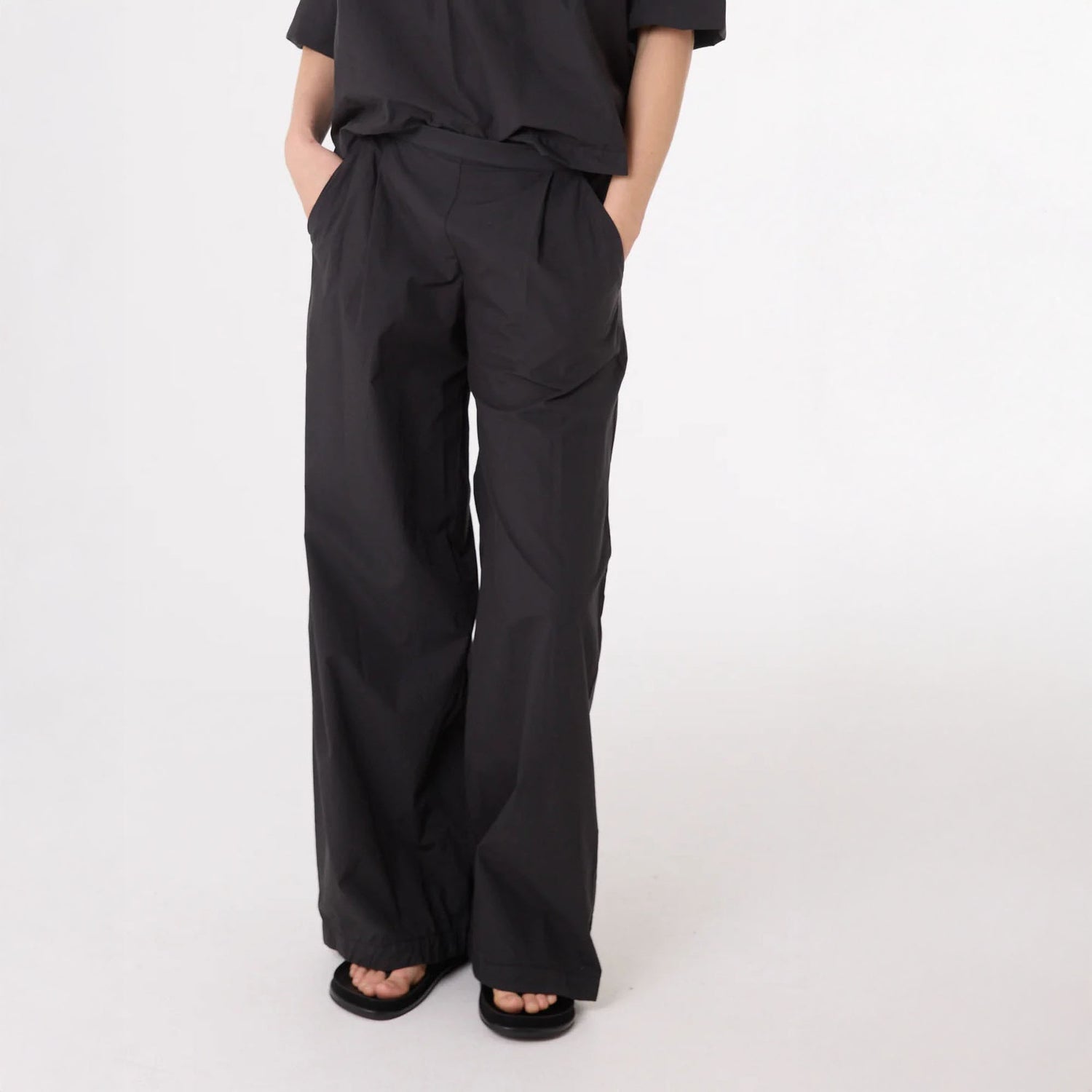 Regular-waisted trousers with a flared leg, made from fine cotton poplin. Their elasticated waistband at the back offers optimal comfort, while their wide pleats at the front and generous hem structure the silhouette. Featuring Italian pockets, they combine elegance and comfort.