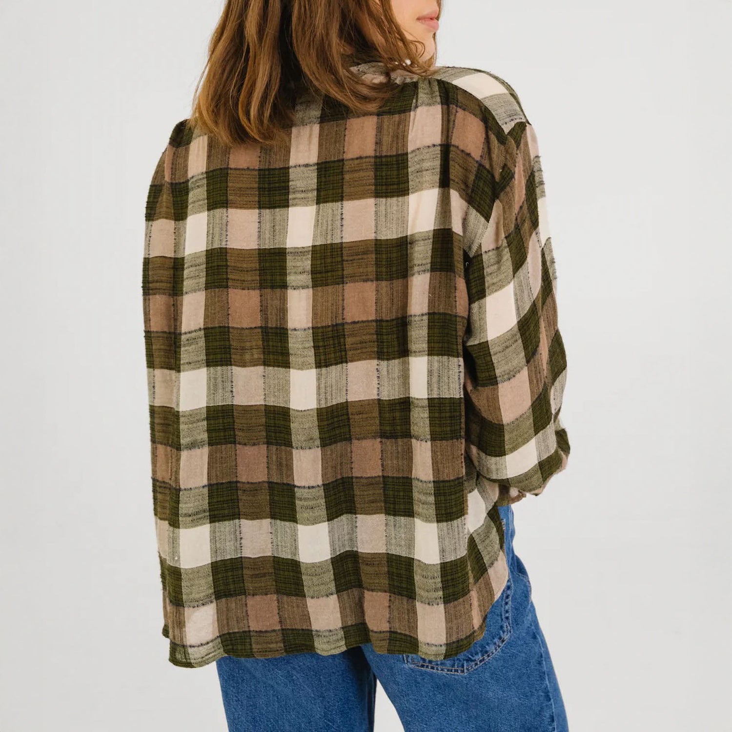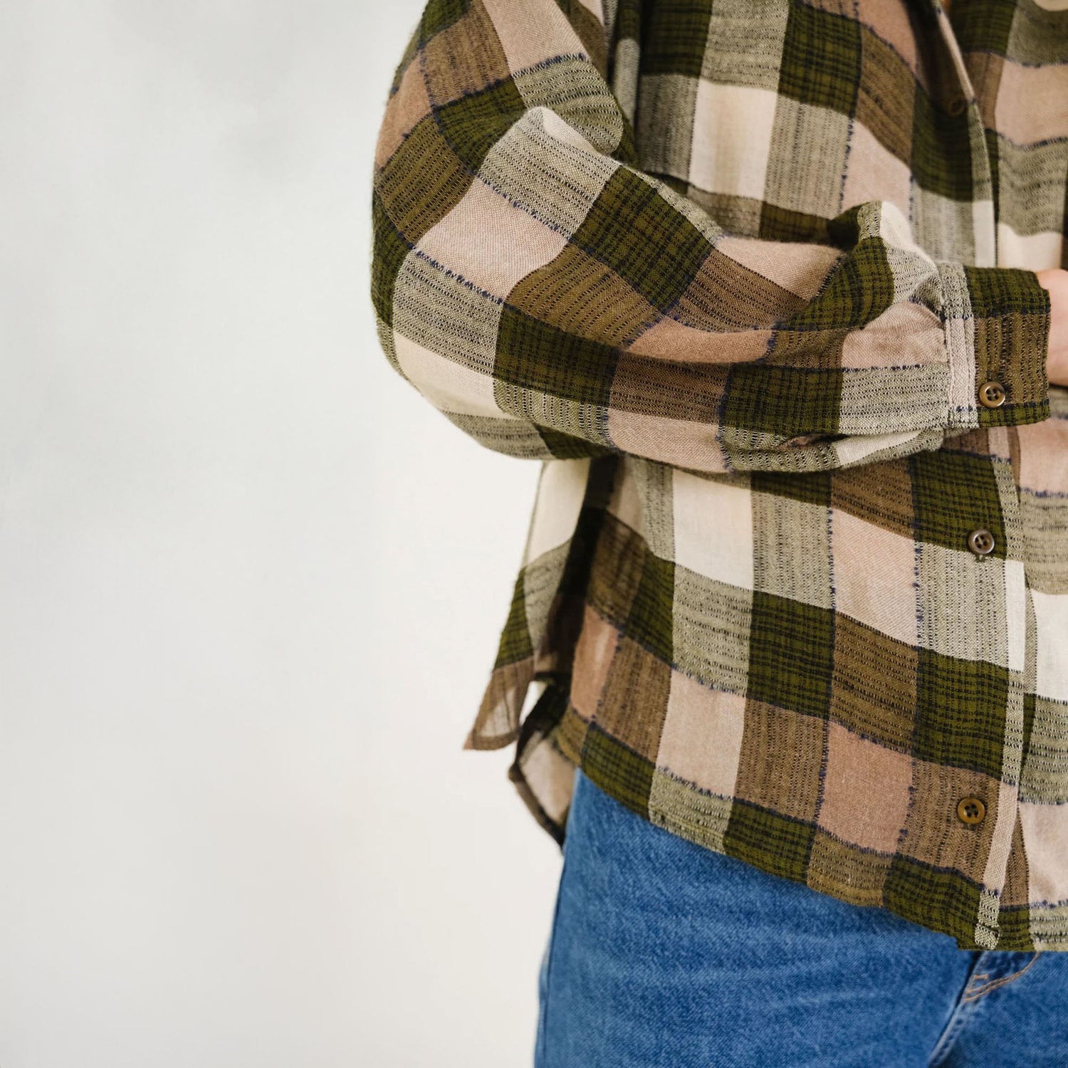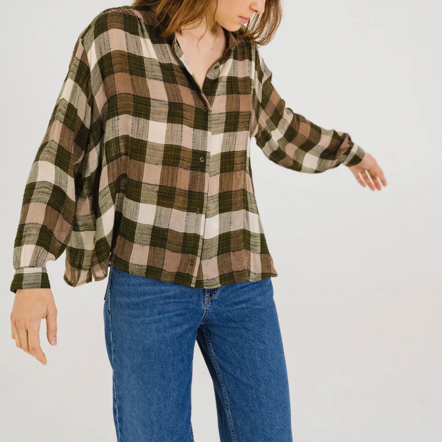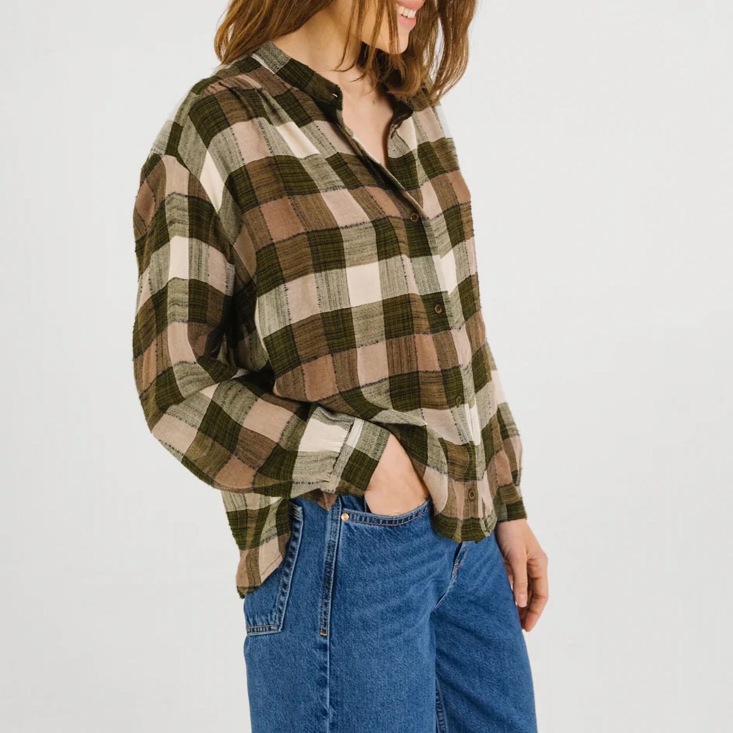 Long-sleeved shirt with large khaki, ecru, and taupe checks, made from cotton and viscose. Inspired by men's shirts, it features a slightly oversized cut with dropped shoulders for a relaxed silhouette. Its classic collar, chest patch pocket, and exposed buttoning give it a timeless touch. Buttoned cuffs finish.