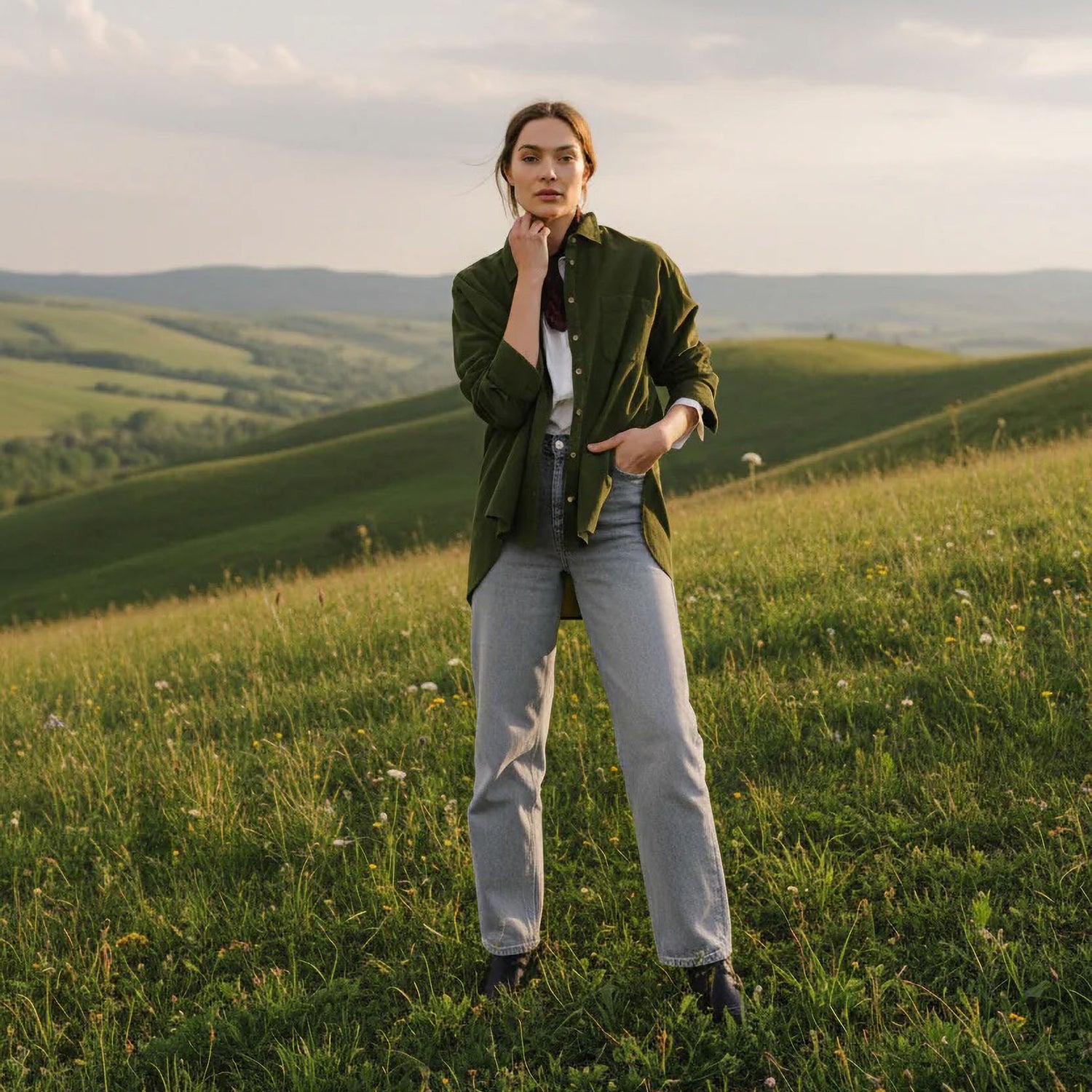 Long tunic-style shirt in baby velvet of khaki cotton, with a soft and velvety touch. Its fluid cut is distinguished by a slightly longer back than the front, side slits and a double fold on the back for more ease. With a classic collar and a chest pocket, it combines comfort, warmth and casual elegance