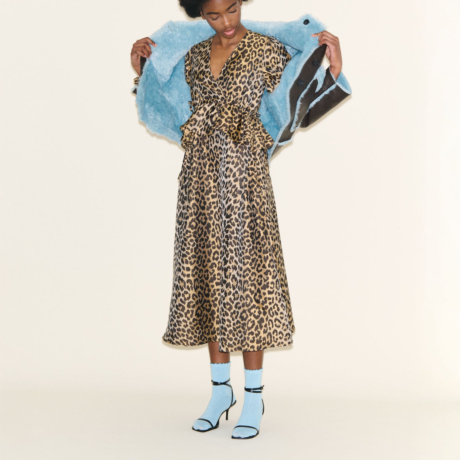 SAMDI Johanna Shearling Coat in Chocolate/Powder Blue