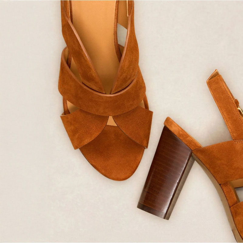 RIVECOUR Sandal 55 Suede Block Heel in Cognac