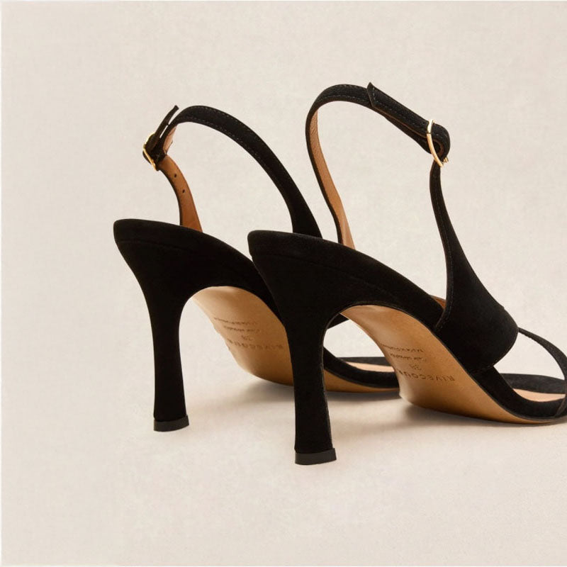Made in Portugal with a focus on traditional craftsmanship, the shoes feature an 80mm thin, flared heel in velvet goatskin and a V-shaped front, making them the perfect choice for evening wear
