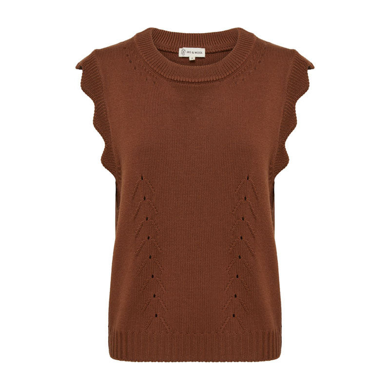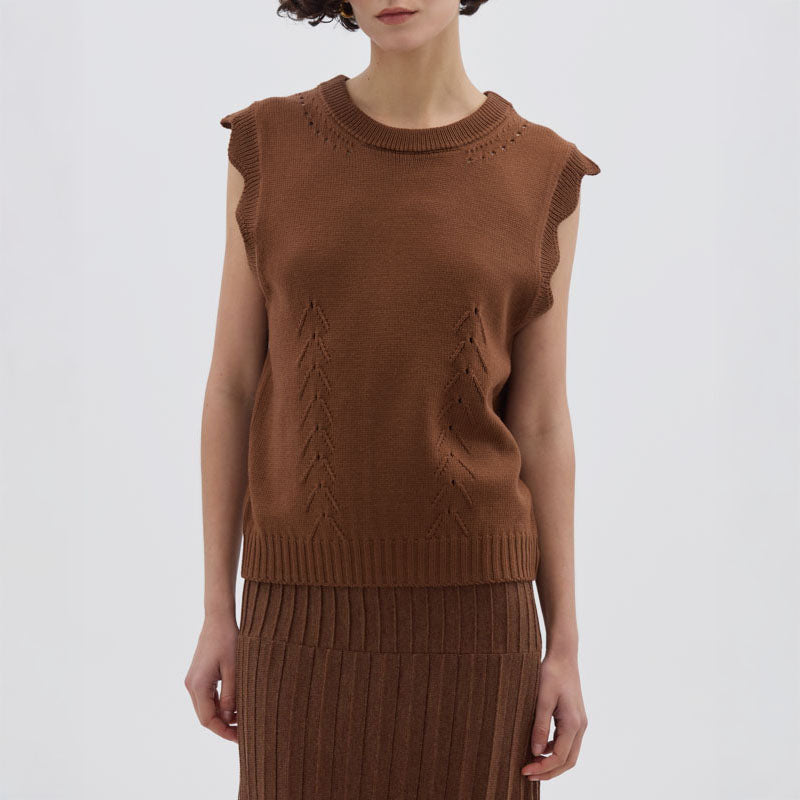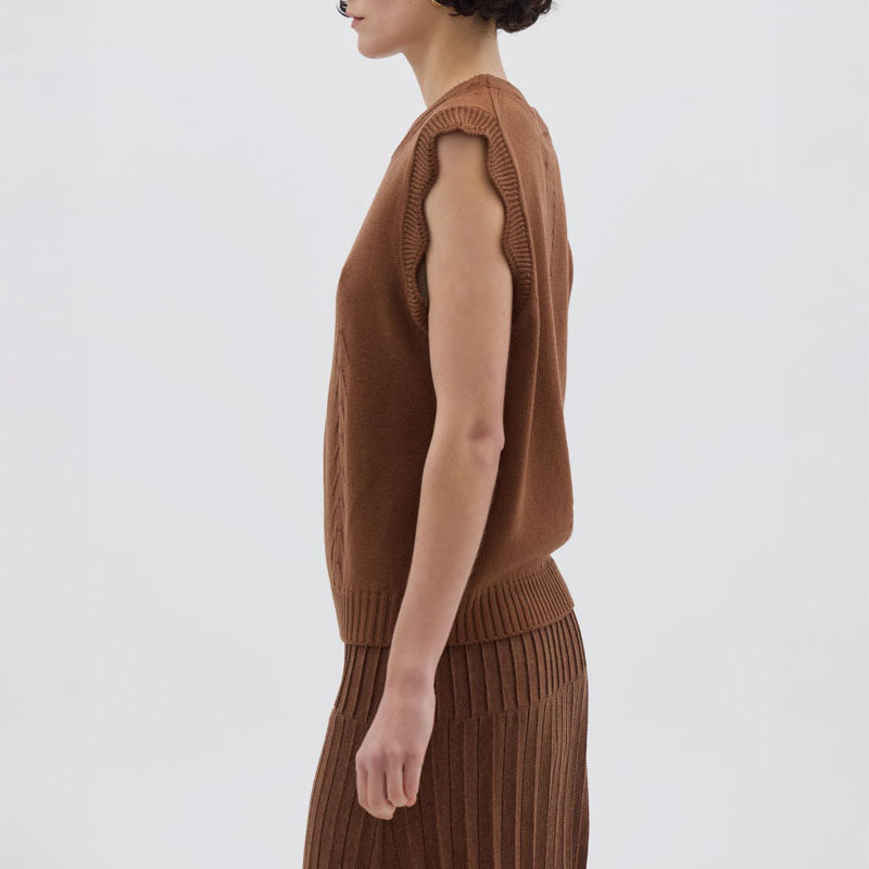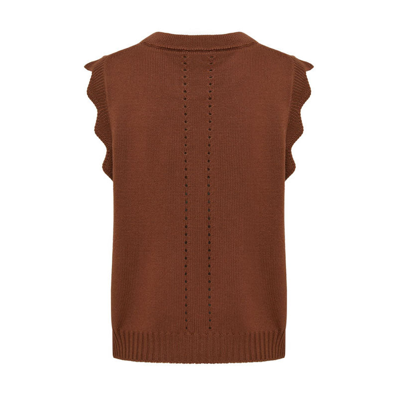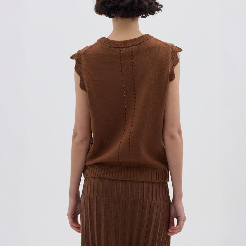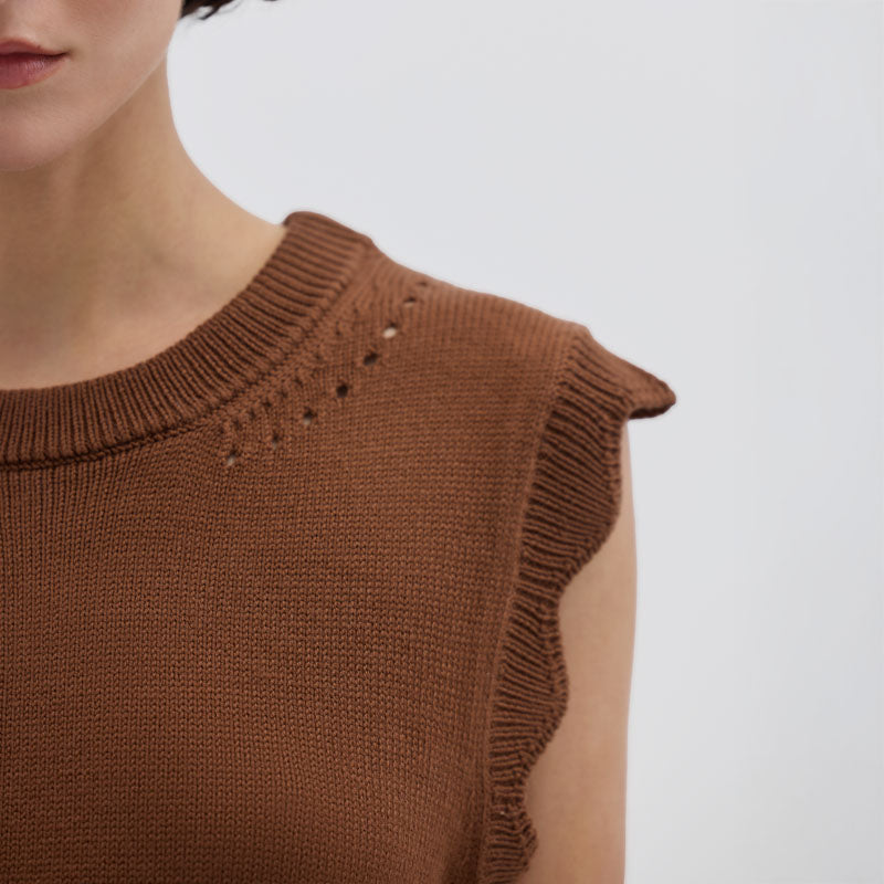 The Scallop Vest in Walnut adds timeless elegance to your wardrobe. This ladies knit vest, made from luxurious merino wool, features a flattering scalloped sleeve, a classic crew neckline, and delicate stitching for a refined silhouette.