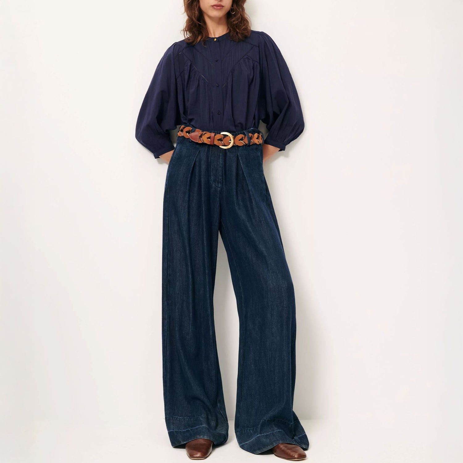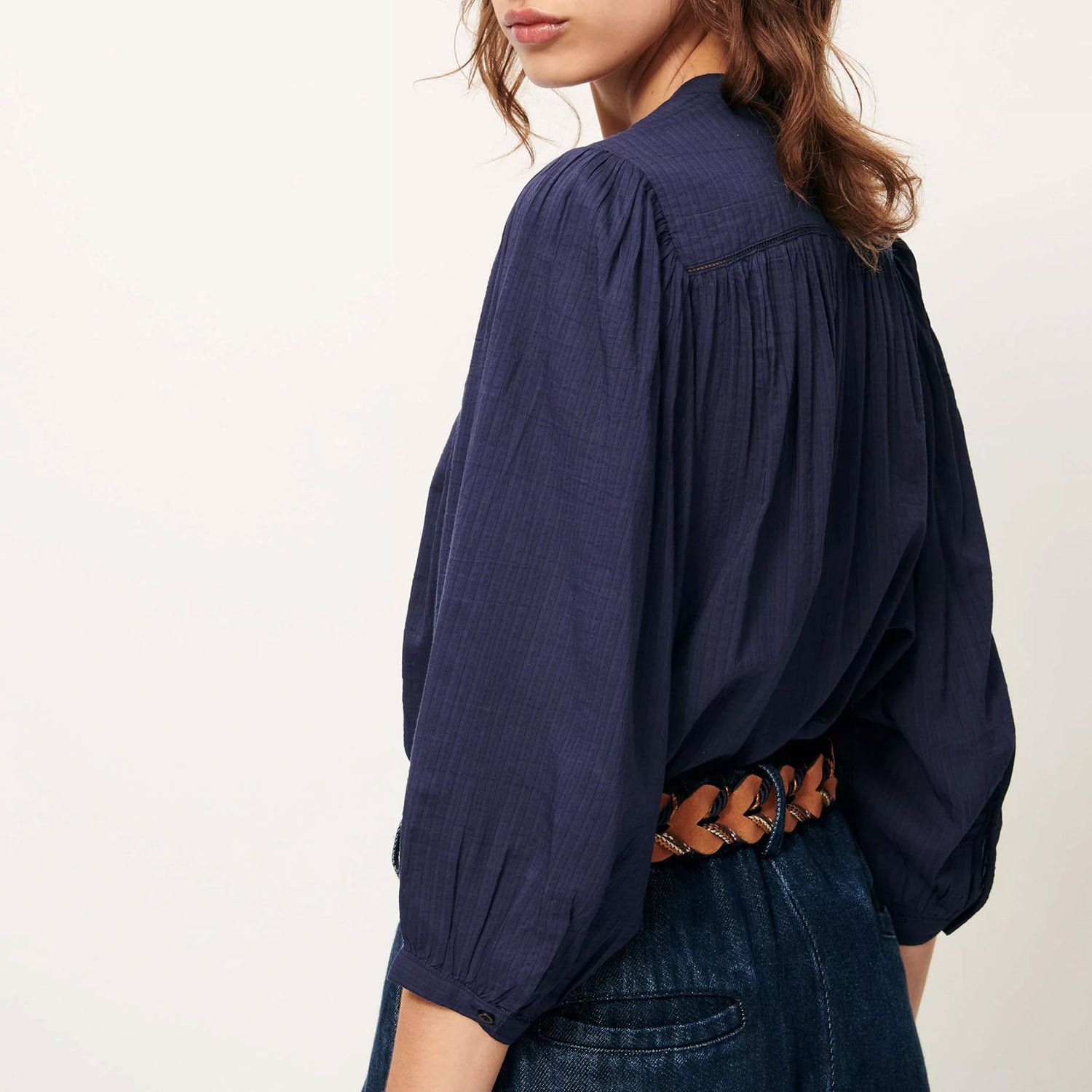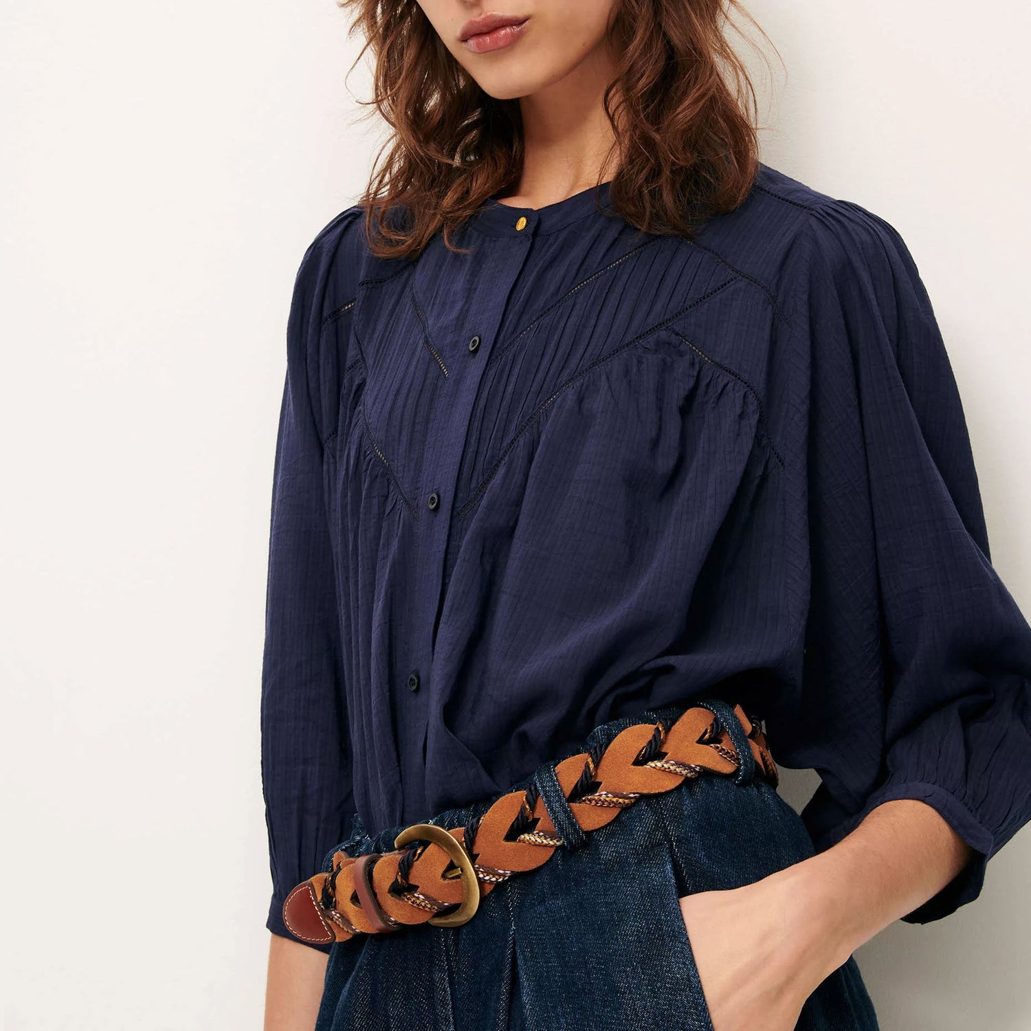 Delicate detailing meets effortless elegance in the Savi Puff Blouse by SESSÙN. Crafted in a jacquard-textured lawn fabric with fine contrasting stripes, this beautifully lightweight blouse features voluminous balloon sleeves, intricate ladder stitch accents, and refined mini knife pleats for a romantic, vintage-inspired finish.
