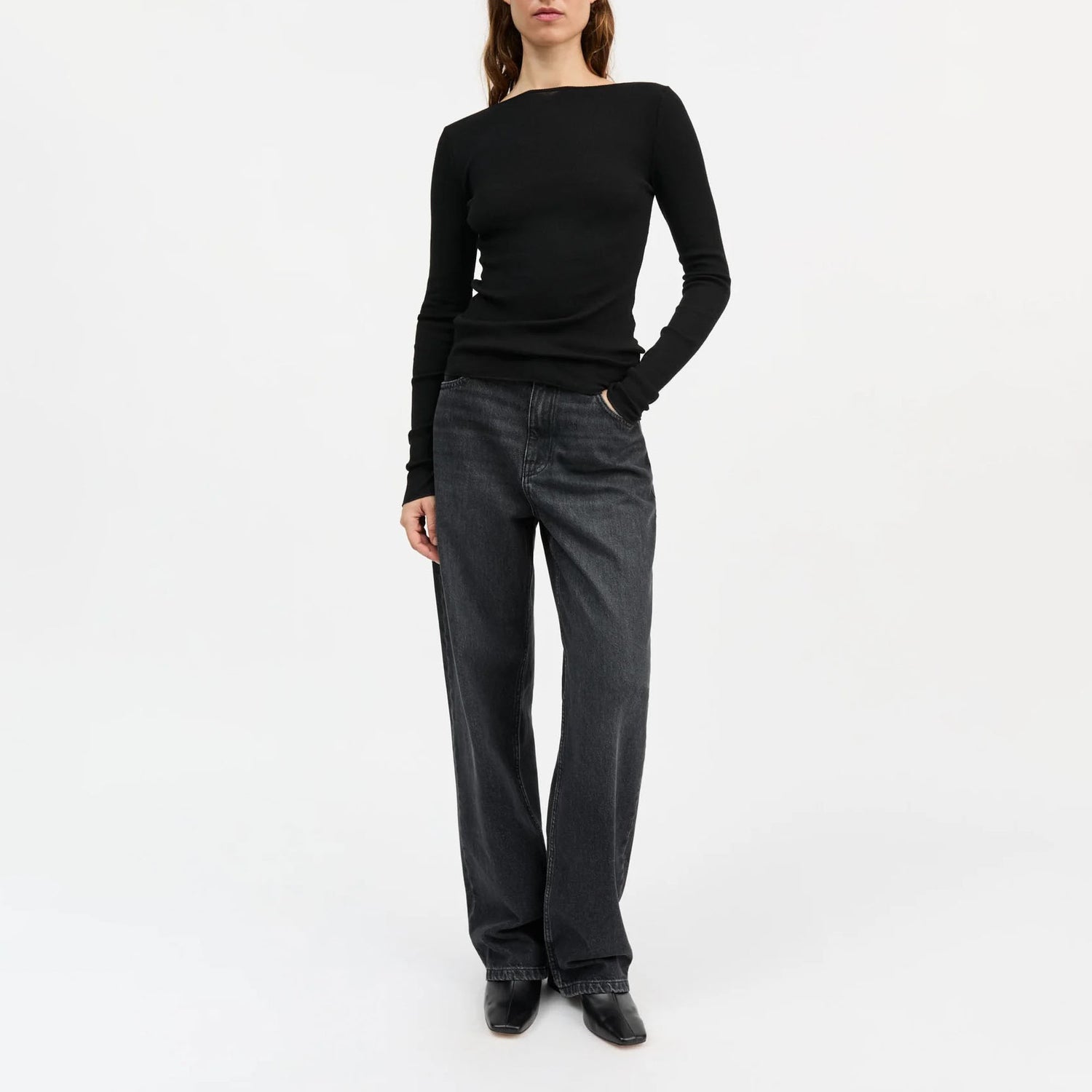 Designed with a wide boat neckline and long, slim sleeves, it features delicate baby lock stitching along the seams for a refined finish. With its slim cut that gently hugs the figure, this piece runs slightly small - so we recommend sizing up for the perfect fit.