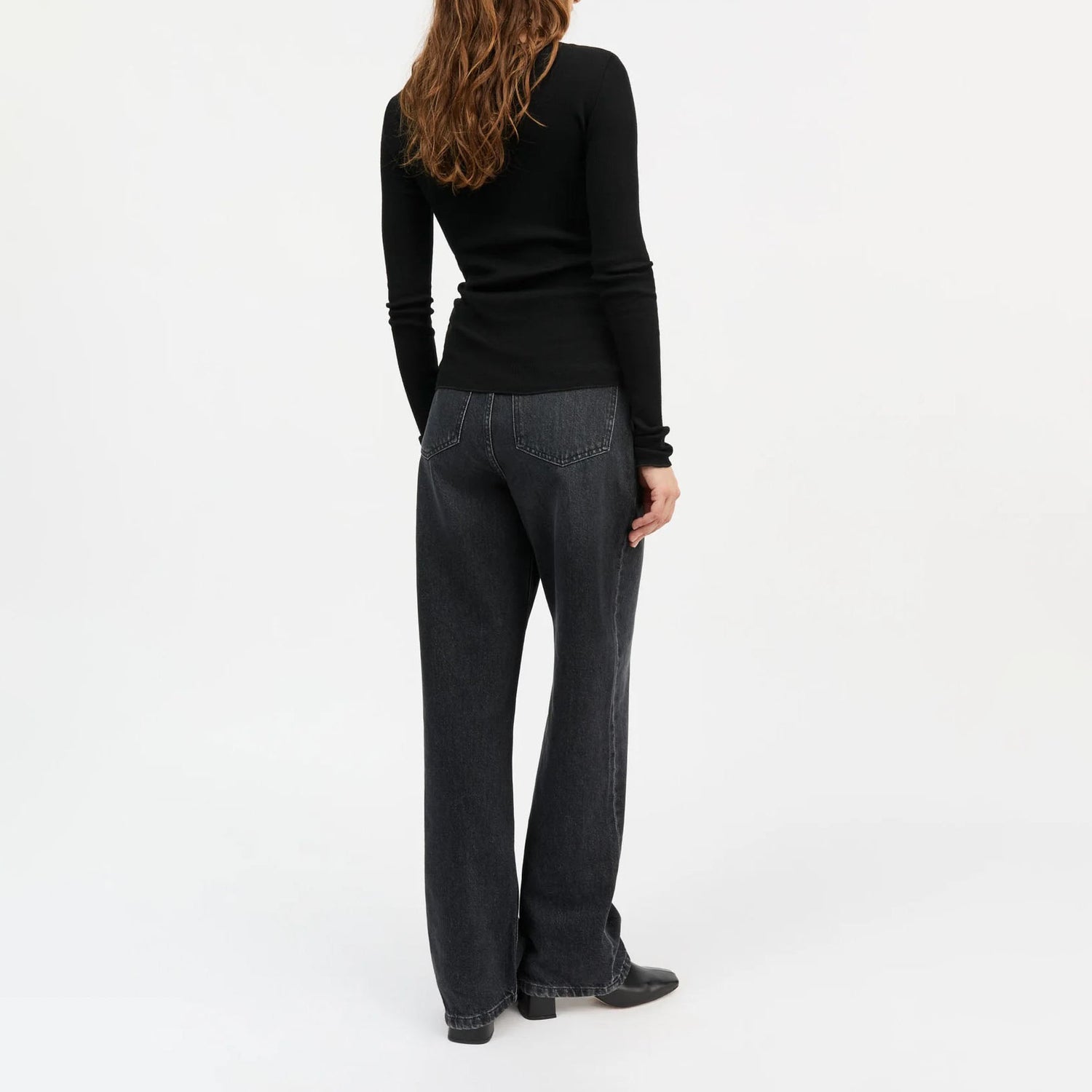 The Amy Wide Neck Blouse is crafted from 100% organic merino wool in a fine rib knit, offering a soft, close-to-body fit.