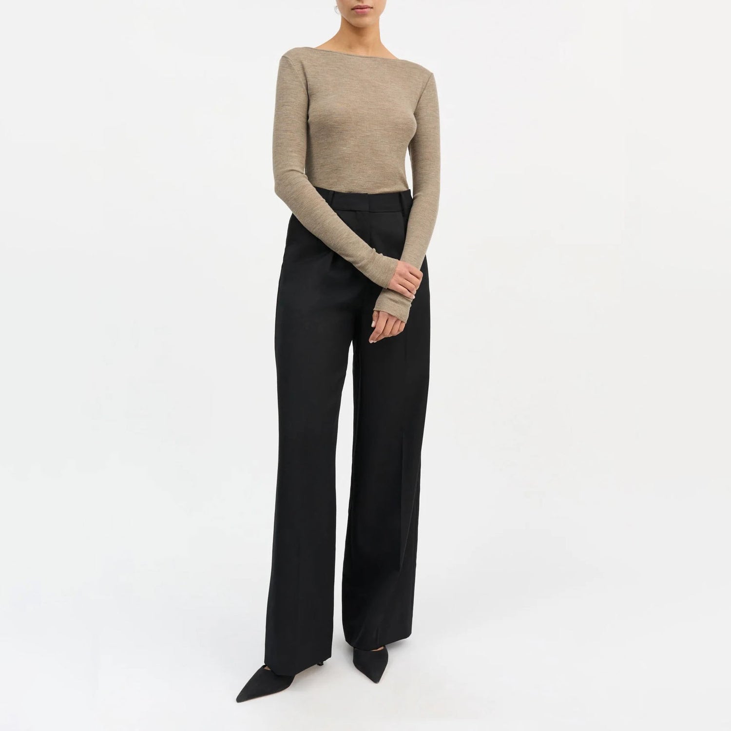 The Amy Wide Neck Blouse is crafted from 100% organic merino wool in a fine rib knit, offering a soft, close-to-body fit.