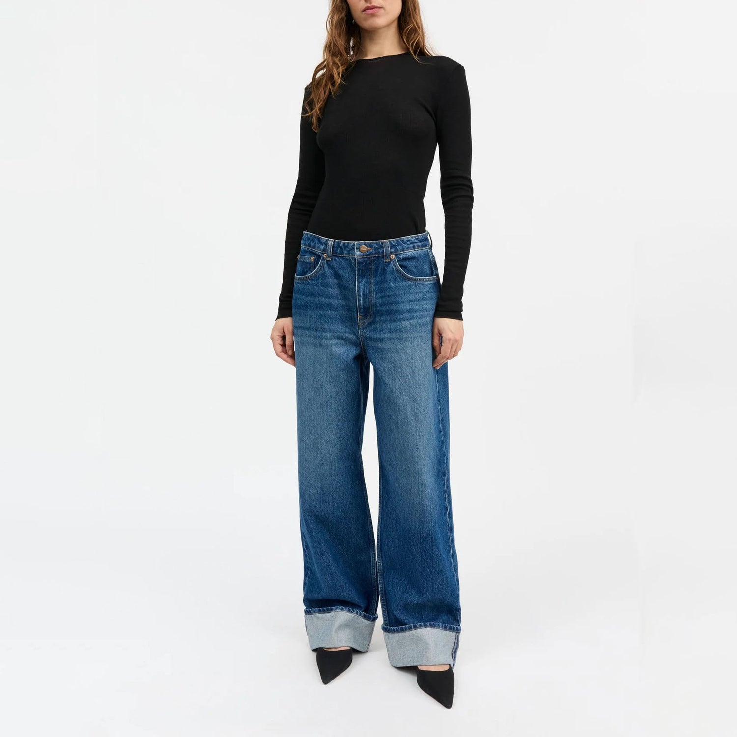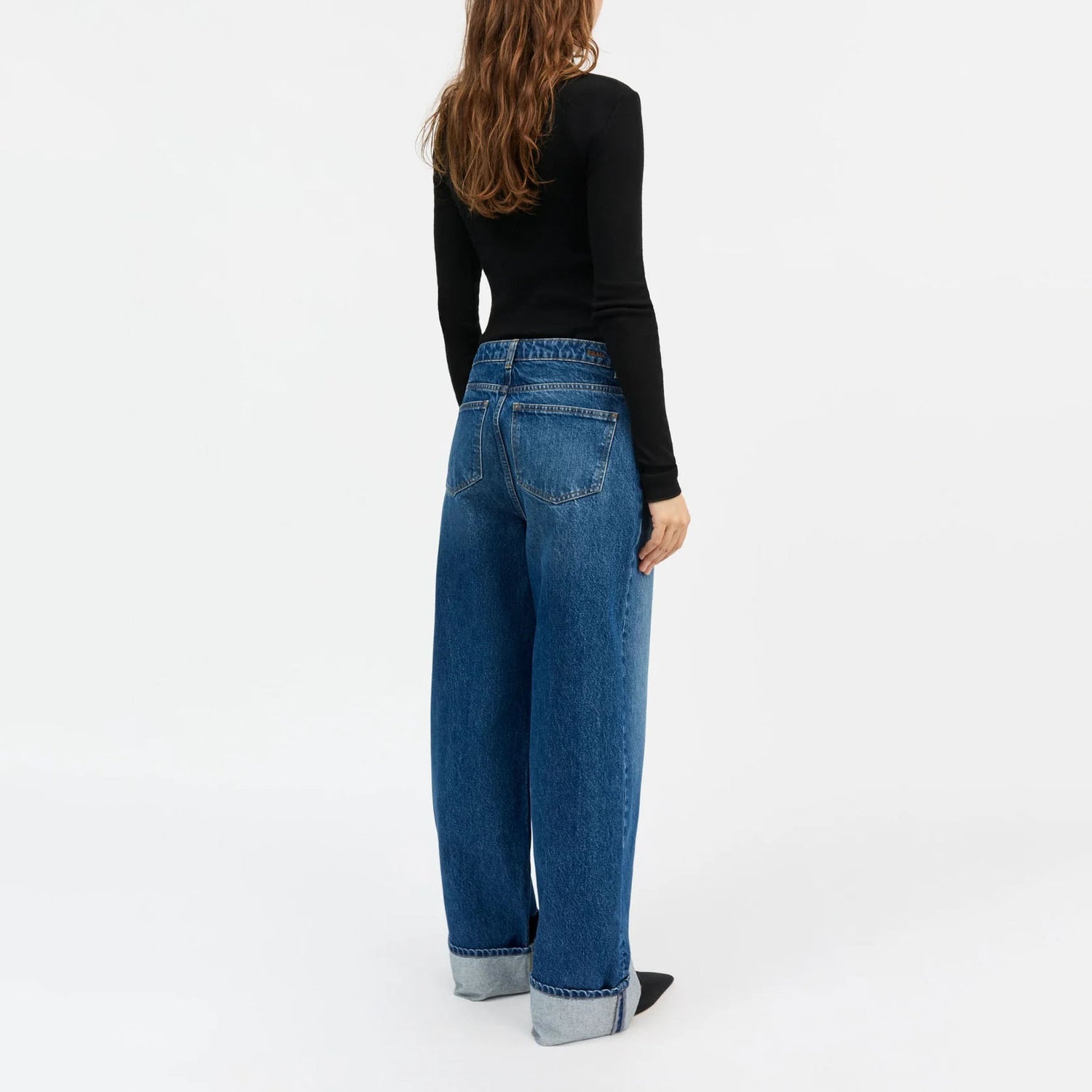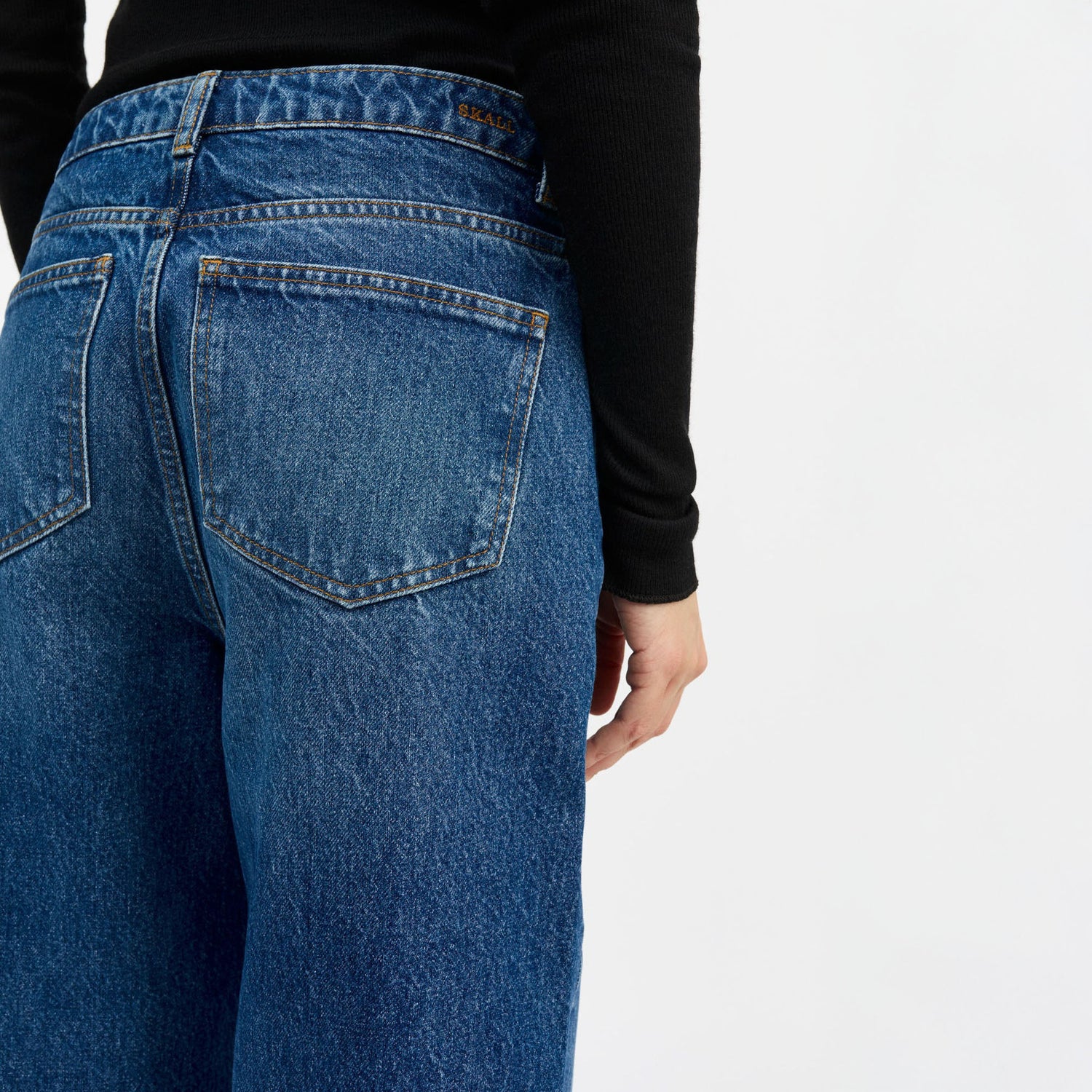 The Wilma Jeans offer a modern take on a classic five-pocket western style, crafted from 100% organic cotton denim. Designed with an oversized fit, they feature a dropped waist and wide legs with deep turn-ups that can be styled as desired for a laid-back look. An embroidered Skall logo at the back of the waistband adds a subtle signature touch.