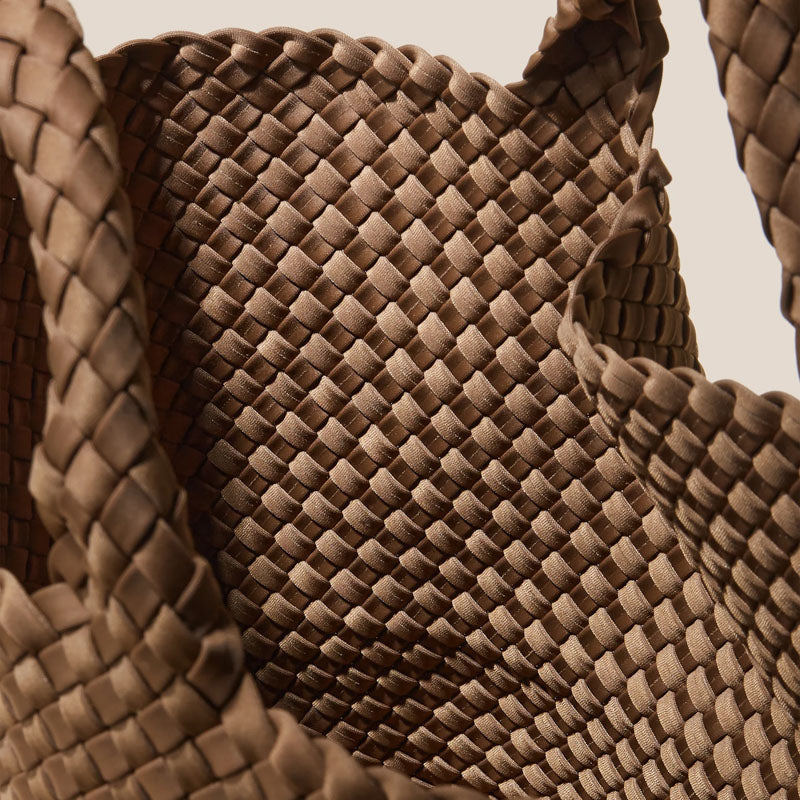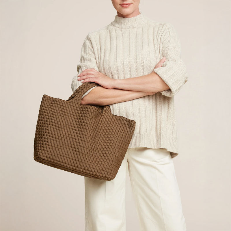 Handwoven neoprene in brown. The original design, the St. Barths Medium Tote is a versatile, everyday bag for work, beach, or travel.