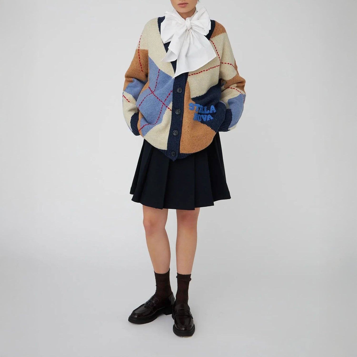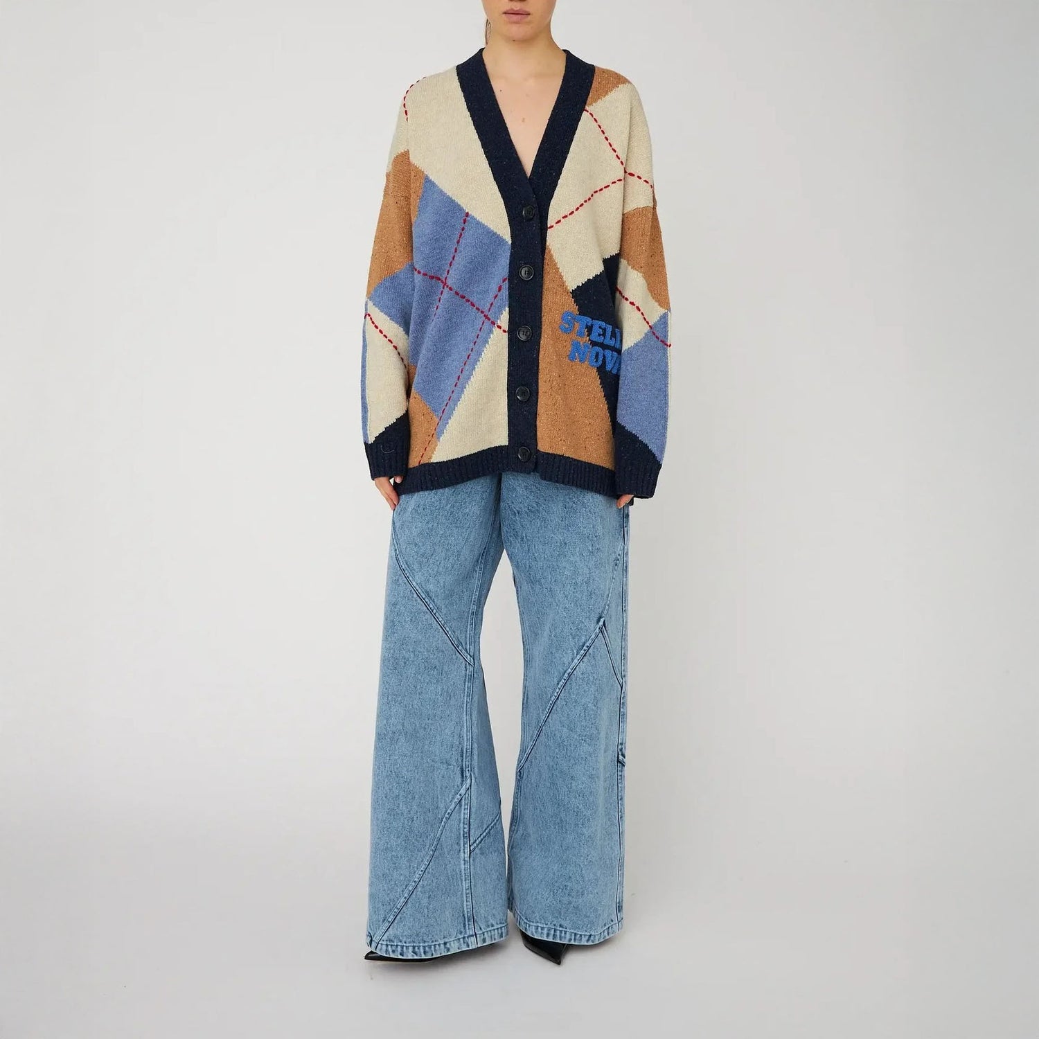 Oversized cardigan showcasing a striking pattern in contrasting colours. Features a deep V-neckline, ribbed trim, and front button fastening. Embellished with an embroidered STELLA NOVA logo on the front.