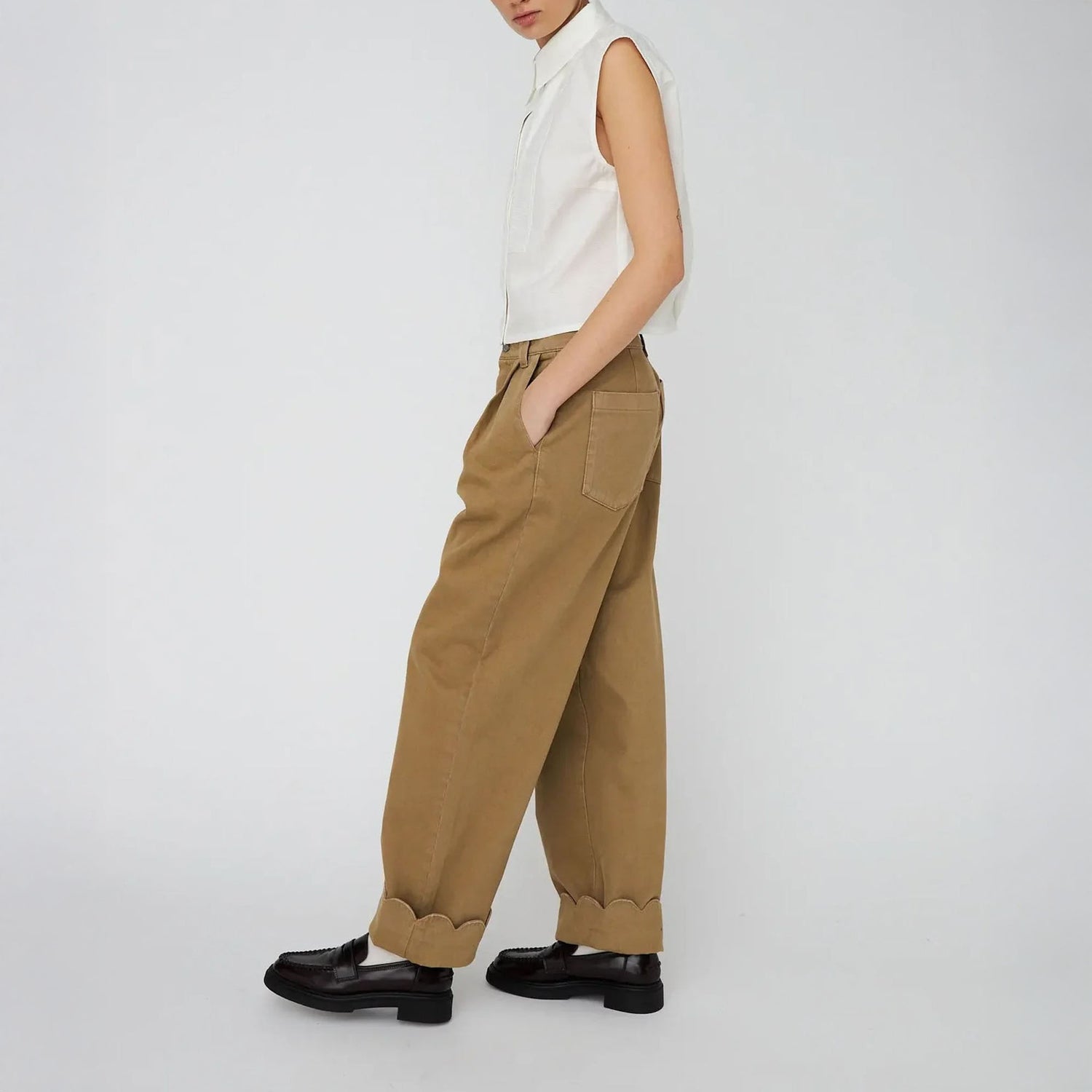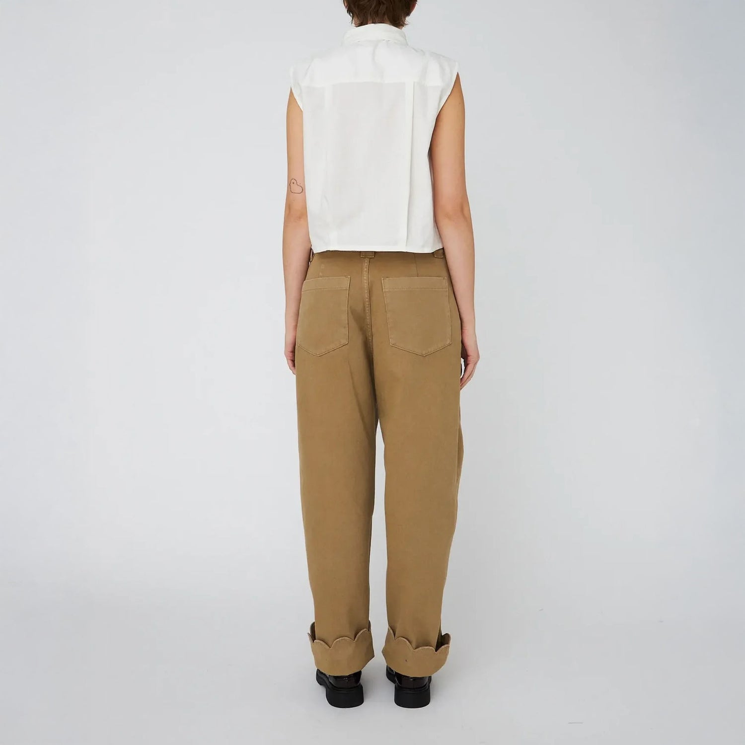 Relaxed, versatile, and effortlessly cool. These brushed cotton trousers feature a low waist and tapered carrot-leg shape, with the option to roll the hems up or down to suit your style. Finished with front and back pockets, they’re the perfect blend of comfort and attitude.