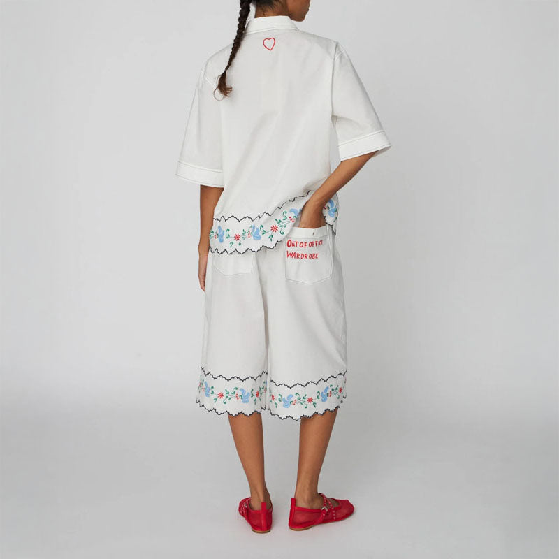 Your out-of-office uniform, upgraded. This short-sleeved cotton shirt brings the fun with its embroidered scalloped hem, cheeky “OUT OF OFFICE WARDROBE” chest pocket, and a sweet little heart detail on the back.