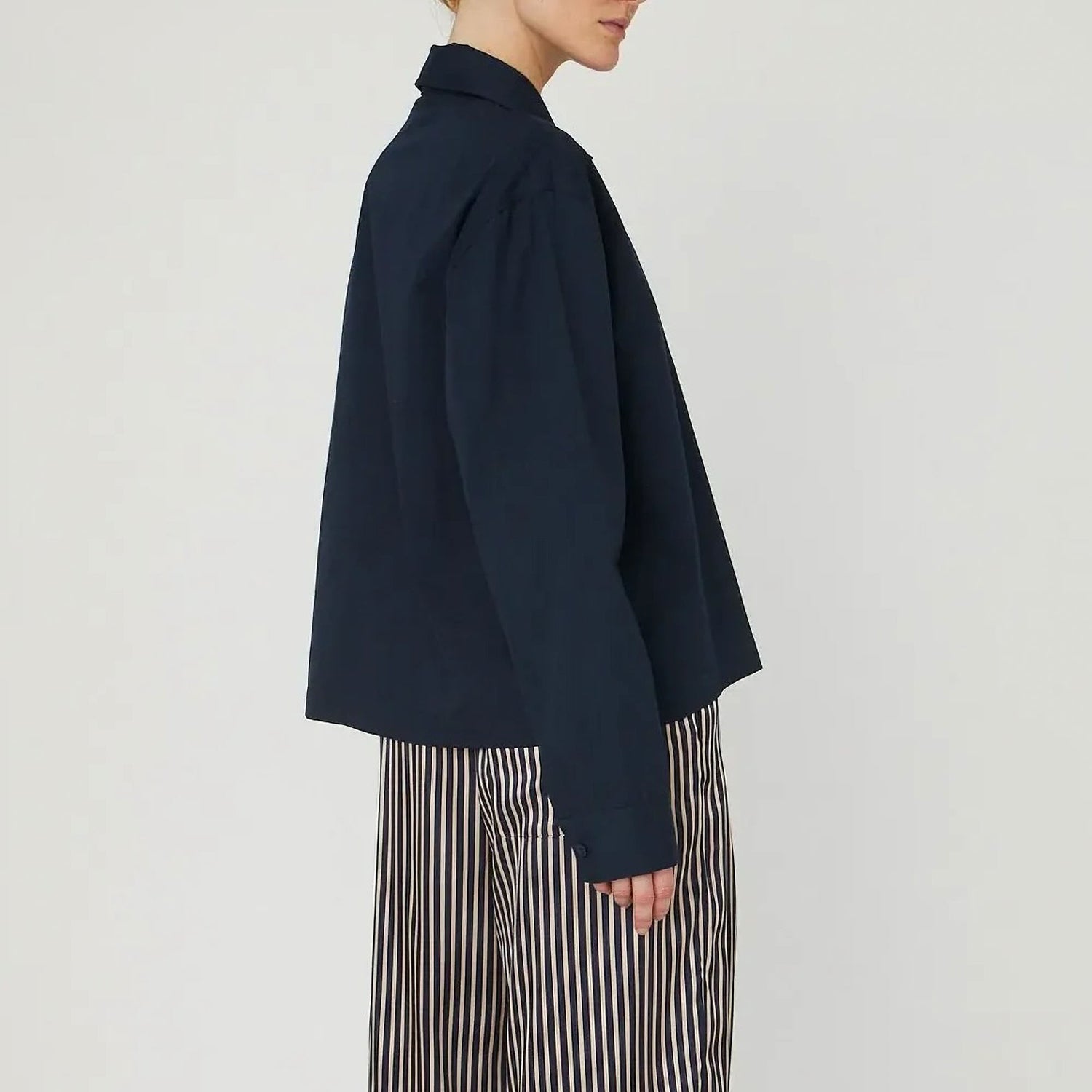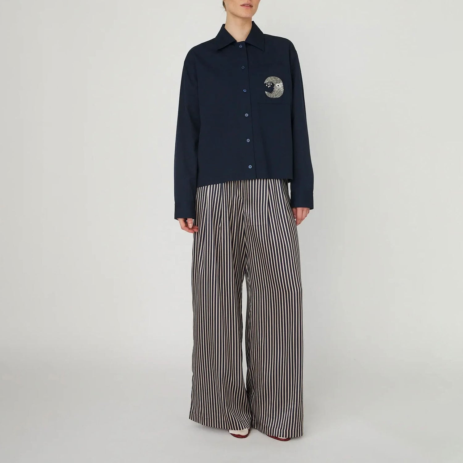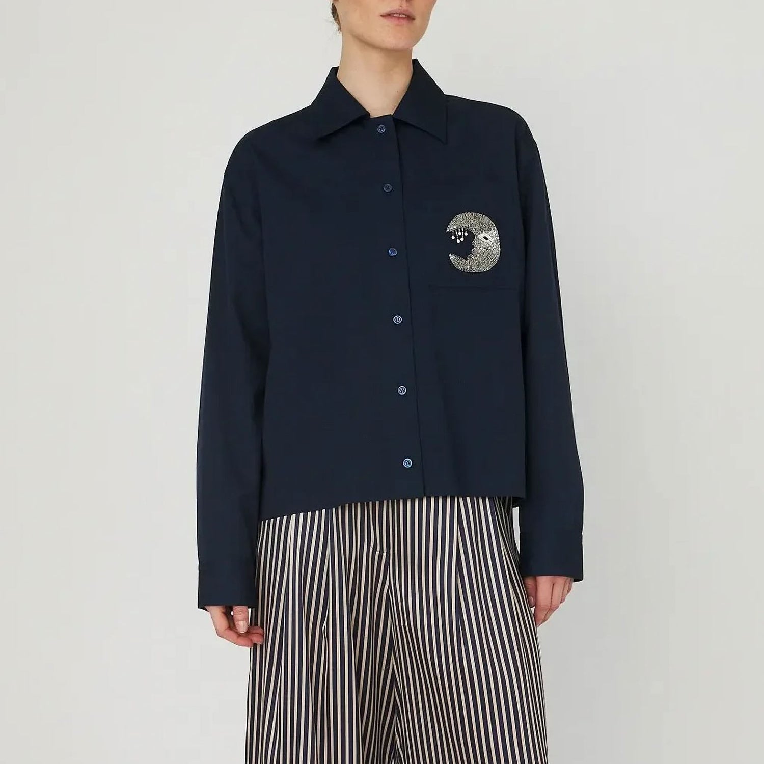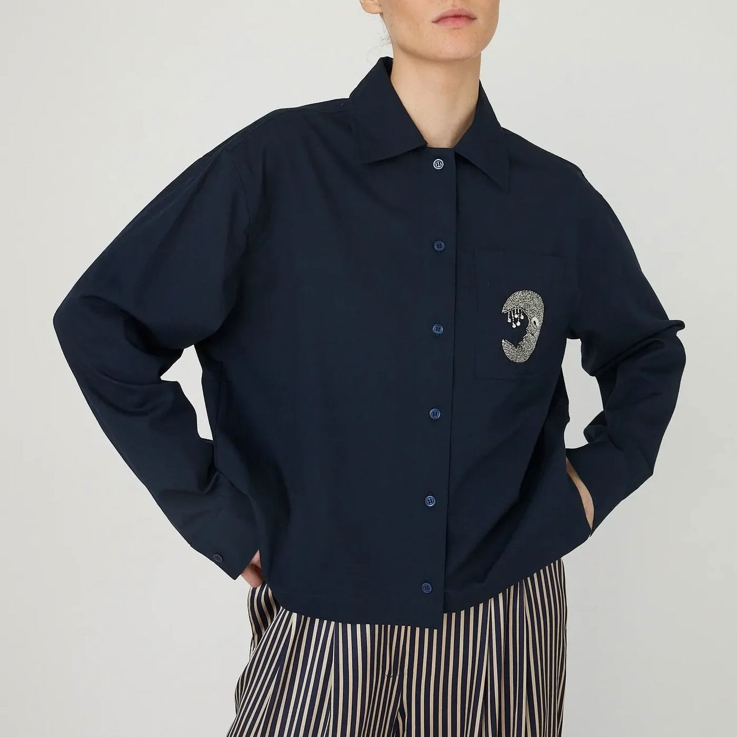 Loose-fit shirt with long sleeves finished with cuffs. Designed with a classic collar, front button closure, and an embroidered moon detail on the chest pocket for a subtle celestial touch.