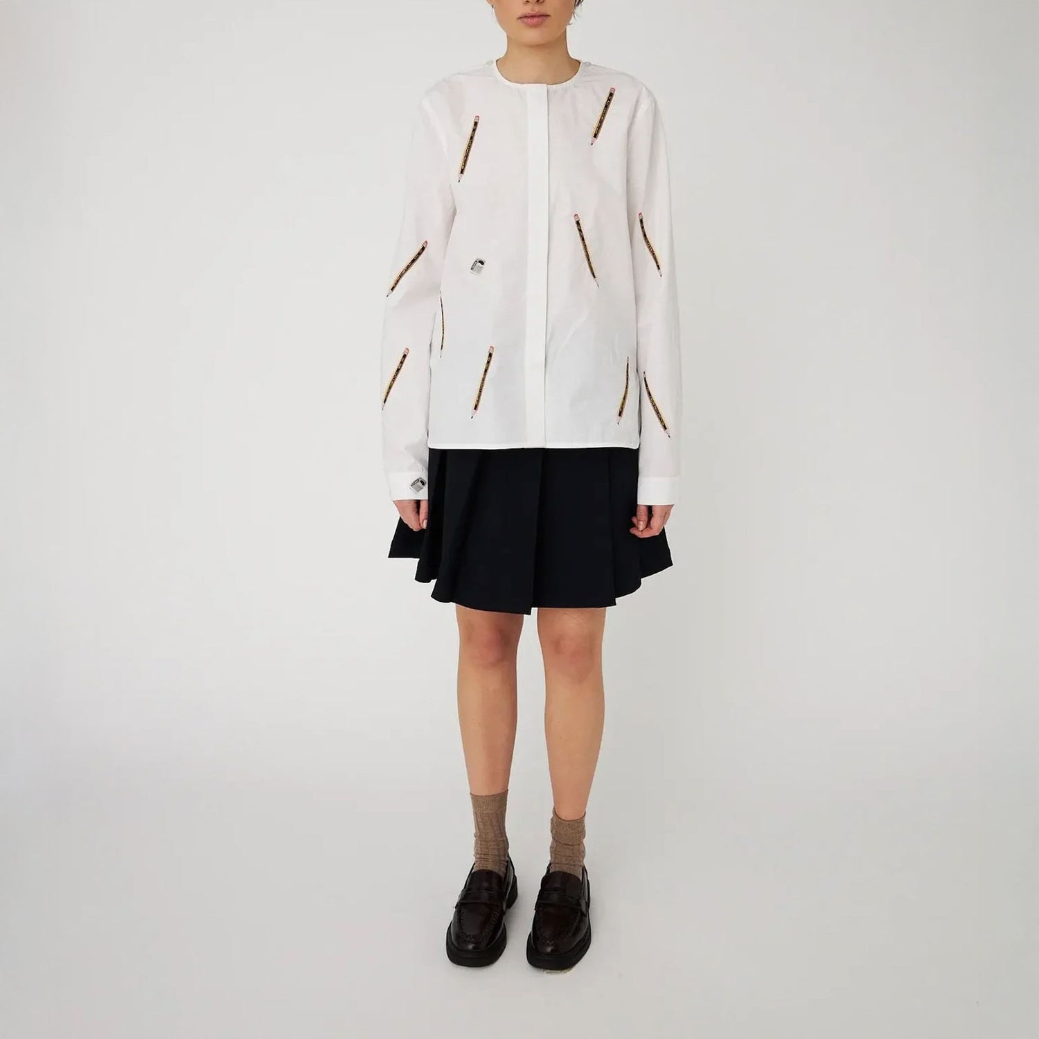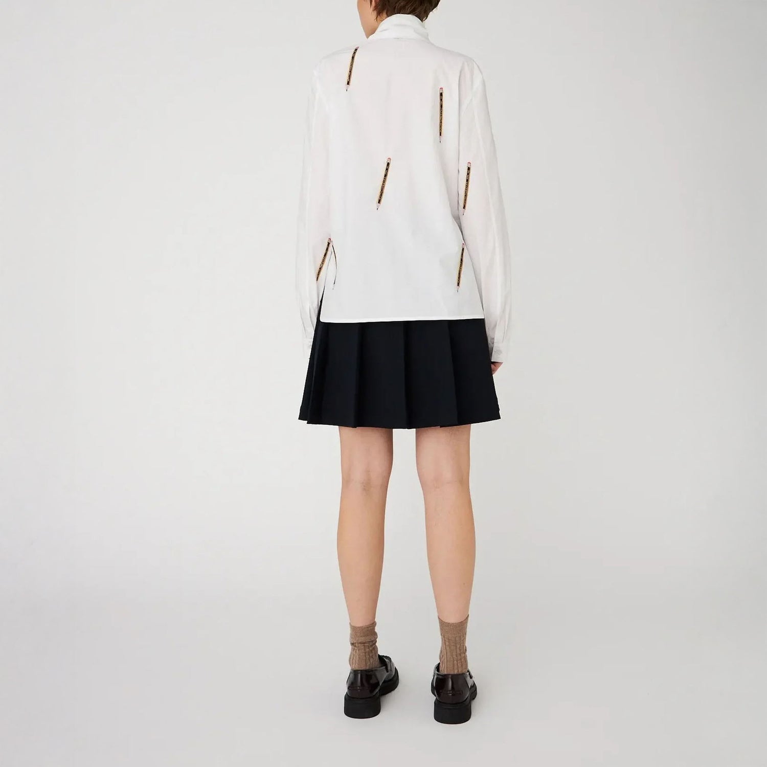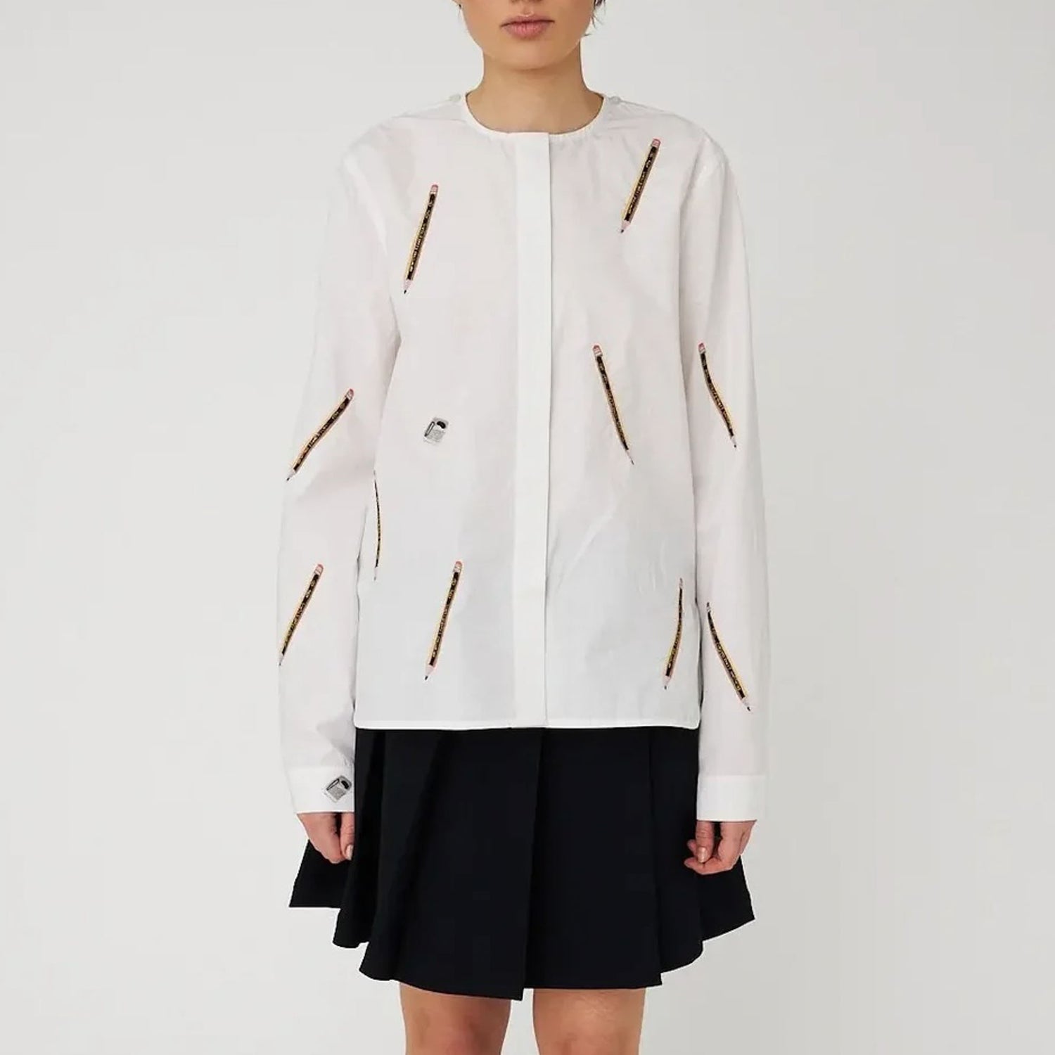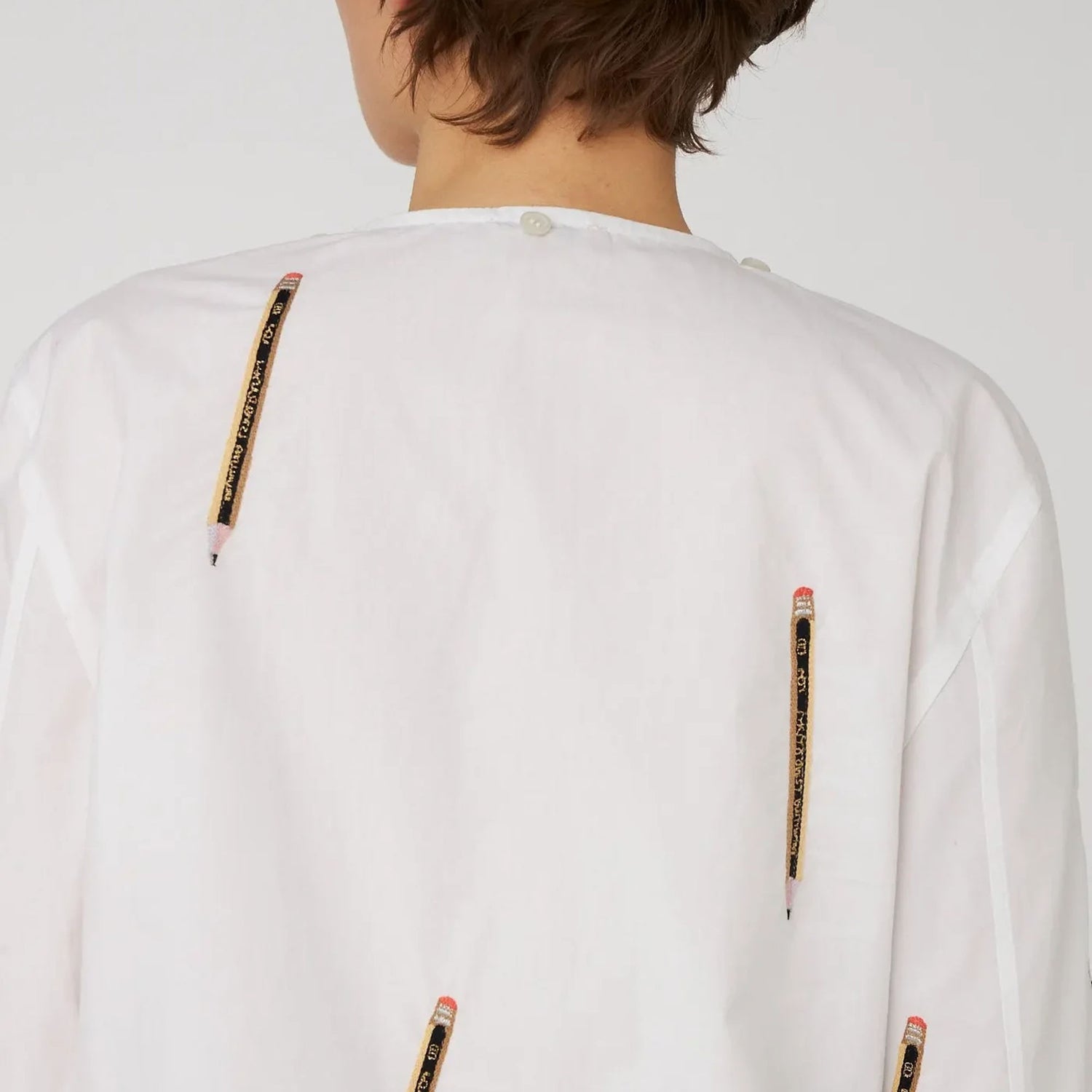 A crisp cotton shirt with a playful twist. Featuring delicate embroidered pencils and a feminine neck-tie bow, this button-down style brings just the right balance of classic and quirky. Finished with long sleeves and buttoned cuffs, it's a standout staple with unmistakable STELLA NOVA charm!