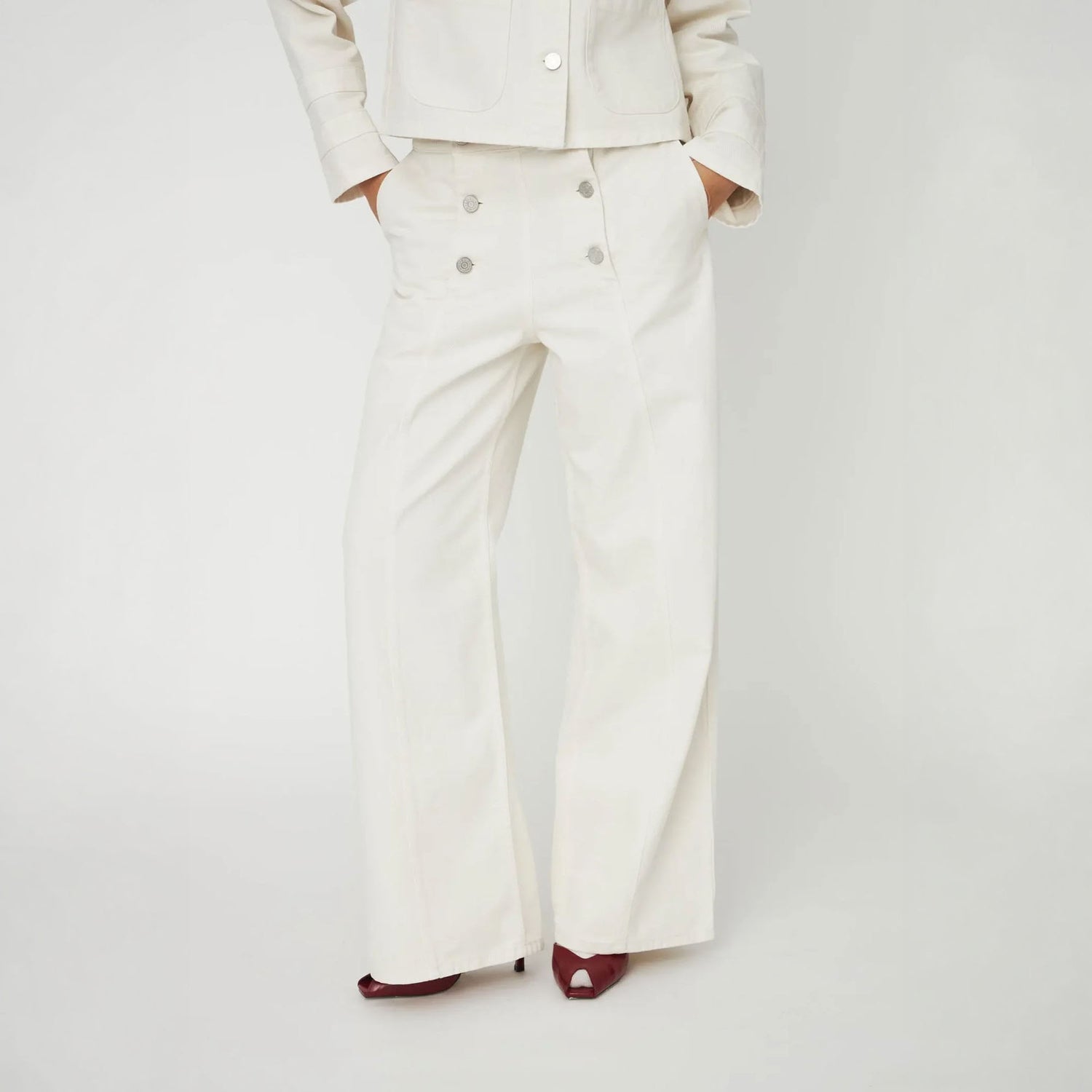 STELLA NOVA Sailors Pants in Almost White embody nautical sophistication with refined tailoring. These trousers feature a mid-rise waist and straight-leg cut that creates an elegant, elongated silhouette. The regular crotch provides comfortable proportions, whilst the front button closure delivers a secure, polished appearance.