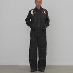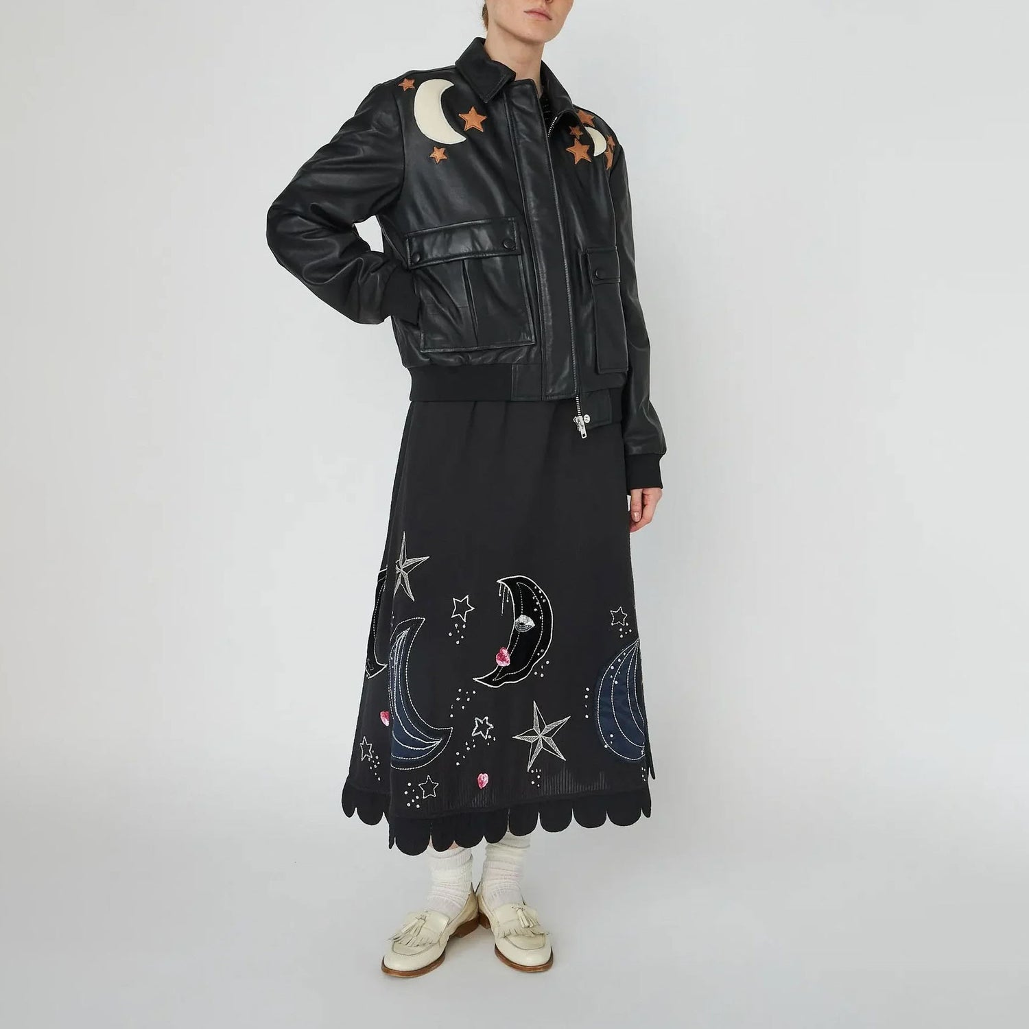 Leather jacket adorned with moon and star embroidery inspired by the MIDNIGHT WARDROBE. Designed with front pockets, a classic collar, and a sleek zipper closure, this piece combines celestial charm with timeless edge... a cool and essential staple for the winter season.