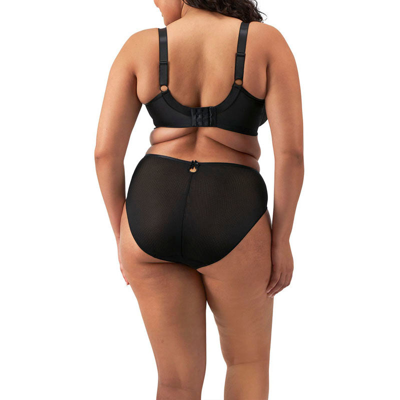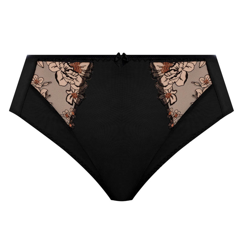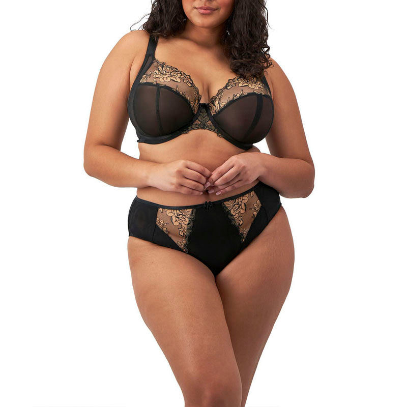 Step into the spotlight with Elomi’s Teagan High Leg Brief in Black/Almond – the ideal blend of elegance and comfort. Crafted with double-layer stretch mesh for a perfect balance of coverage, these briefs feature a high-leg cut that beautifully flatters your shape. The precision-printed embroidered panels, accented with soft metallic yarn, add a luxurious finishing touch to this stunning design