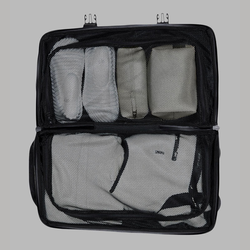 This compact trolley features a bi-fold case with two main compartments, one of which includes elastic crossbands, while both compartments have mesh closures for efficient organisation.