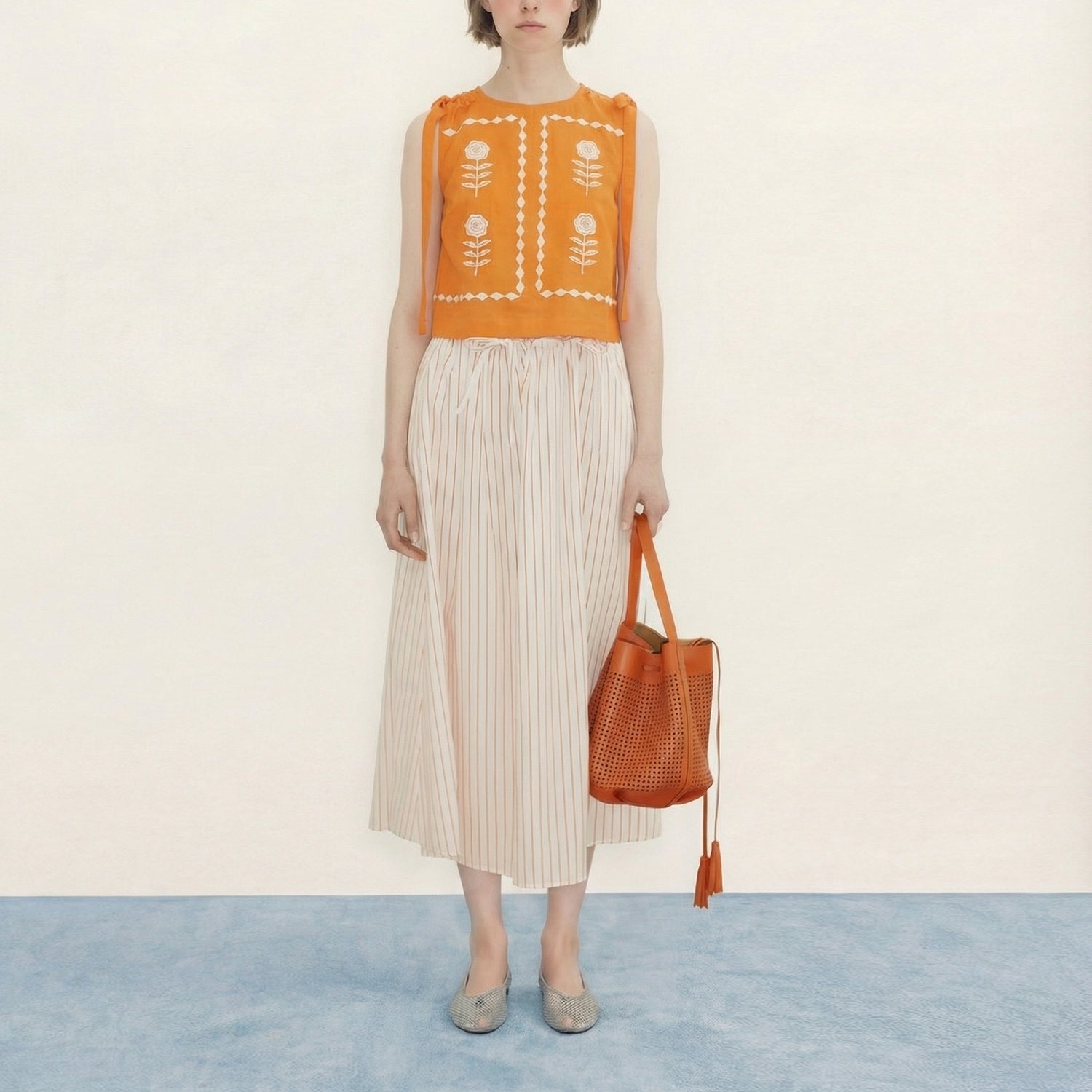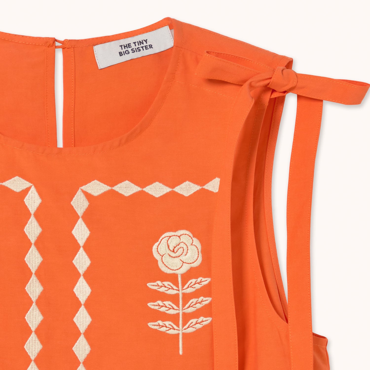 Crafted from crisp cotton poplin, this Barcelona-designed piece features shoulder ties and delicate white floral embroidery that adds a whimsical, folksy character. Perfect for layering or wearing solo, it's a playful staple that celebrates individuality with understated flair.