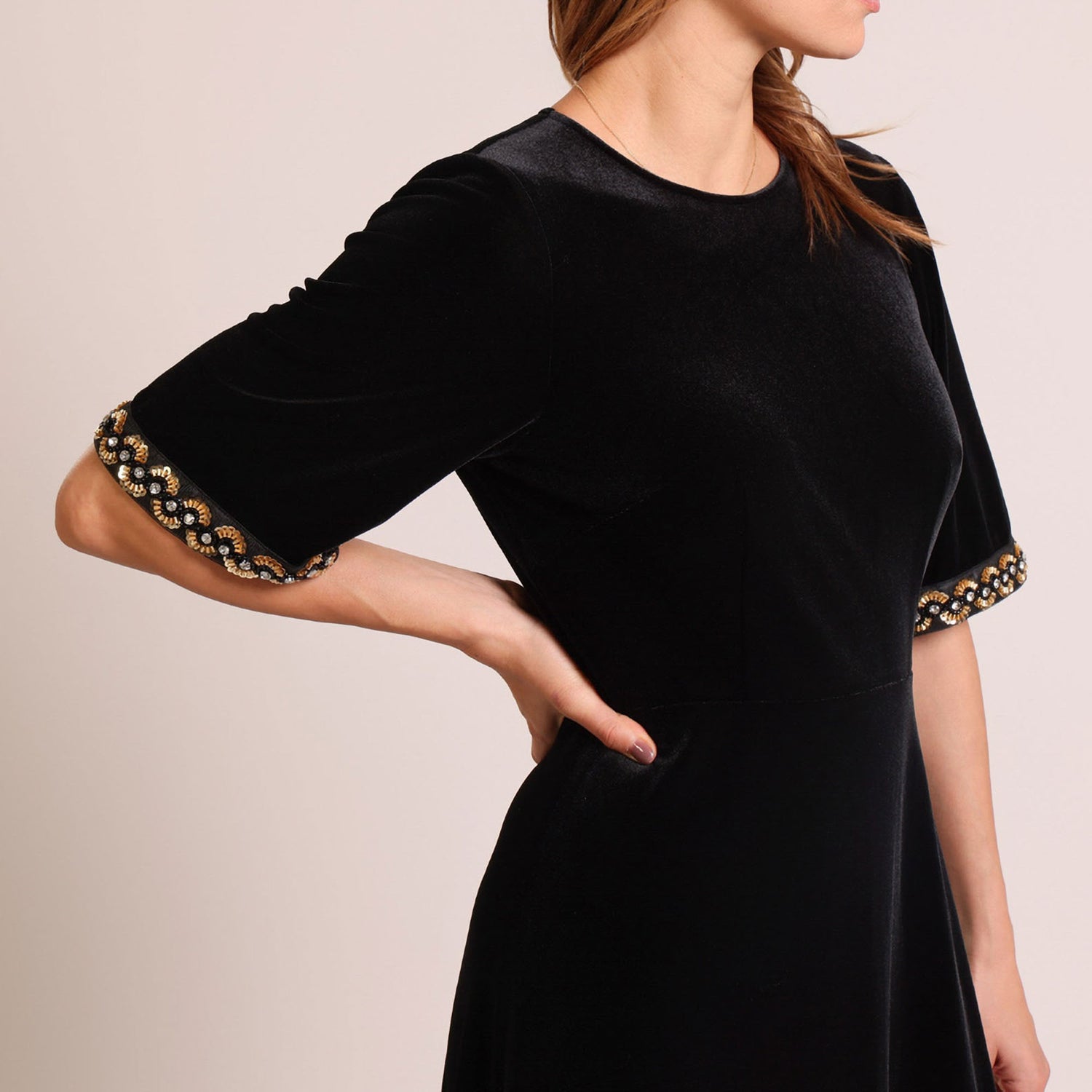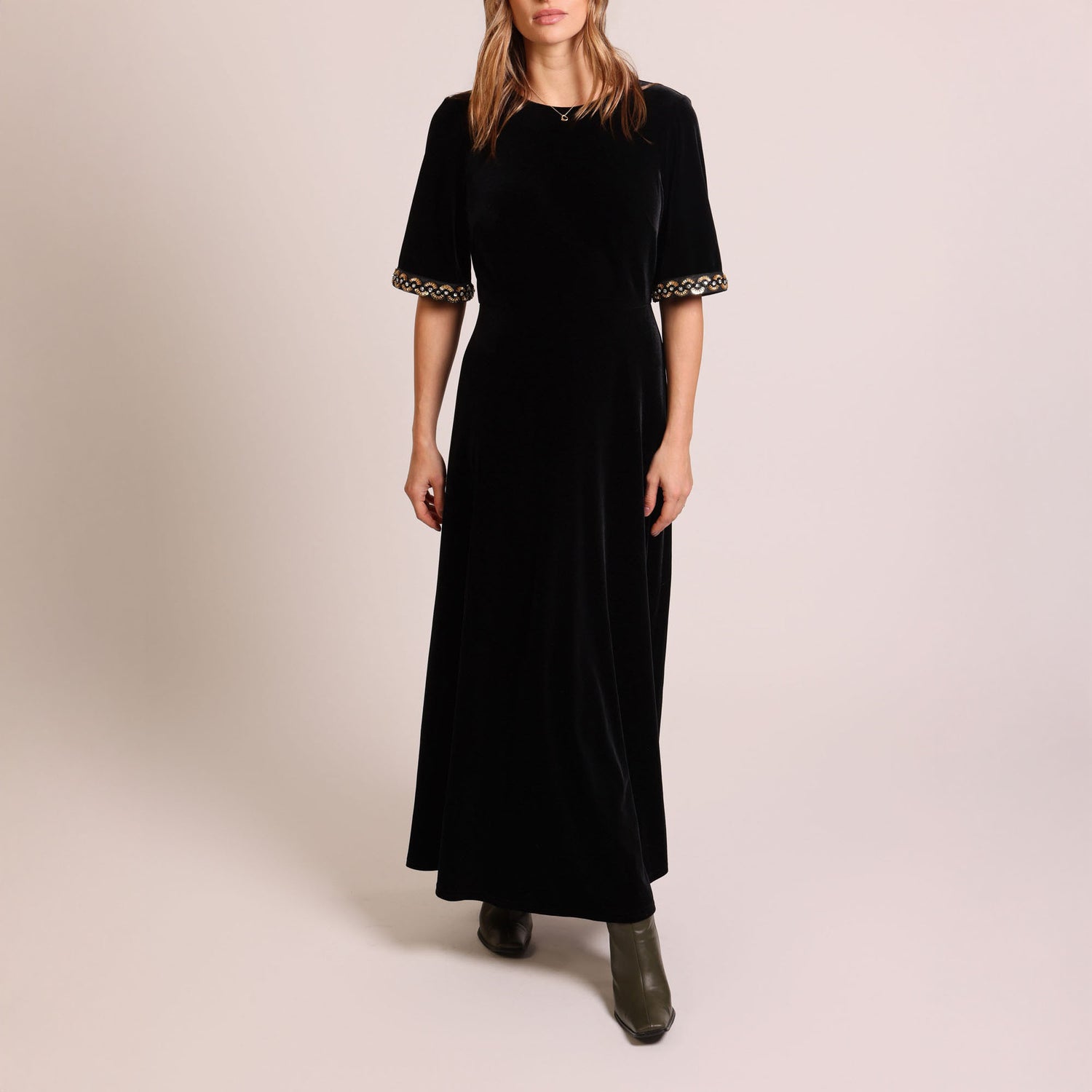 A long velvet dress with a classic boat neckline and intricate detailing on the sleeves. Elegant and timeless, it’s perfect for evenings when you want subtle sophistication with a touch of texture.