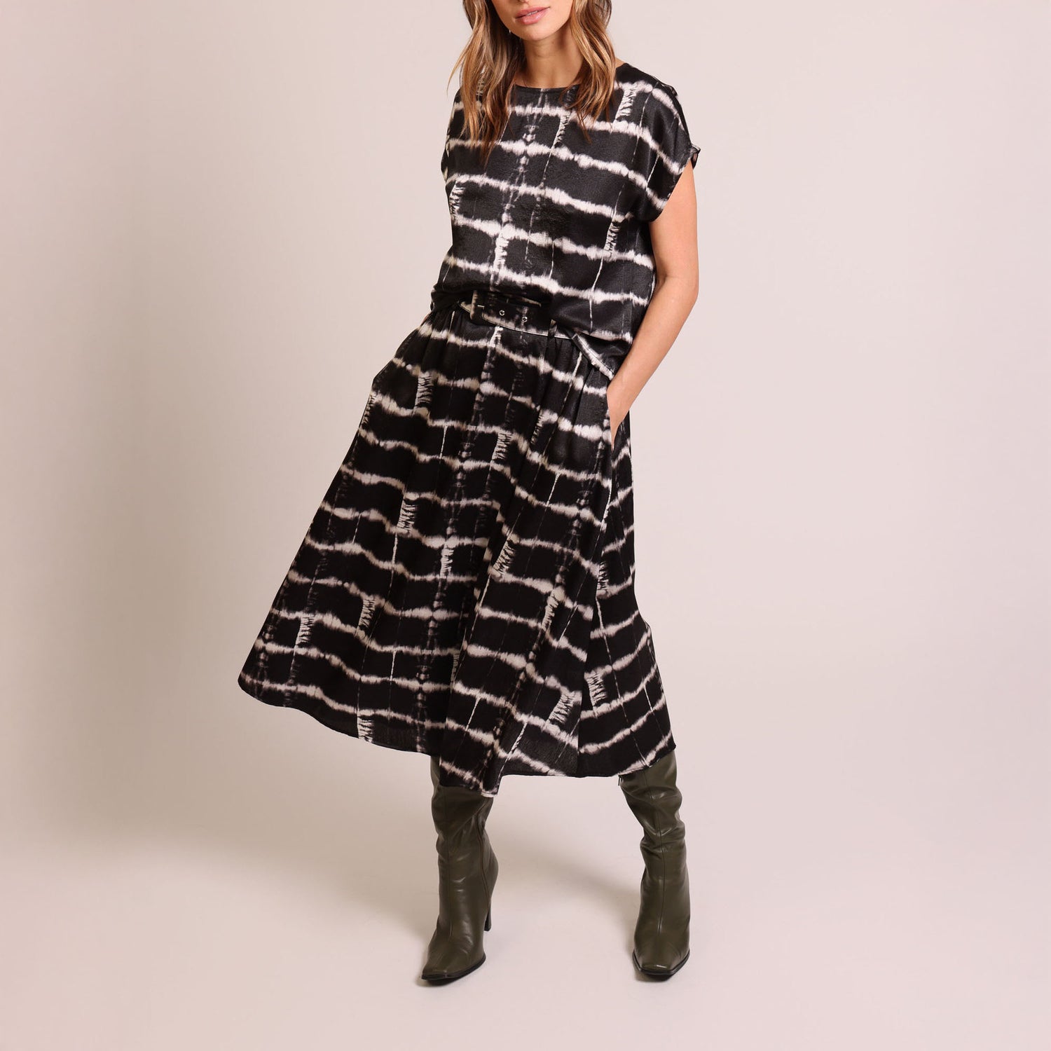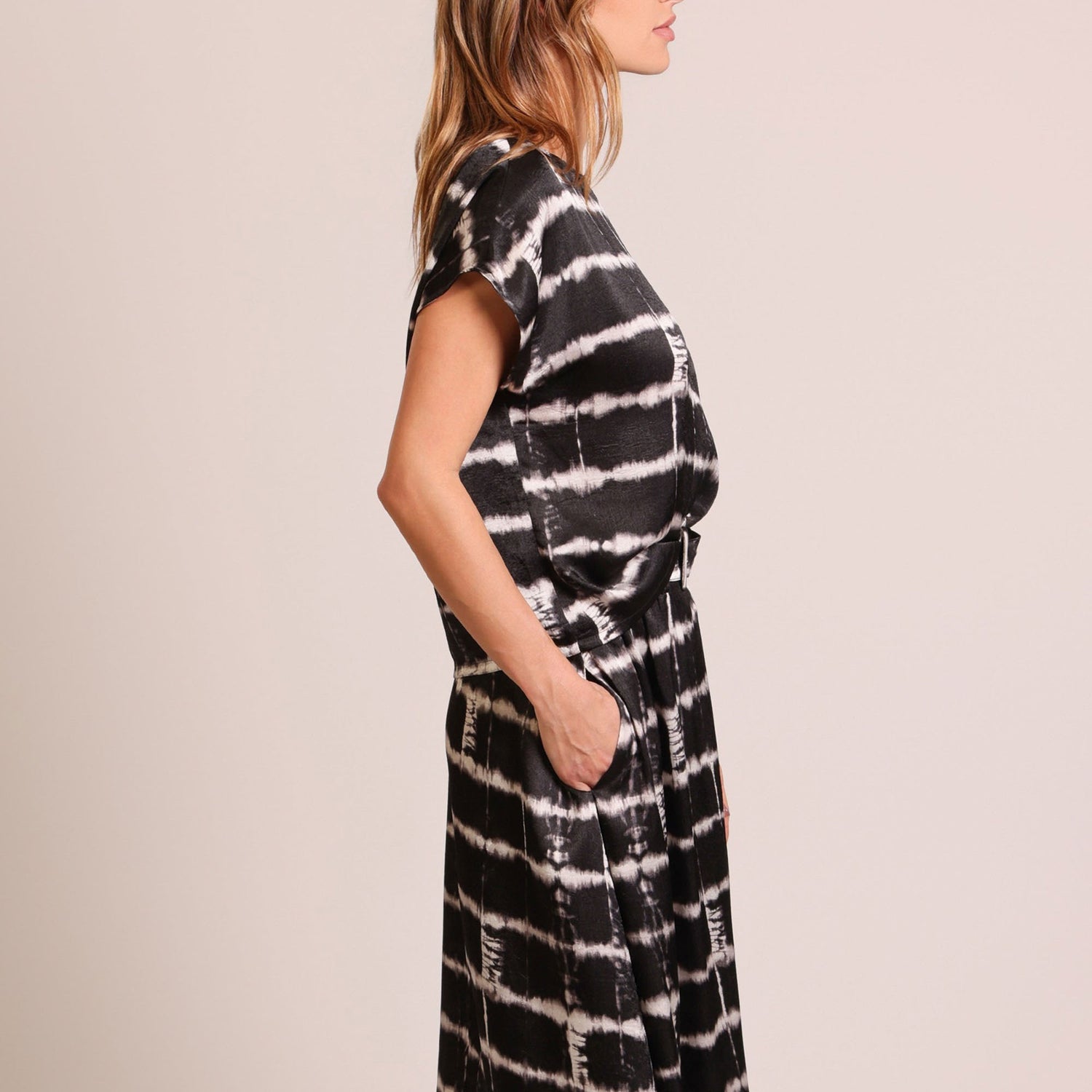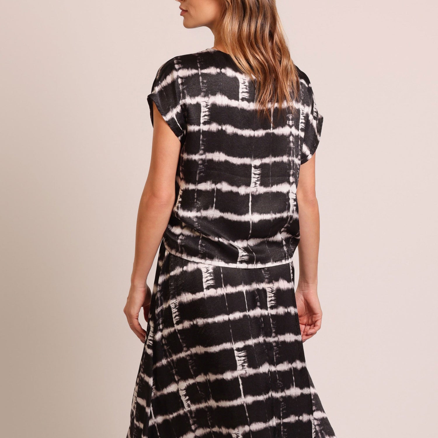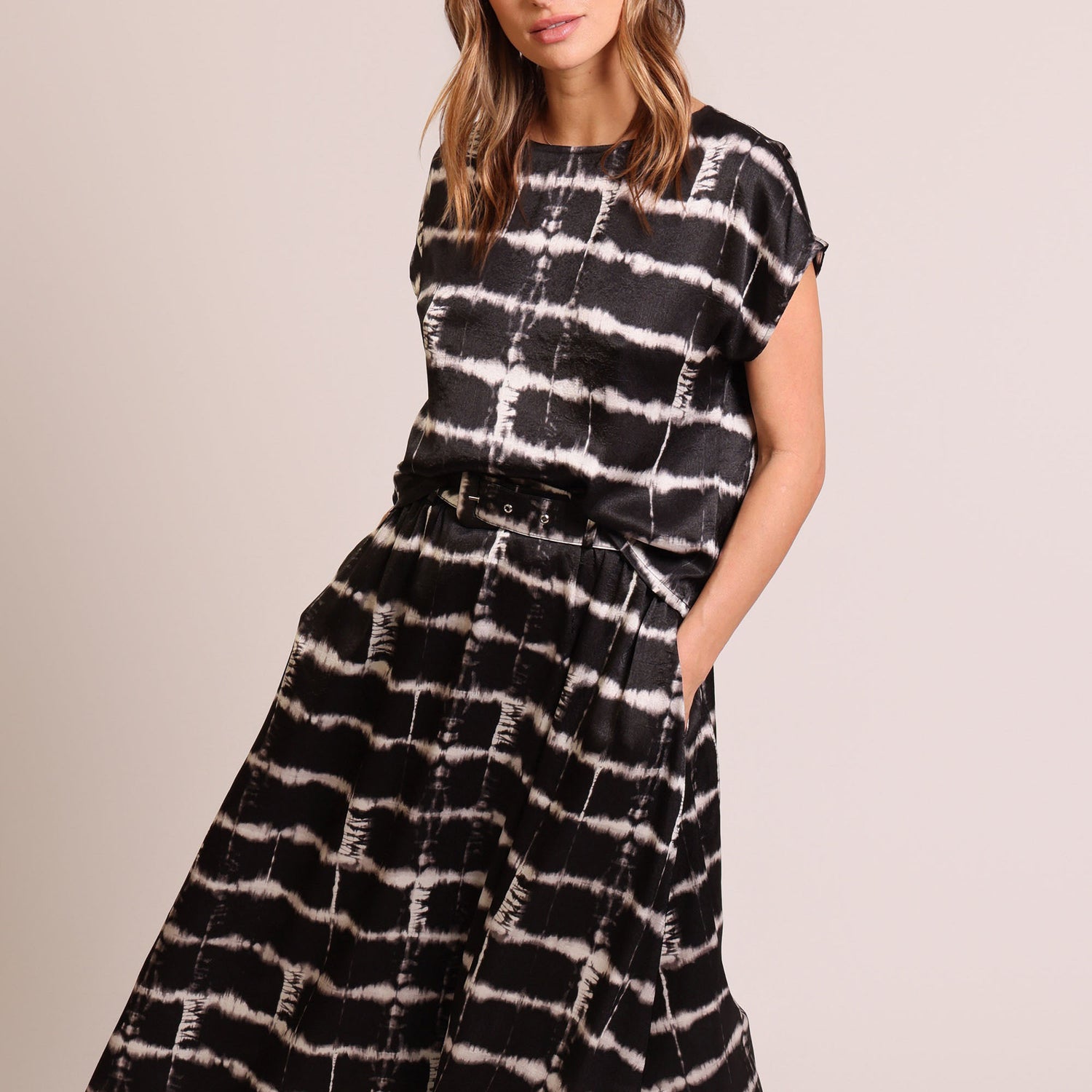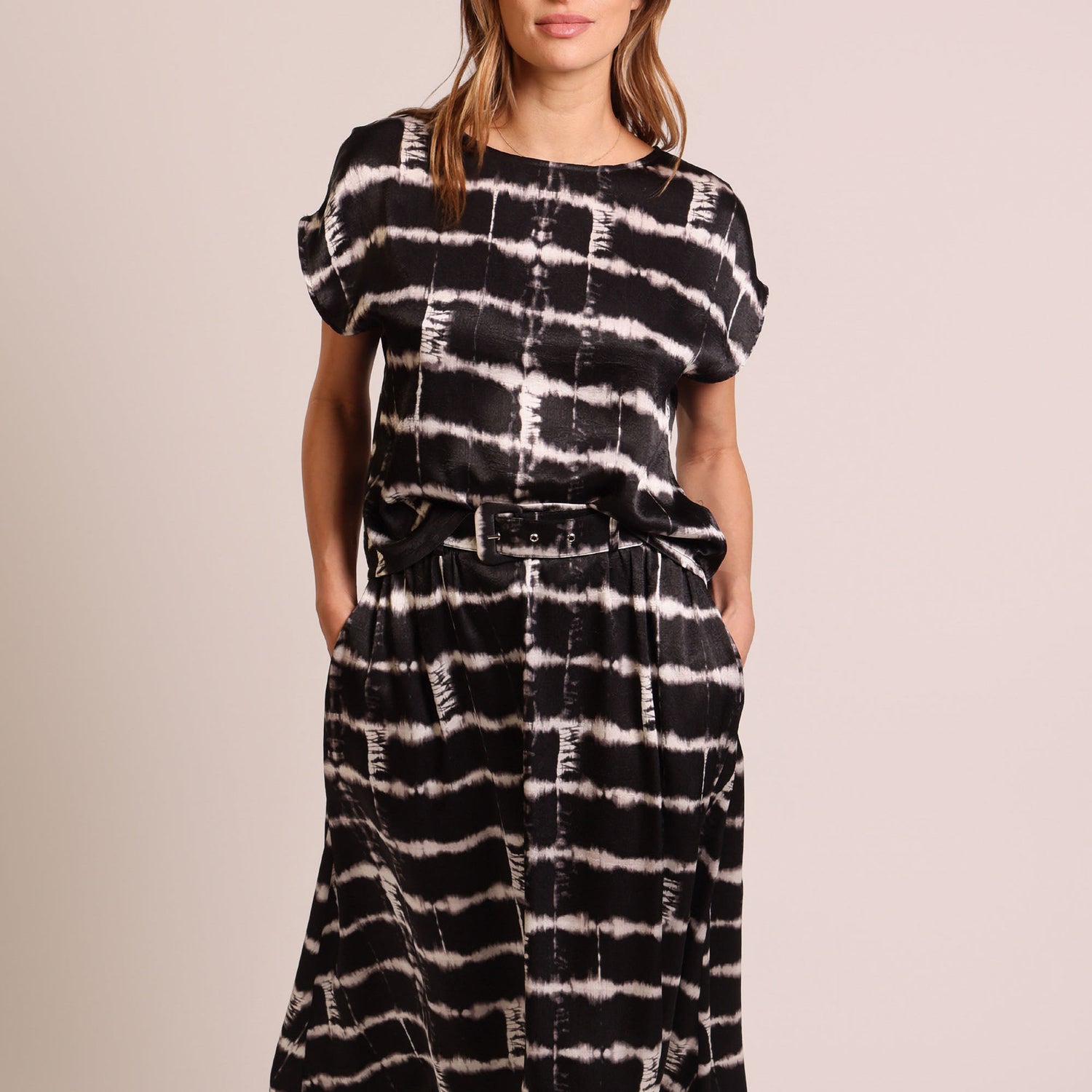 The Grace is an effortlessly elegant slouchy short-sleeve top, updated with a fresh touch, its slightly oversized fit and round neckline create a flattering shape, while the soft black fabric adds subtle shine for a look that’s both relaxed and refined.