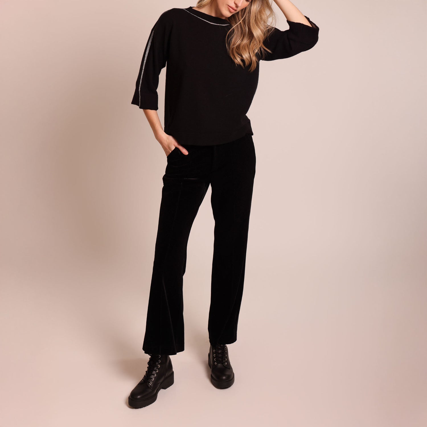 Simple, cool, and effortlessly versatile. This sleek black knit jersey is perfect for dressing up or down—pair it with jeans for a casual vibe or tuck it into a black skirt and heels for a polished look.