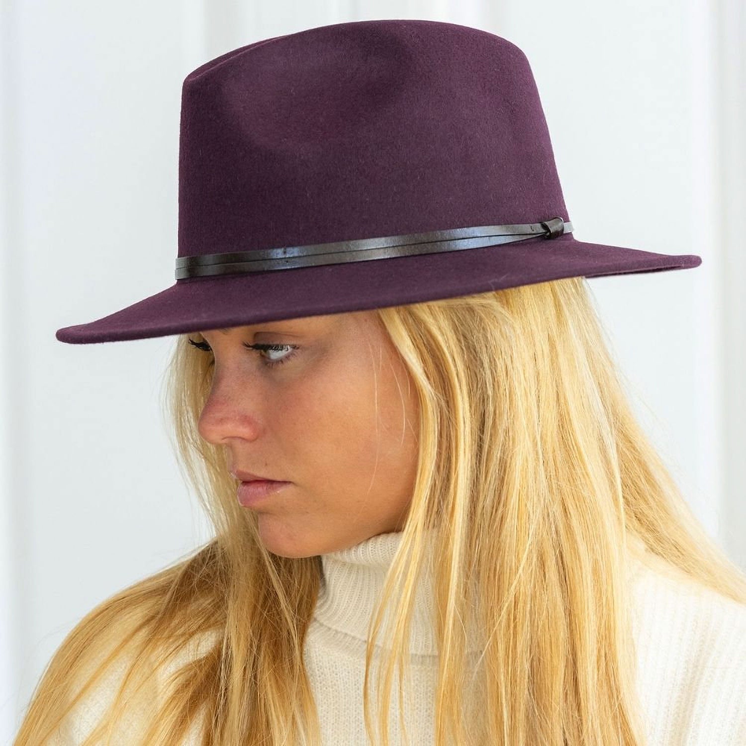 Elevate your look with the refined charm of the TRAVAUX EN COURS Felt Fedora in Plum. Crafted from 100% wool felt, this structured fedora features a rich, deep hue and is accented by a sleek, thin black leather band for a subtle yet sophisticated finish.