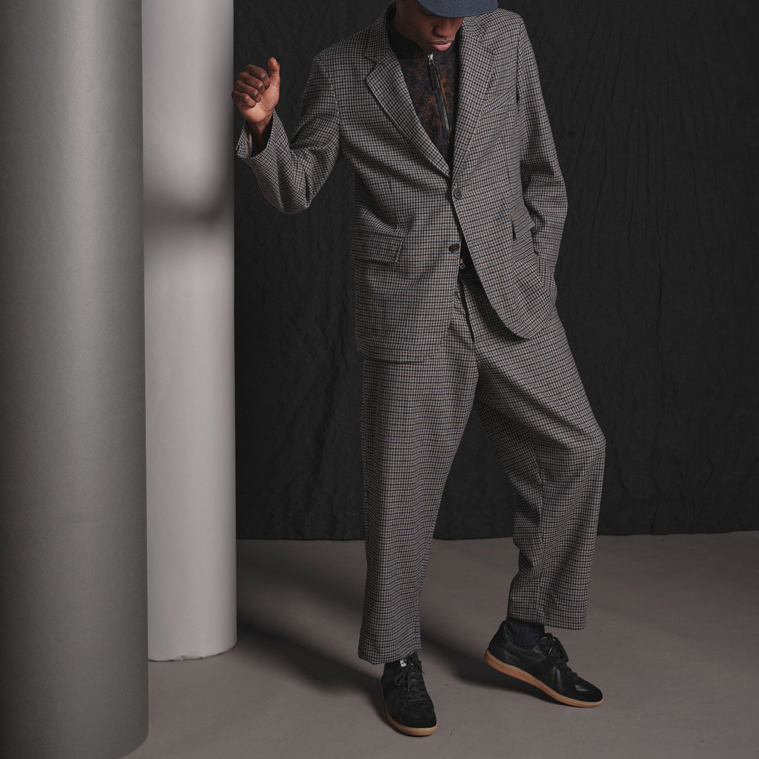 Cut from a medium-weight, three-colour houndstooth tweed in a substantial wool blend, the fabric is softly brushed for a warm, comfortable hand-feel. Classic tailoring meets easy, unisex wear.