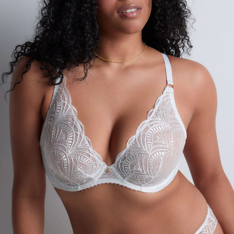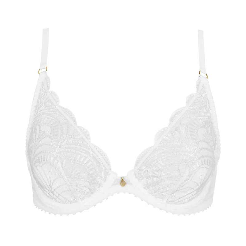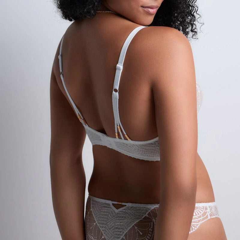 Creating a very seductive deep cleavage, the Vibes underwired triangle bra structures the bust with sexy, boho-style embroidery in an extremely modern and comfortable style. A gold charm glistens between the cups. The straps separate into multiple strands at the back for an unusual effect.