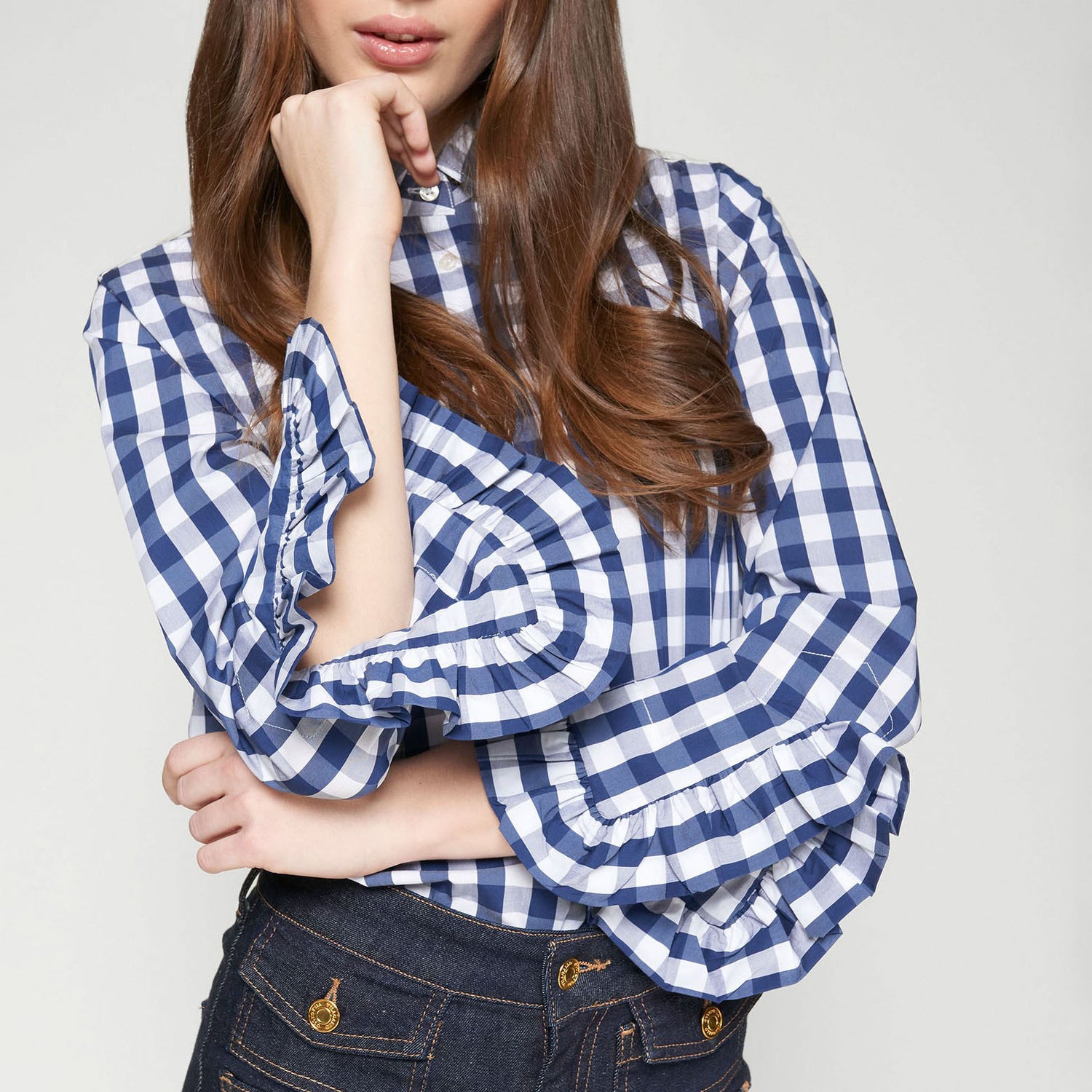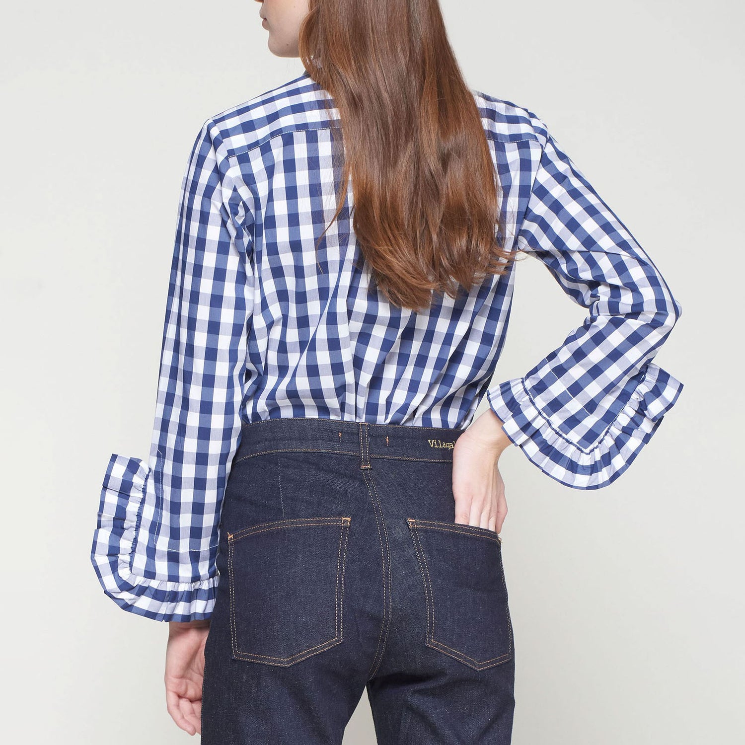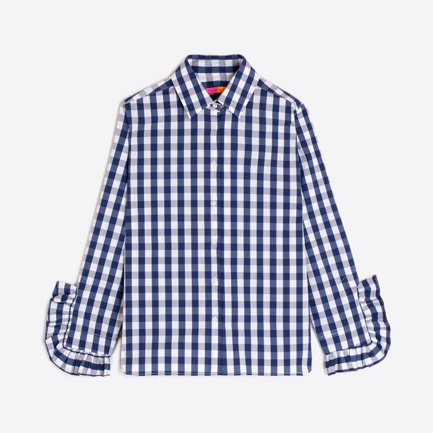A standout in navy and white vichy check, this shirt is one of lovely Cath’s favourites—and it’s easy to see why. Crafted from crisp, structured cotton that holds its shape beautifully, it features a classic pointed collar and front button fastening. The real statement: large, double ruffle cuffs that add a bold, feminine touch.