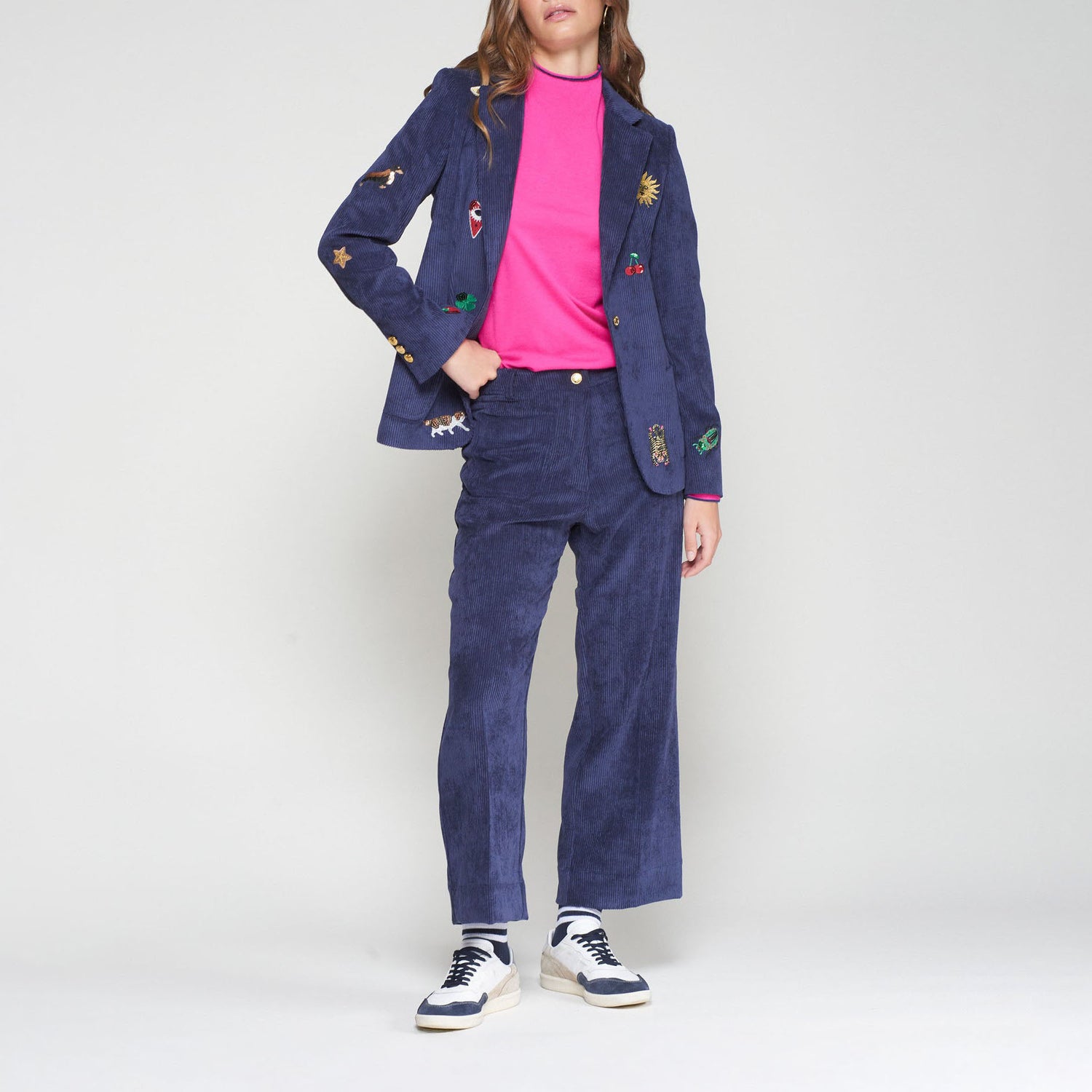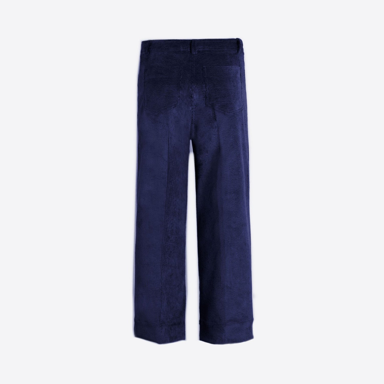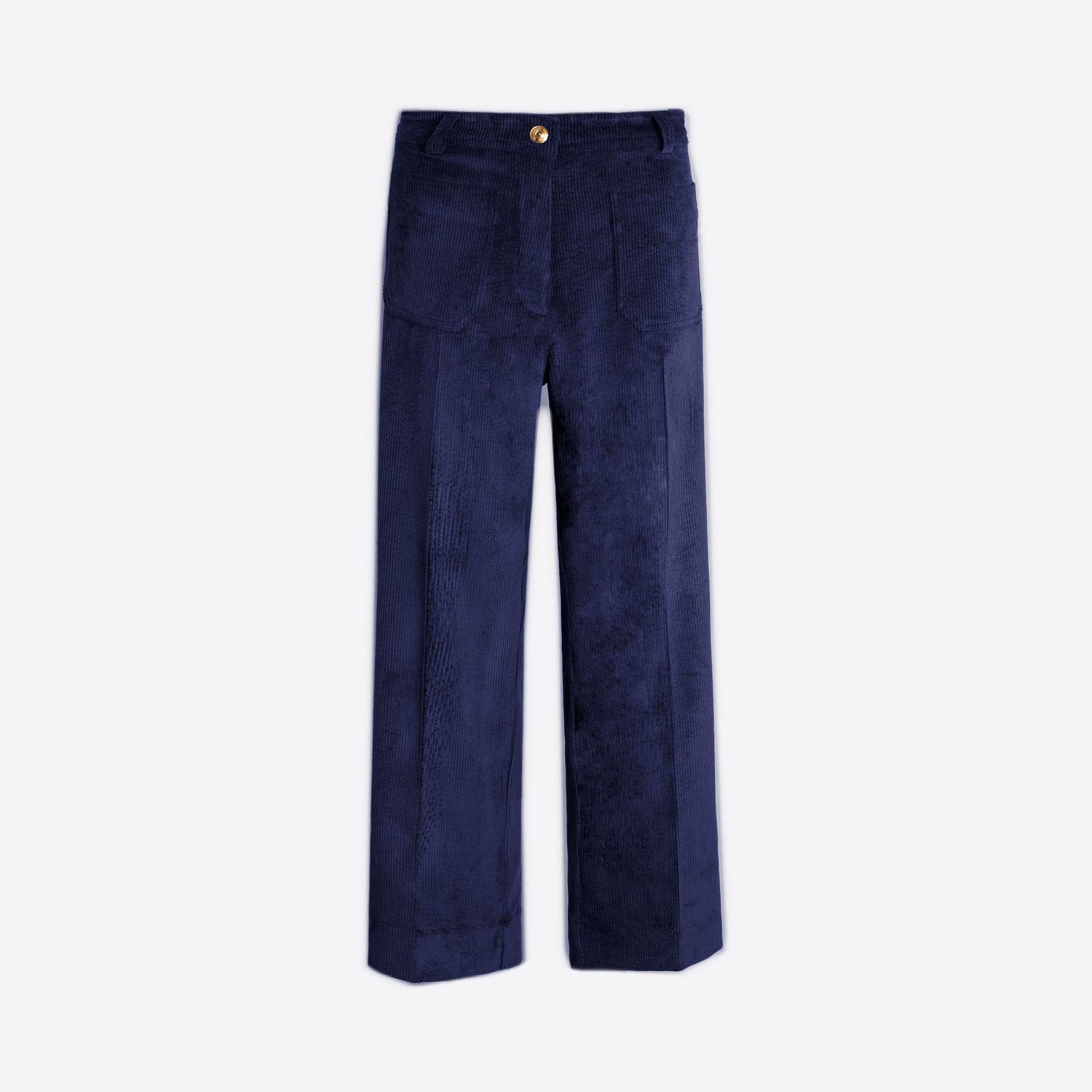 Wide-leg trousers in navy blue corduroy, designed with a mid-rise waist and full-length silhouette. Featuring a straight cut and front zip with button closure. Crafted from a comfortable stretch-blend fabric, making them a stylish and cosy choice for winter.