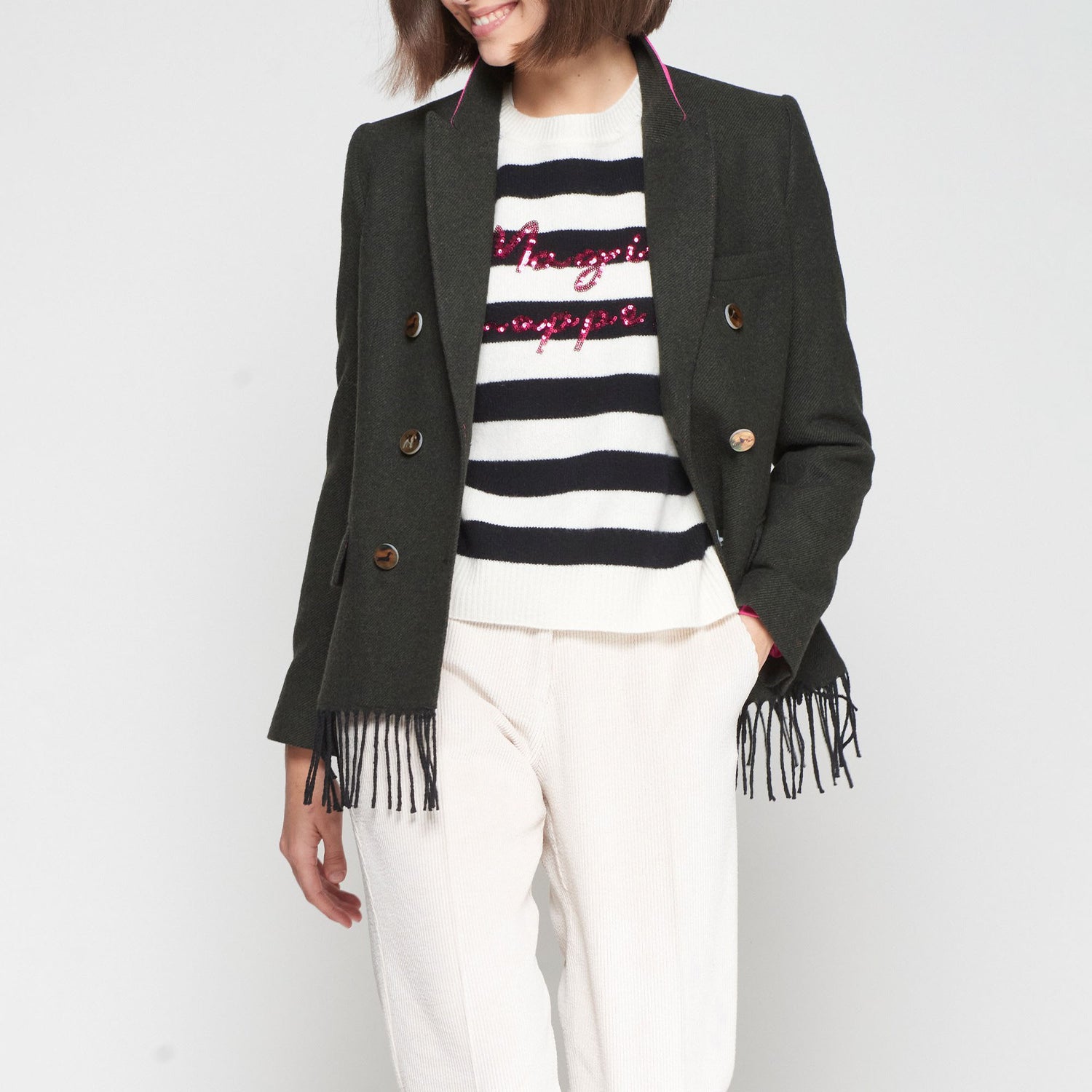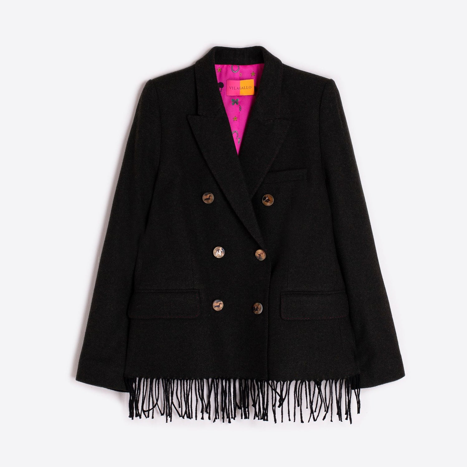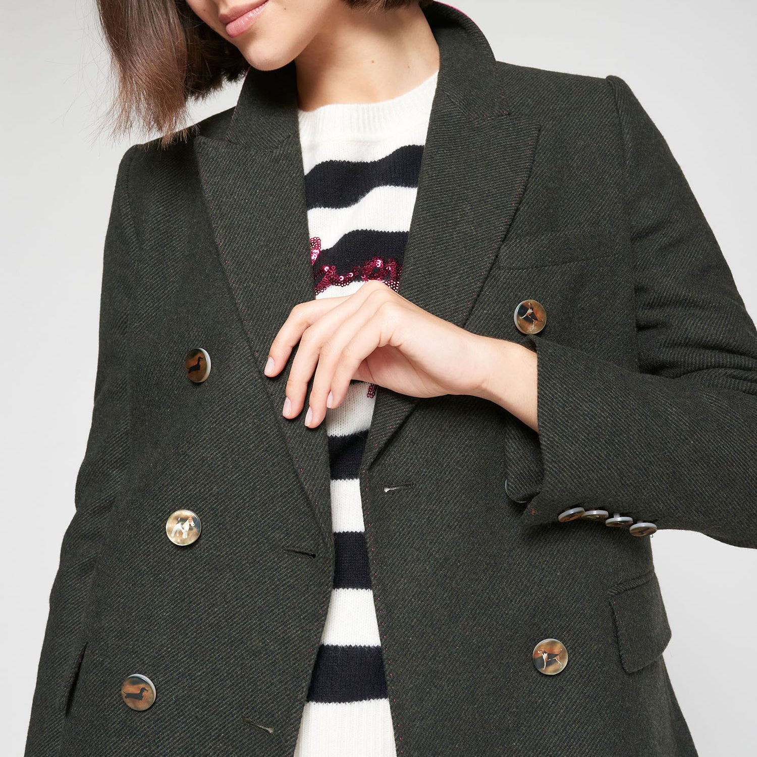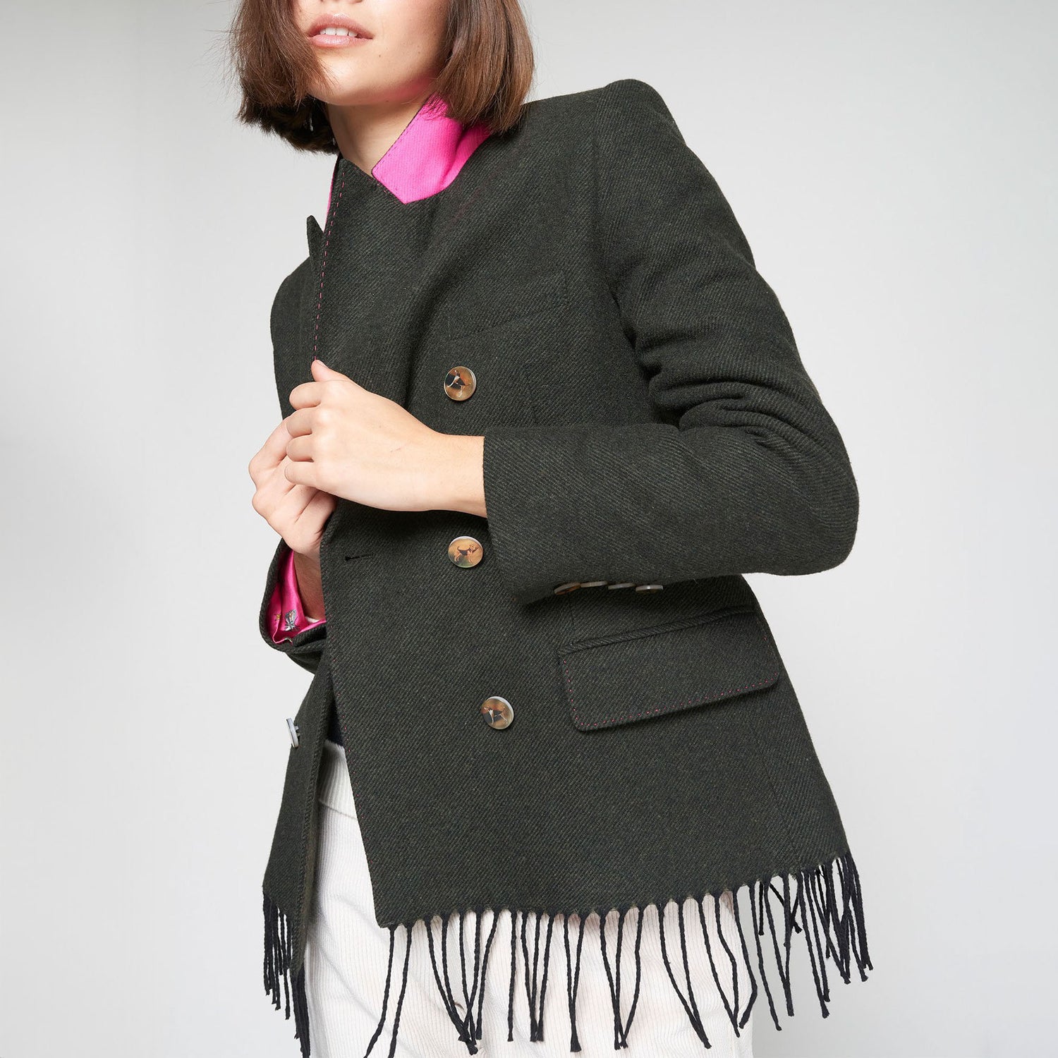 Double-breasted green loden blazer with a straight cut and long sleeves. The decorative buttons are adorned with illustrations of various dog breeds, adding a playful touch. Long fringes accent the bottom hem, while a bright pink lining adds contrast to the collar. Crafted from a structured wool-blend fabric, the design is finished with a front button closure and buttoned cuffs.