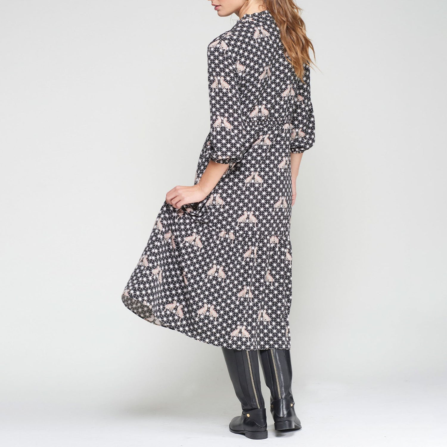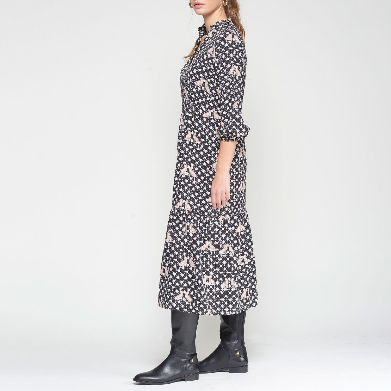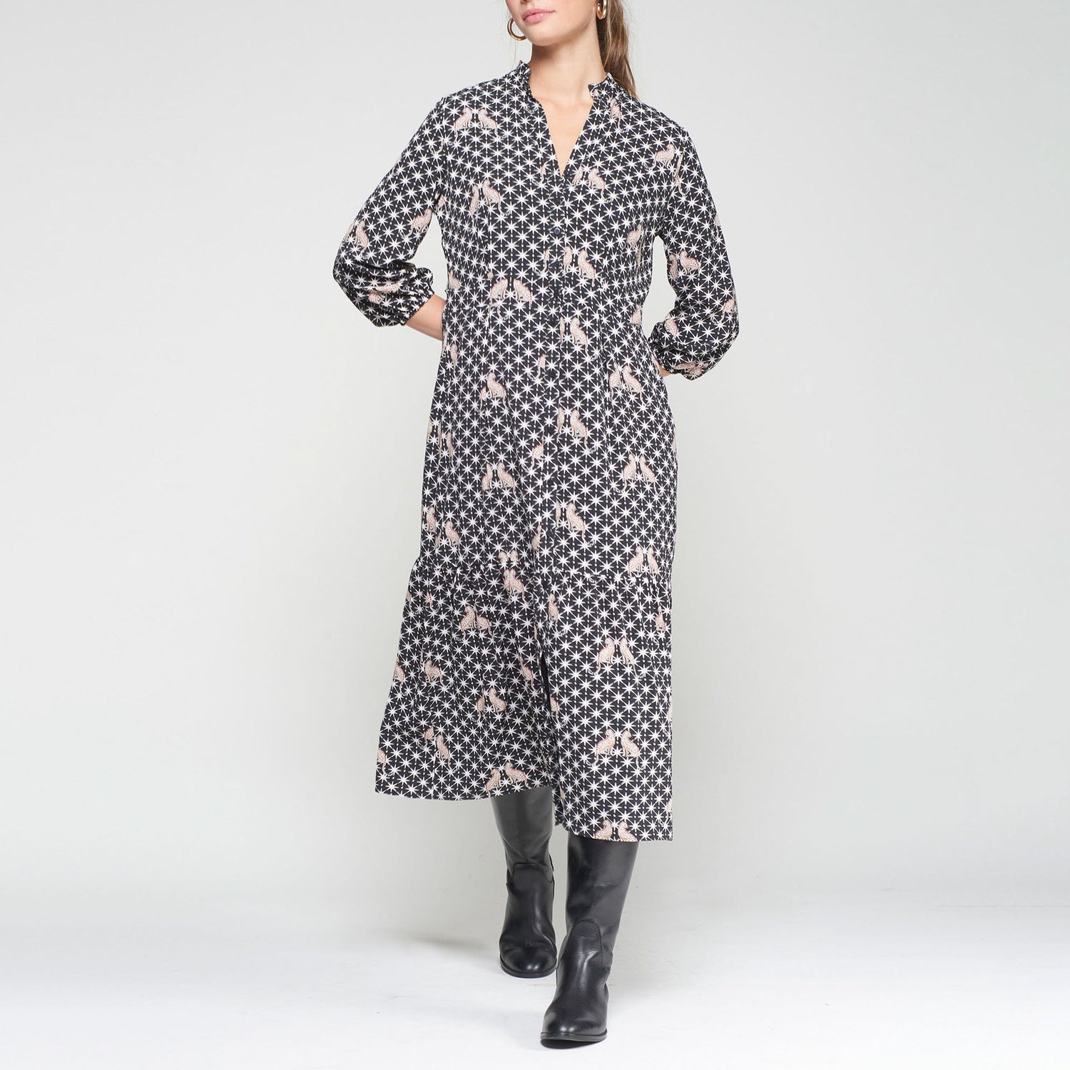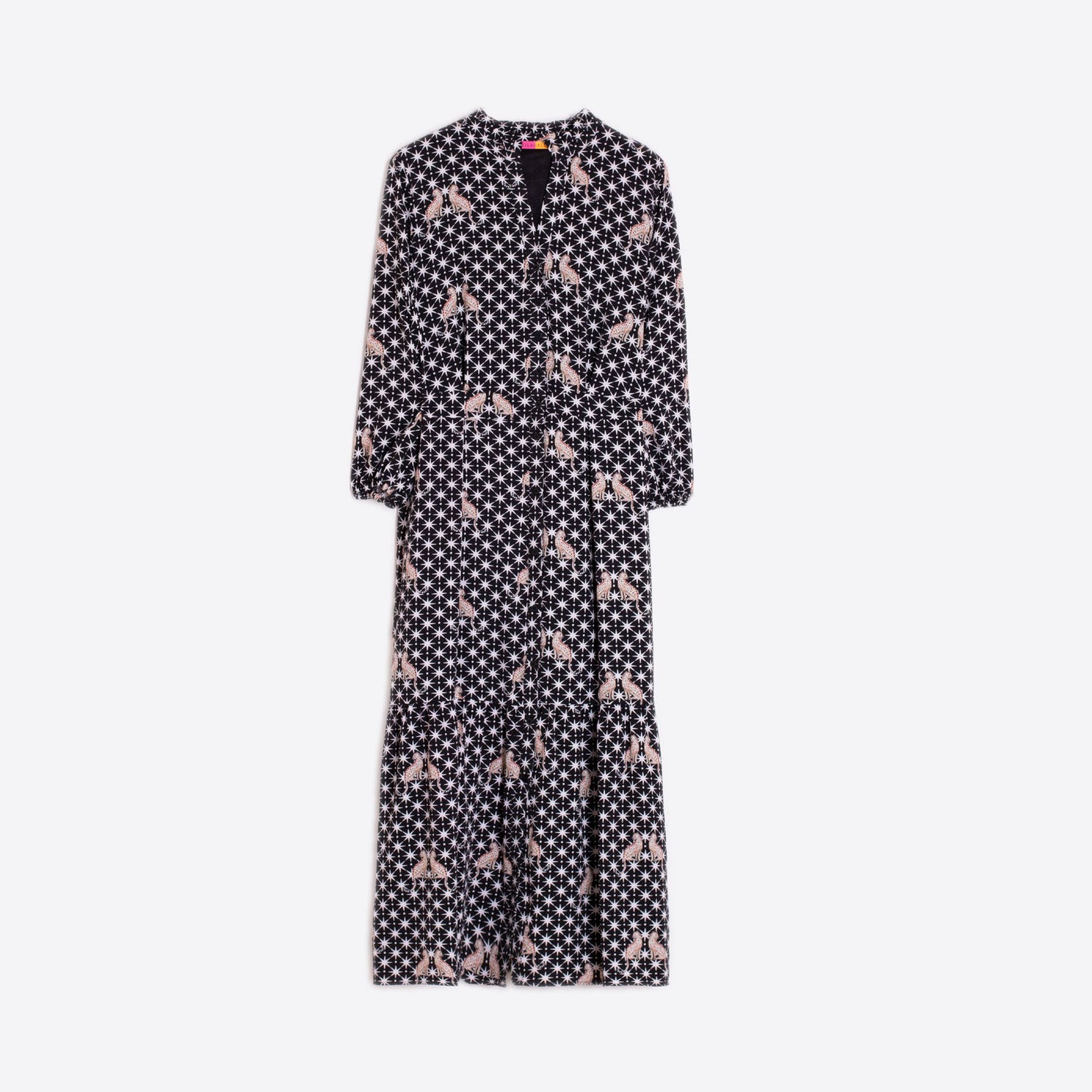 Long black dress featuring a white star print and leopard motifs. Designed with a V-neckline and stand-up collar, front button closure, and long sleeves. The flared, tiered skirt adds movement and elegance. Perfect for everyday wear or easily dressed up for special occasions.