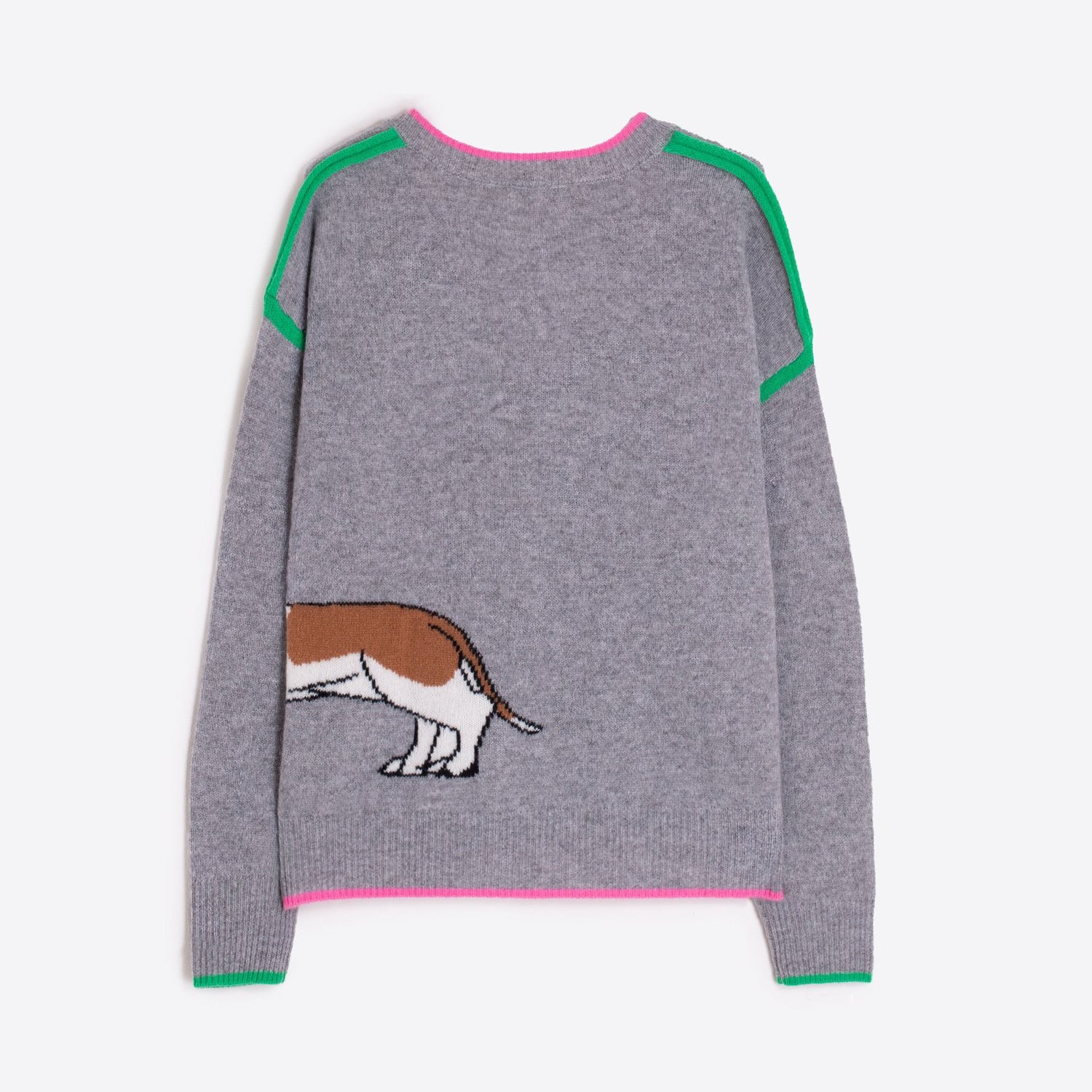 Grey wool knit sweater featuring an intarsia dachshund design on both sides. V-neckline trimmed in pink, with green accent stripes on shoulders and cuffs. Made from 100% wool with a soft touch and light structure. Straight cut with pink hem and natural drape.