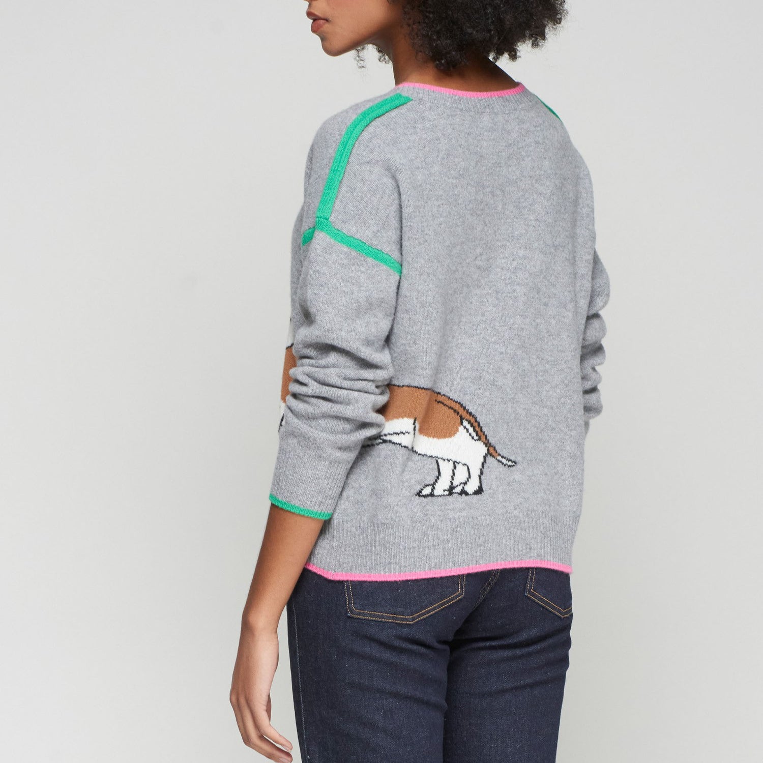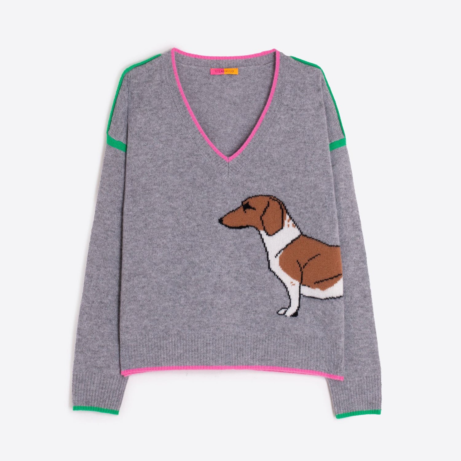Grey wool knit sweater featuring an intarsia dachshund design on both sides. V-neckline trimmed in pink, with green accent stripes on shoulders and cuffs. Made from 100% wool with a soft touch and light structure. Straight cut with pink hem and natural drape.