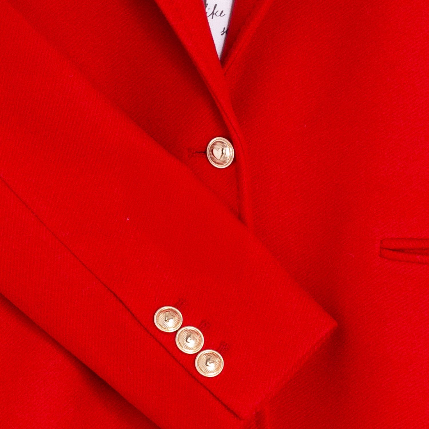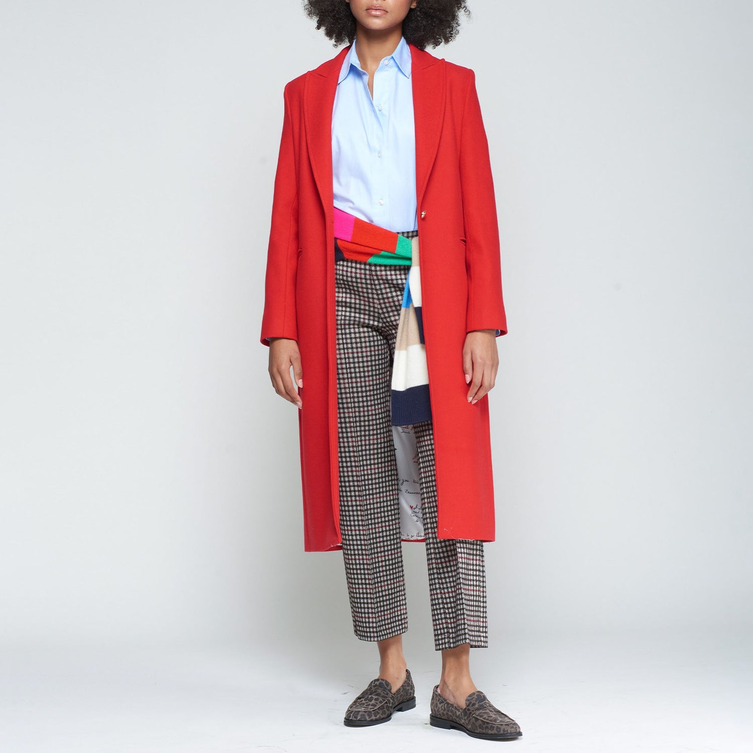 Long red wool coat with a tailored straight cut and classic lapels. Features a single-button front closure and side pockets. The interior is lined with an exclusive printed fabric. Crafted from a warm, structured blend.