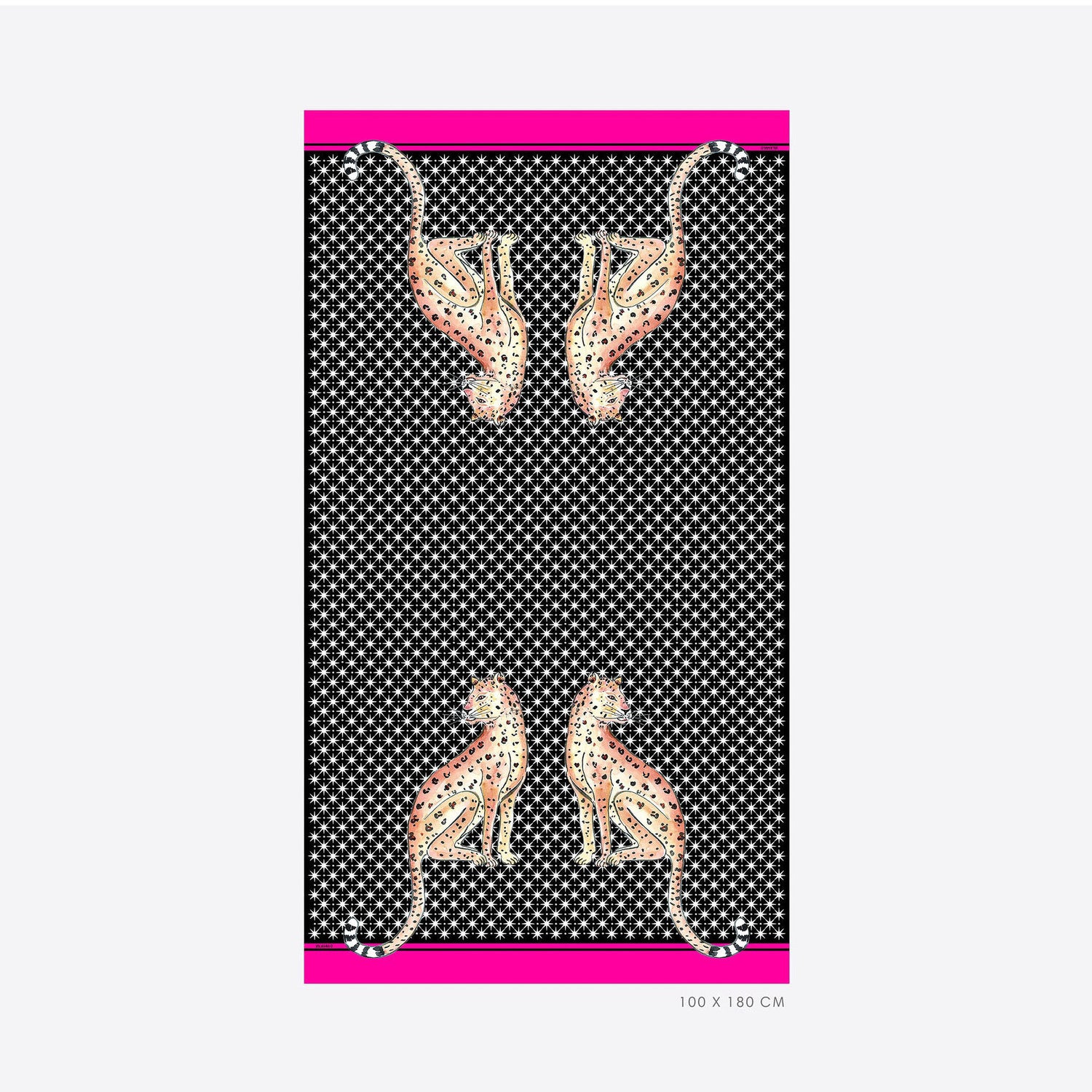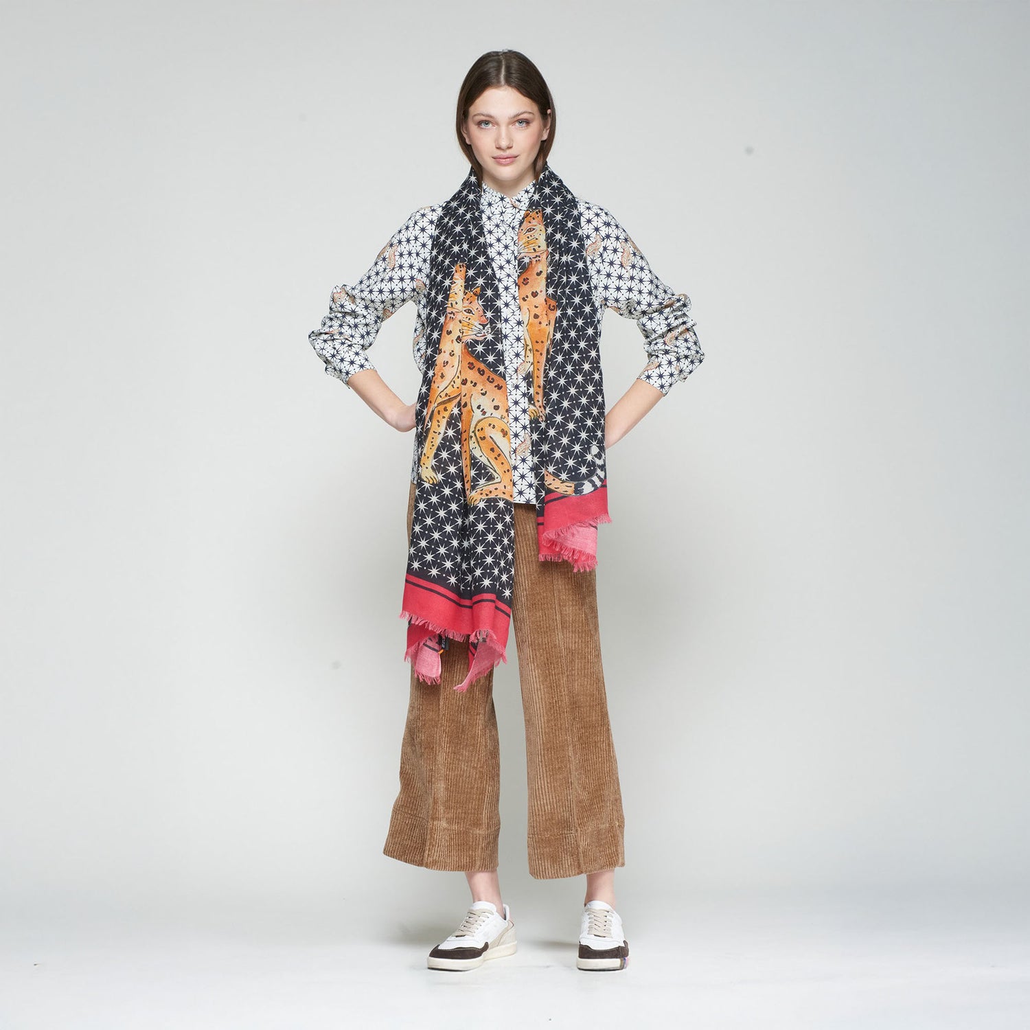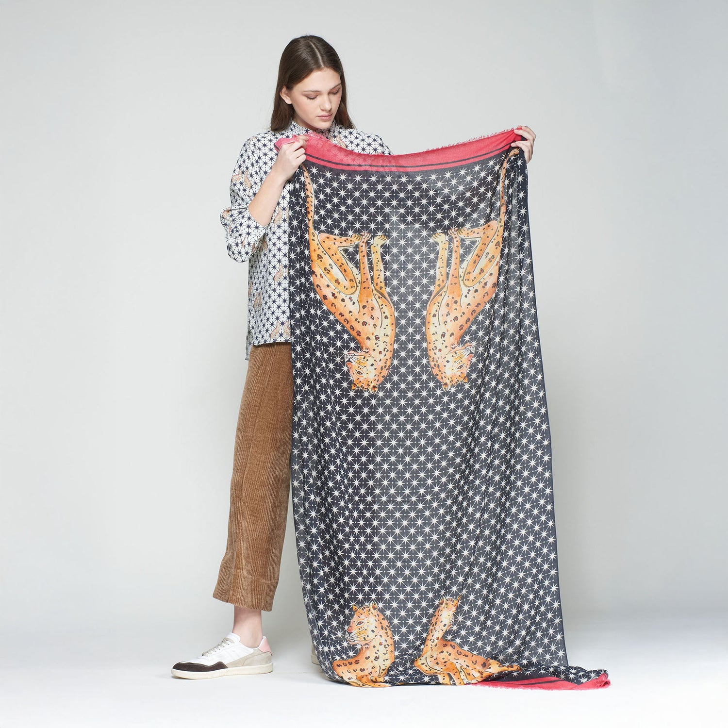 Rectangular foulard in dark blue with white stars and orange leopard motifs. Lightweight fabric with fringed edges. Cotton, modal and wool blend.